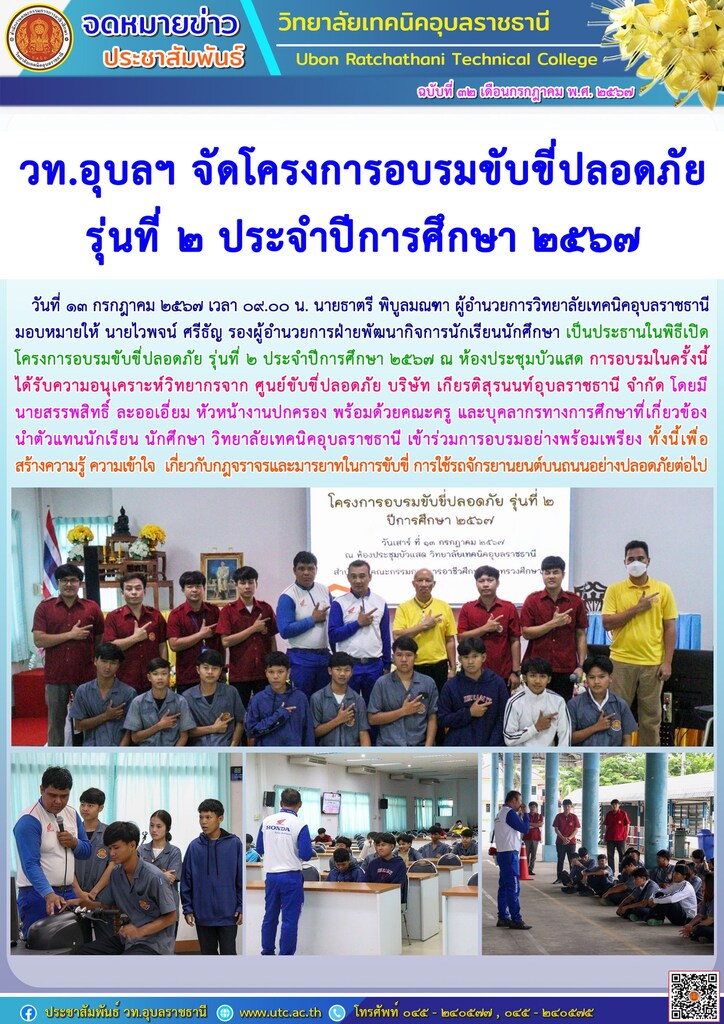 วันที่ ๑๓ กรกฎาคม ๒๕๖๗ เวลา ๐๙.๐๐ น. นายธาตรี พิบูลมณฑา ผู้อำนวยการวิทยาลัยเทคนิคอุบลราชธานี มอบหมายให้ นายไวพจน์ ศรีธัญ รองผู้อำนวยการฝ่ายพัฒนากิจการนักเรียนนักศึกษา เป็นประธานในพิธีเปิดโครงการอบรมขับขี่ปลอดภัย รุ่นที่ ๒ ประจำปีการศึกษา ๒๕๖๗ ณ ห้องประชุมบัวแสด การอบรมในครั้งนี้ได้รับความอนุเคราะห์วิทยากรจาก ศูนย์ขับขี่ปลอดภัย บริษัท เกียรติสุรนนท์อุบลราชธานี จำกัด โดยมี นายสรรพสิทธิ์ ละออเอี่ยม หัวหน้างานปกครอง พร้อมด้วยคณะครู และบุคลากรทางการศึกษาที่เกี่ยวข้อง นำตัวแทนนักเรียน นักศึกษา วิทยาลัยเทคนิคอุบลราชธานี เข้าร่วมการอบรมอย่างพร้อมเพรียง ทั้งนี้เพื่อสร้างความรู้ ความเข้าใจ เกี่ยวกับกฎจราจรและมารยาทในการขับขี่ การใช้รถจักรยานยนต์บนถนนอย่างปลอดภัยต่อไป