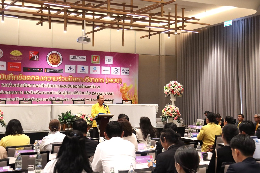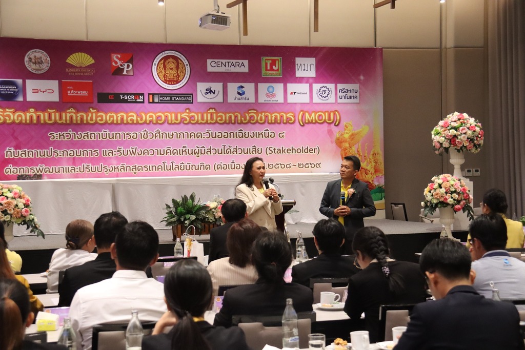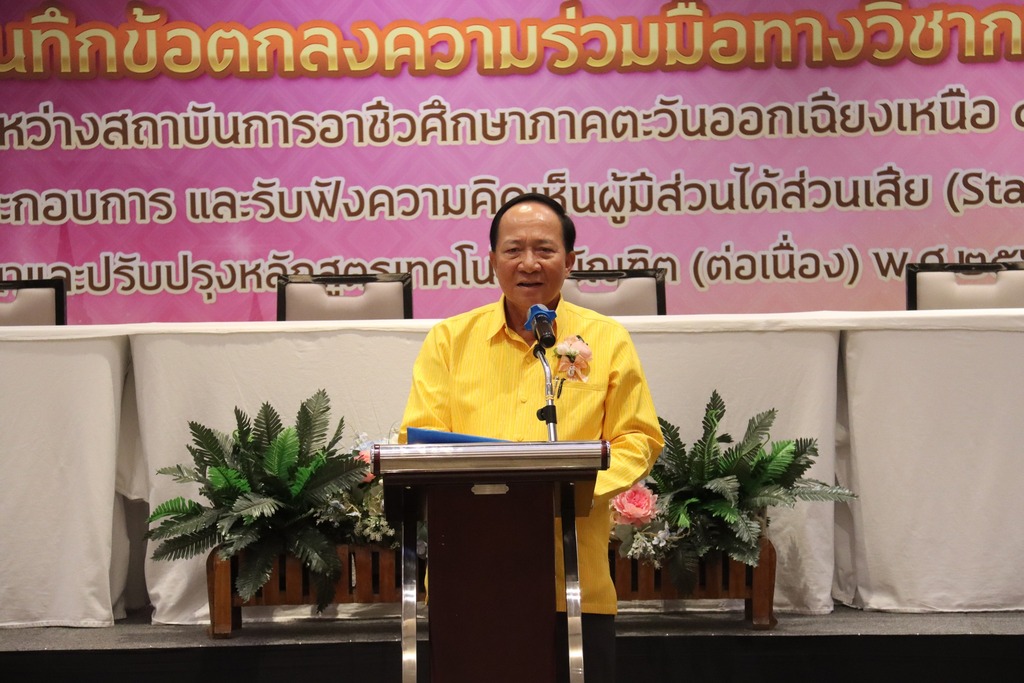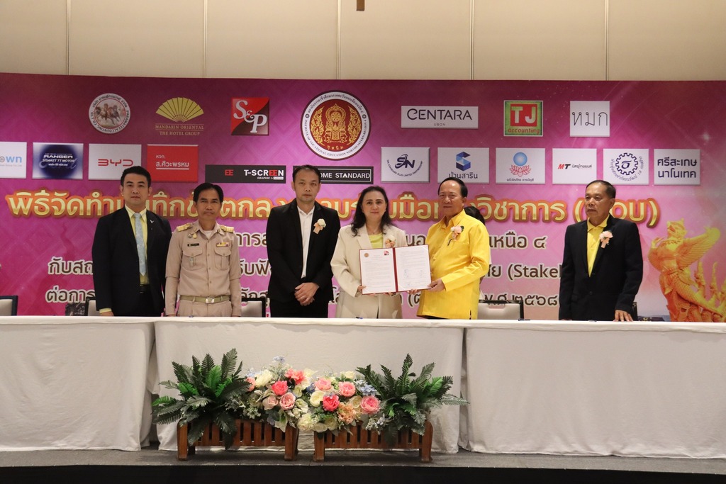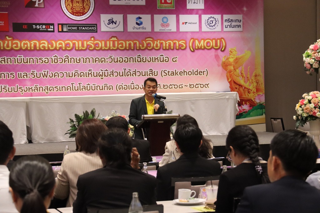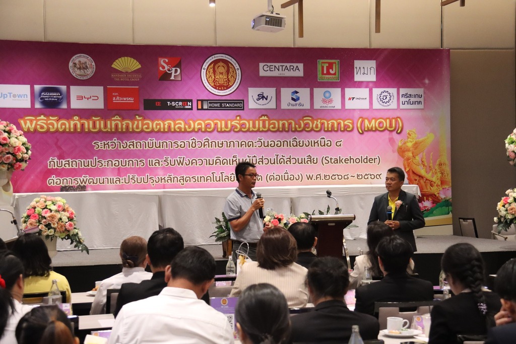 วันที่ ๑๖ กรกฎาคม ๒๕๖๗ เวลา ๐๘.๐๐ น. นายประดิษฐ์ พาชื่น ผู้อำนวยการสถาบันการอาชีวศึกษาภาคตะวันออกเฉียงเหนือ ๔ ให้เกียรติเป็นประธานในพิธีจัดทำบันทึกข้อตกลงความร่วมมือทางวิชาการ (MOU) ระหว่างสถาบันการอาชีวศึกษาภาคตะวันออกเฉียงเหนือ ๔ กับสถานประกอบการ และรับฟังความคิดเห็นผู้มีส่วนได้ส่วนเสีย (Stakeholder) ต่อการพัฒนาและปรับปรุงหลักสูตรเทคโนโลยีบัณฑิต (ต่อเนื่อง) พ.ศ. ๒๕๖๘ – ๒๕๖๙ ณ โรงแรมเซ็นทารา อุบล อำเภอเมือง จังหวัดอุบลราชธานี ในการนี้มี นายชุมสันติ แสนทวีสุข ผู้อำนวยการอาชีวศึกษาบัณฑิต เป็นผู้กล่าวรายงาน และมีนายลิขิต พลเหลา นายวินัย จันทรเกษม รองผู้อำนวยการสถาบันการอาชีวศึกษาภาคตะวันออกเฉียงเหนือ ๔ นายธาตรี พิบูลมณฑา ผู้อำนวยการวิทยาลัยเทคนิคอุบลราชธานี ปฏิบัติหน้าที่ ผู้อำนวยการสำนักงานอาชีวศึกษาจังหวัดอุบลราชธานี ให้เกียรติเข้าร่วมพิธีเปิด และร่วมลงนามข้อตกลงความร่วมมือทางวิชาการ (MOU) โดยมี สถานประกอบการทั้ง ๑๖ แห่ง เข้าร่วมพิธีลงนามในครั้งนี้ ทั้งนี้มี นายไวพจน์ ศรีธัญ รองผู้อำนวยการฝ่ายพัฒนากิจการนักเรียนนักศึกษา นายสุวิชา มั่นยืน รองผู้อำนวยการฝ่ายวิชาการ นางราตรี สะดีวงศ์ รองผู้อำนวยการฝ่ายแผนงานและความร่วมมือ นางสาวสายฝน สาระผล รองผู้อำนวยการฝ่ายบริหารทรัพยากร ว่าที่ ร.ต.กรีฑาวุฒิ ทนงจิตร หัวหน้างานความร่วมมือ พร้อมด้วยคณะผู้บริหาร ครู และบุคลากรทางการศึกษา ในสังกัดสถาบันการอาชีวศึกษาภาคตะวันออกเฉียงเหนือ ๔ เข้าร่วมพิธีอย่างพร้อมเพรียง