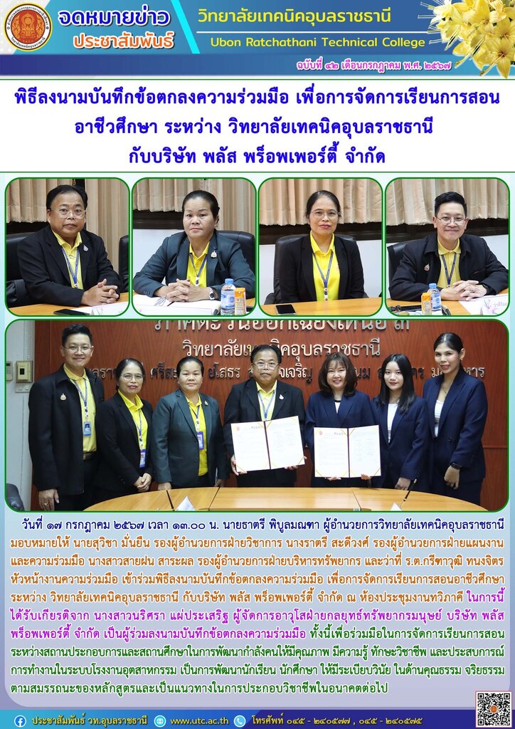 วันที่ ๑๗ กรกฎาคม ๒๕๖๗ เวลา ๑๓.๐๐ น. นายธาตรี พิบูลมณฑา ผู้อำนวยการวิทยาลัยเทคนิคอุบลราชธานี มอบหมายให้ นายสุวิชา มั่นยืน รองผู้อำนวยการฝ่ายวิชาการ นางราตรี สะดีวงศ์ รองผู้อำนวยการฝ่ายแผนงานและความร่วมมือ นางสาวสายฝน สาระผล รองผู้อำนวยการฝ่ายบริหารทรัพยากร และว่าที่ ร.ต.กรีฑาวุฒิ ทนงจิตร หัวหน้างานความร่วมมือ เข้าร่วมพิธีลงนามบันทึกข้อตกลงความร่วมมือ เพื่อการจัดการเรียนการสอนอาชีวศึกษา ระหว่าง วิทยาลัยเทคนิคอุบลราชธานี กับบริษัท พลัส พร็อพเพอร์ตี้ จำกัด ณ ห้องประชุมงานทวิภาคี วิทยาลัยเทคนิคอุบลราชธานี ในการนี้ได้รับเกียรติจาก นางสาวนริศรา แผ่ประเสริฐ ผู้จัดการอาวุโสฝ่ายกลยุทธ์ทรัพยากรมนุษย์ บริษัท พลัส พร็อพเพอร์ตี้ จำกัด เป็นผู้ร่วมลงนามบันทึกข้อตกลงความร่วมมือ ทั้งนี้เพื่อร่วมมือในการจัดการเรียนการสอน ระหว่างสถานประกอบการและสถานศึกษาในการพัฒนากำลังคนให้มีคุณภาพ มีความรู้ ทักษะวิชาชีพ และประสบการณ์การทำงานในระบบโรงงานอุตสาหกรรม เป็นการพัฒนานักเรียน นักศึกษา ให้มีระเบียบวินัย ในด้านคุณธรรม จริยธรรม ตามสมรรถนะของหลักสูตรและเป็นแนวทางในการประกอบวิชาชีพในอนาคตต่อไป