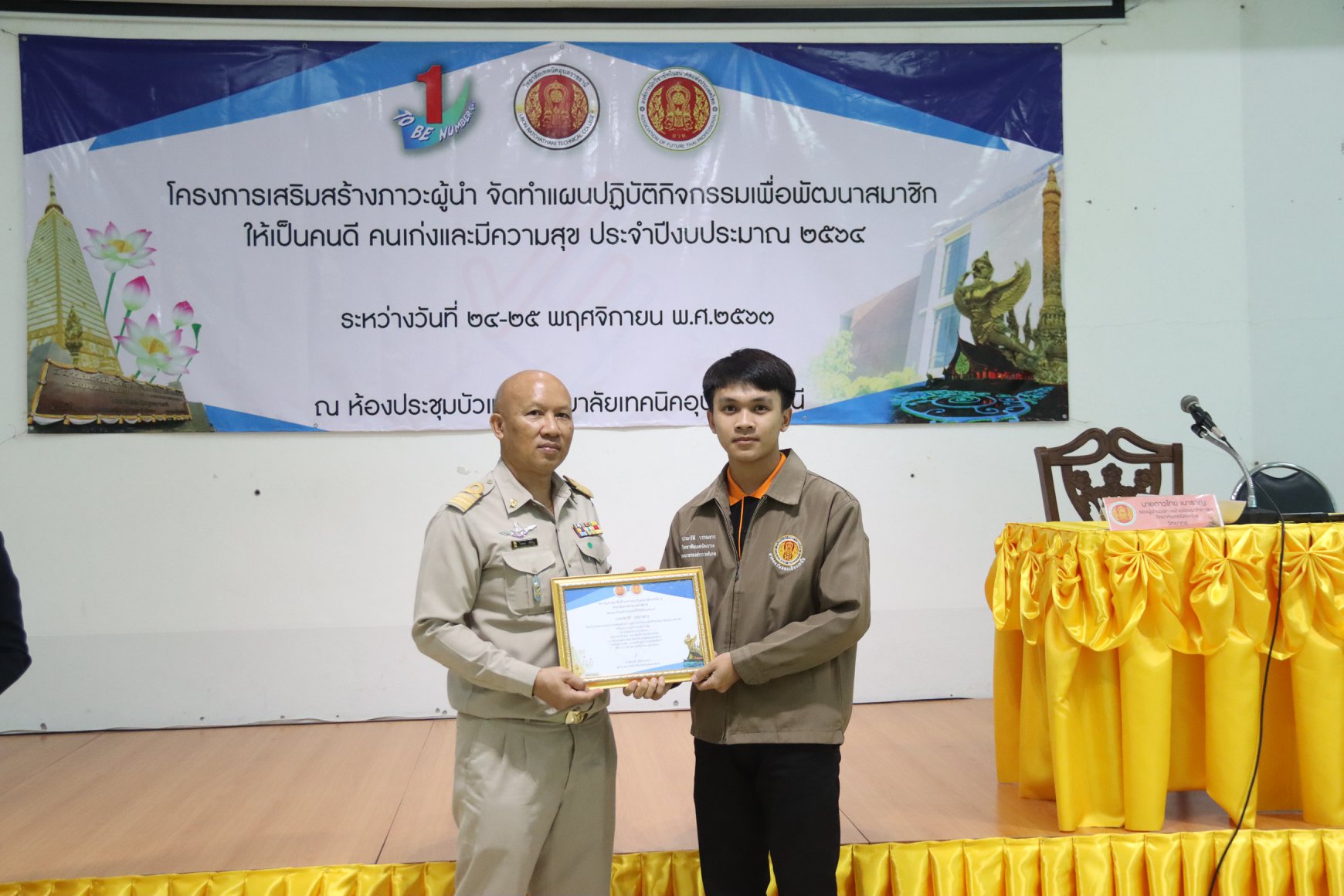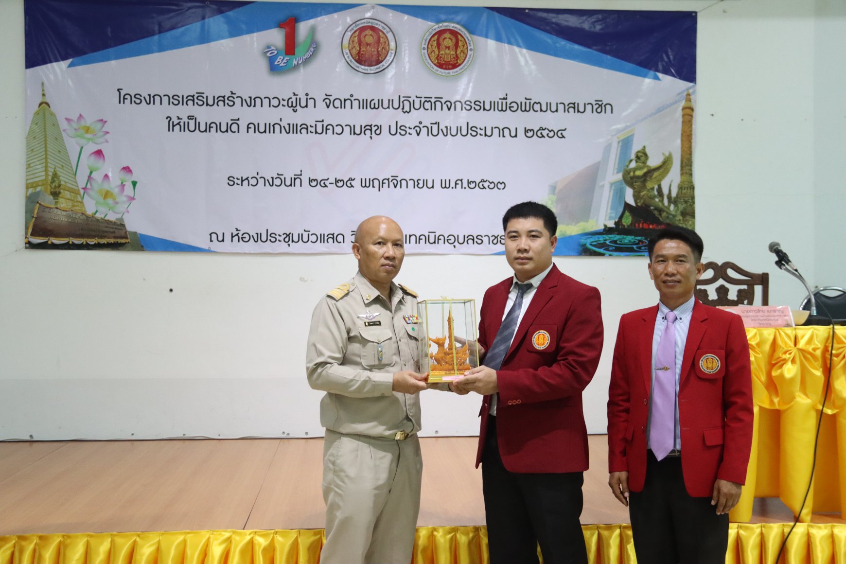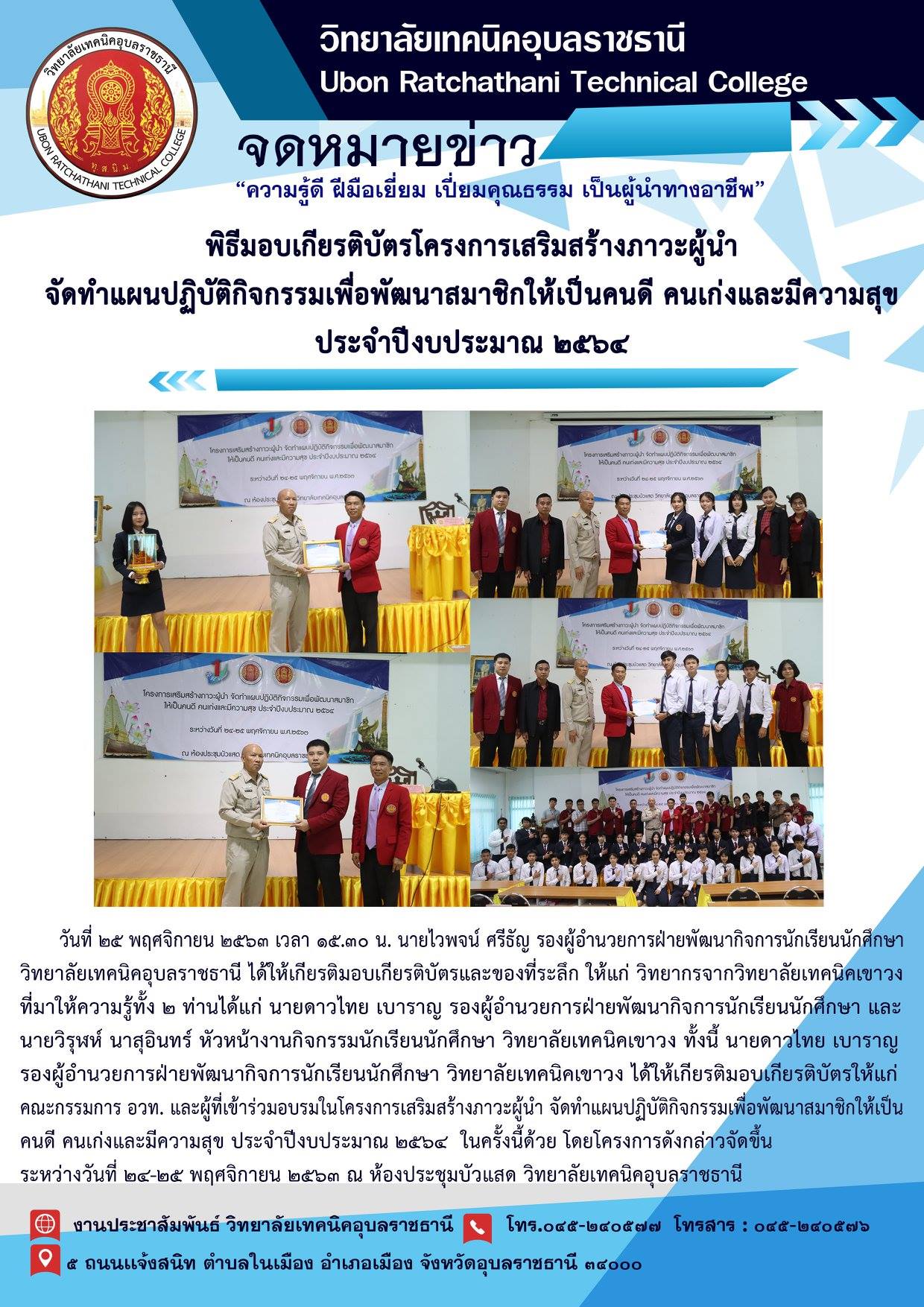 นายไวพจน์ ศรีธัญ รองผู้อำนวยการฝ่ายพัฒนากิจการนักเรียนนักศึกษา วิทยาลัยเทคนิคอุบลราชธานี ได้ให้เกียรติมอบเกียรติบัตรและของที่ระลึก ให้แก่
