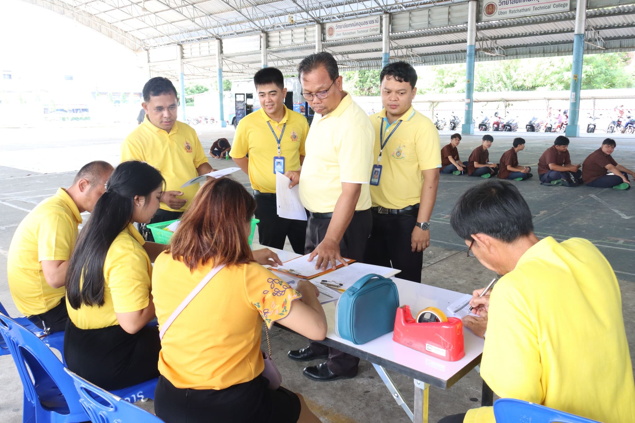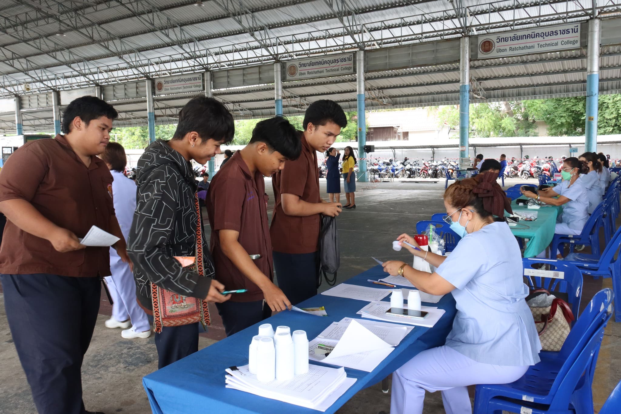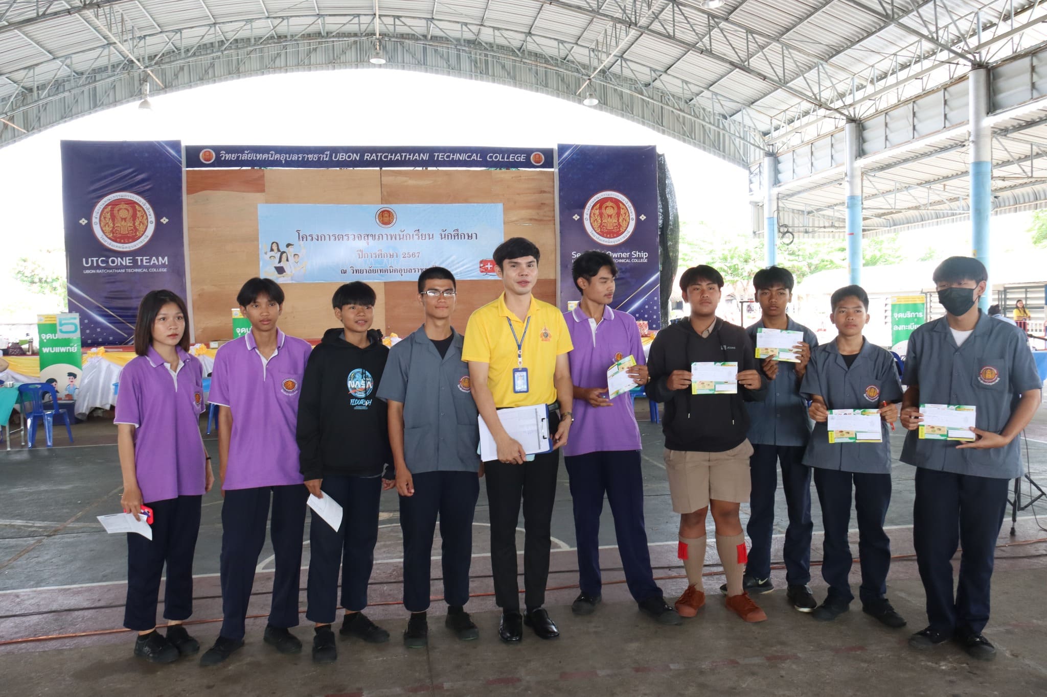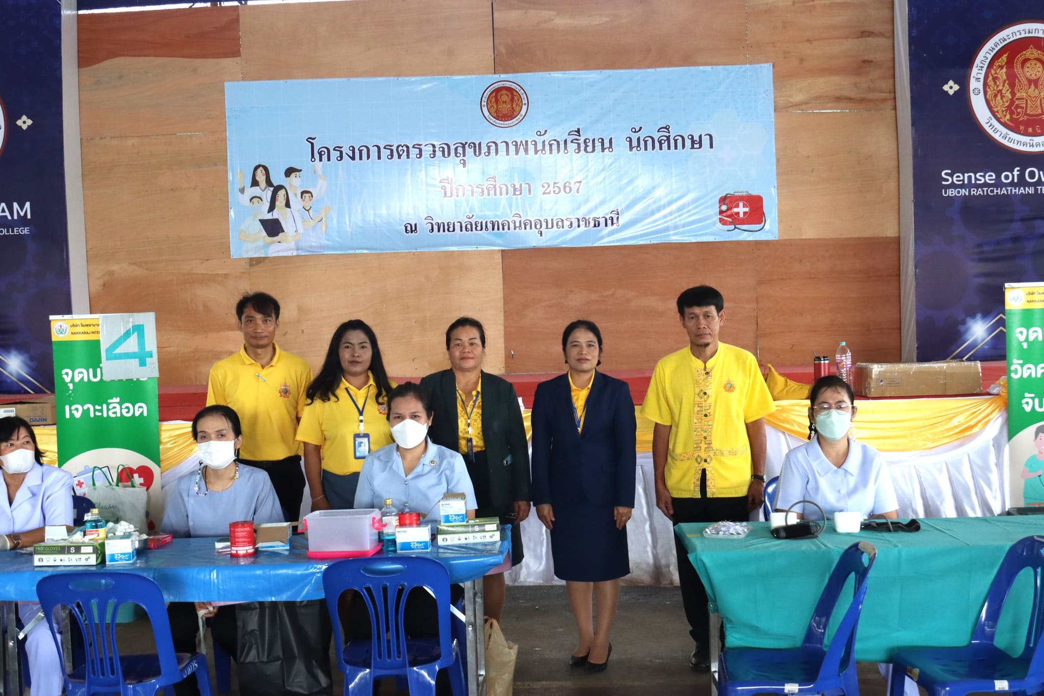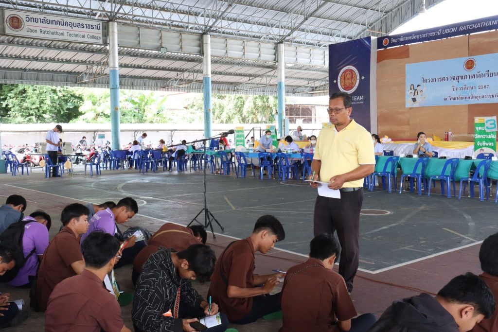 วันที่ ๒๔ กรกฎาคม ๒๕๖๗ เวลา ๐๘.๓๐ น. นายธาตรี พิบูลมณฑา ผู้อำนวยการวิทยาลัยเทคนิคอุบลราชธานี ได้มอบหมายให้ นางราตรี สะดีวงศ์ รองผู้อำนวยการฝ่ายแผนงานและความร่วมมือ นางสาวสายฝน สาระผล รองผู้อำนวยการฝ่ายบริหารทรัพยากร และนางสุภัดสา ศิริชนะ หัวหน้างานสวัสดิการนักเรียนนักศึกษา นำคณะครู นักเรียน นักศึกษา เข้าร่วมโครงการตรวจสุขภาพนักเรียน นักศึกษา ครั้งที่ ๑ ประจำปีการศึกษา ๒๕๖๗ ณ หอประชุมโดมใหญ่ วิทยาลัยเทคนิคอุบลราชธานี ซึ่งดำเนินการระหว่างเวลา ๐๘.๐๐ – ๑๖.๓๐ น. โดยได้รับความอนุเคราะห์คณะแพทย์ พยาบาล และเจ้าหน้าที่จาก บริษัท โรงพยาบาลนาคราช อินเตอร์เนชั่นแนล จำกัด มาให้บริการตรวจสุขภาพ ทั้งนี้มีคณะครู บุคลากรทางการศึกษา และนักเรียน นักศึกษา เข้าร่วมกิจกรรมอย่างพร้อมเพรียง