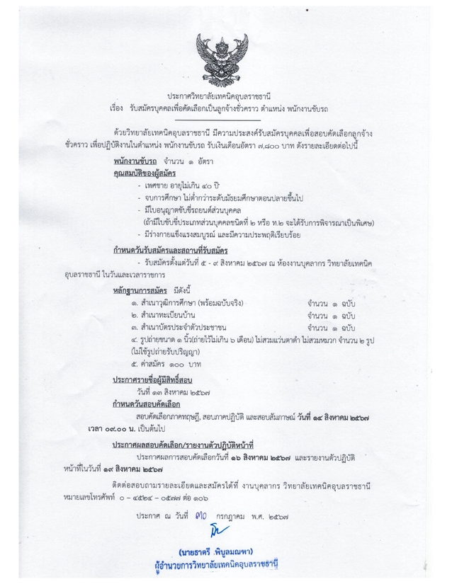 ด้วยวิทยาลัยเทคนิคอุบลราชธานี มีความประสงค์รับสมัครบุคคลเพื่อสอบคัดเลือกเป็นลูกจ้างชั่วคราว เพื่อปฏิบัติงานในตำแหน่ง พนักงานขับรถ รับเงินเดือนอัตรา 7,800 บาท