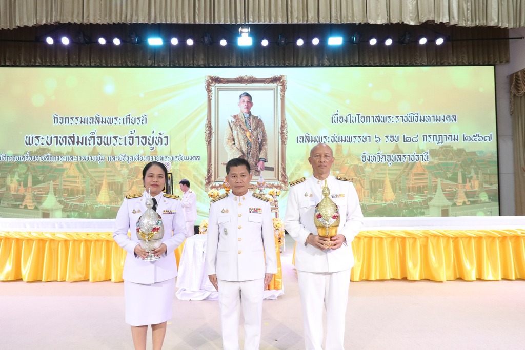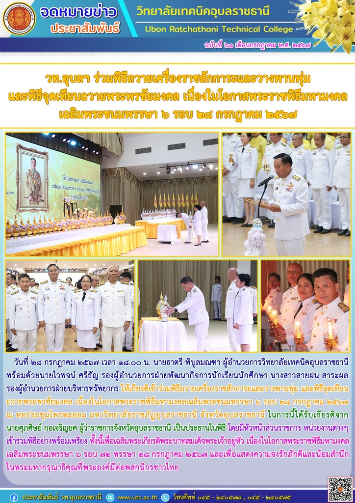 วันที่ ๒๘ กรกฎาคม ๒๕๖๗ เวลา ๑๘.๐๐ น. นายธาตรี พิบูลมณฑา ผู้อำนวยการวิทยาลัยเทคนิคอุบลราชธานี พร้อมด้วยนายไวพจน์ ศรีธัญ รองผู้อำนวยการฝ่ายพัฒนากิจการนักเรียนนักศึกษา นางสาวสายฝน สาระผล รองผู้อำนวยการฝ่ายบริหารทรัพยากร ให้เกียรติเข้าร่วมพิธีถวายเครื่องราชสักการะและวางพานพุ่ม และพิธีจุดเทียนถวายพระพรชัยมงคล เนื่องในโอกาสพระราชพิธีมหามงคลเฉลิมพระชนมพรรษา ๖ รอบ ๒๘ กรกฎาคม ๒๕๖๗ ณ หอประชุมไพรพะยอม มหาวิทยาลัยราชภัฏอุบลราชธานี จังหวัดอุบลราชธานี ในการนี้ได้รับเกียรติจาก นายศุภศิษย์ กอเจริญยศ ผู้ว่าราชการจังหวัดอุบลราชธานี เป็นประธานในพิธี โดยมีหัวหน้าส่วนราชการ หน่วยงานต่างๆ เข้าร่วมพิธีอย่างพร้อมเพรียง ทั้งนี้เพื่อเฉลิมพระเกียรติพระบาทสมเด็จพระเจ้าอยู่หัว เนื่องในโอกาสพระราชพิธีมหามงคลเฉลิมพระชนมพรรษา ๖ รอบ ๗๒ พรรษา ๒๘ กรกฎาคม ๒๕๖๗ และเพื่อแสดงความจงรักภักดีและน้อมสำนึกในพระมหากรุณาธิคุณที่พระองค์มีต่อพสกนิกรชาวไทย