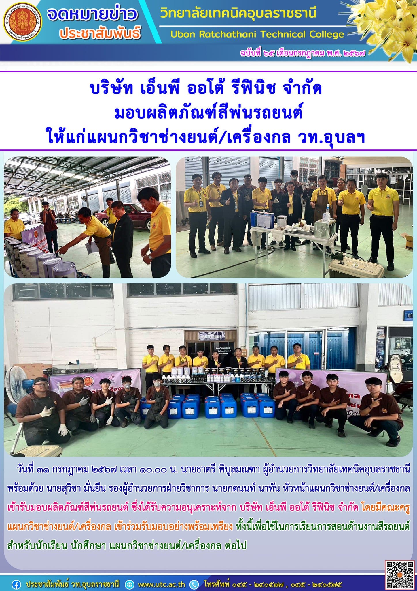 วันที่ ๓๑ กรกฎาคม ๒๕๖๗ เวลา ๑๐.๐๐ น. นายธาตรี พิบูลมณฑา ผู้อำนวยการวิทยาลัยเทคนิคอุบลราชธานี พร้อมด้วย นายสุวิชา มั่นยืน รองผู้อำนวยการฝ่ายวิชาการ นายกตนนท์ นาทัน หัวหน้าแผนกวิชาช่างยนต์/เครื่องกล เข้ารับมอบผลิตภัณฑ์สีพ่นรถยนต์ ซึ่งได้รับความอนุเคราะห์จาก บริษัท เอ็นพี ออโต้ รีฟินิช จำกัด โดยมีคณะครูแผนกวิชาช่างยนต์/เครื่องกล เข้าร่วมรับมอบอย่างพร้อมเพรียง ทั้งนี้เพื่อใช้ในการเรียนการสอนด้านงานสีรถยนต์สำหรับนักเรียน นักศึกษา แผนกวิชาช่างยนต์/เครื่องกล ต่อไป
