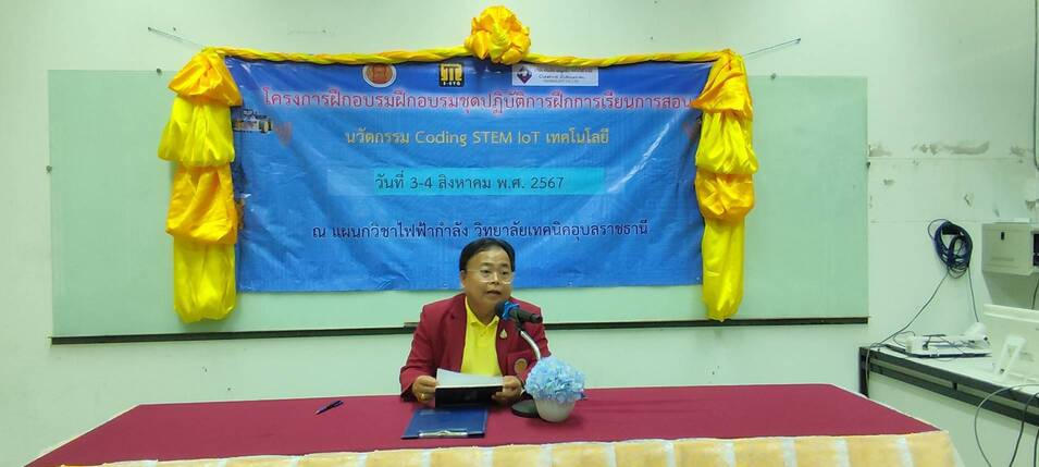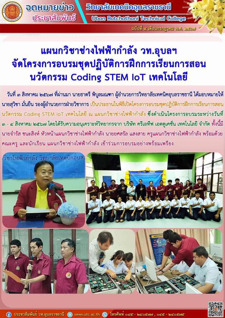 วันที่ ๓ สิงหาคม ๒๕๖๗ ที่ผ่านมา นายธาตรี พิบูลมณฑา ผู้อำนวยการวิทยาลัยเทคนิคอุบลราชธานี ได้มอบหมายให้ นายสุวิชา มั่นยืน รองผู้อำนวยการฝ่ายวิชาการ เป็นประธานในพิธีเปิดโครงการอบรมชุดปฏิบัติการฝึกการเรียนการสอน นวัตกรรม Coding STEM IoT เทคโนโลยี ณ แผนกวิชาช่างไฟฟ้ากำลัง ซึ่งดำเนินโครงการอบรมระหว่างวันที่ ๓ – ๔ สิงหาคม ๒๕๖๗ โดยได้รับความอนุเคราะห์วิทยากรจาก บริษัท ครีเอทีฟ เอดดูเคชั่น เทคโนโลยี จำกัด ทั้งนี้มี นายจำรัส ชนะสิงห์ หัวหน้าแผนกวิชาช่างไฟฟ้ากำลัง นายยศสรัล แสงสาย ครูแผนกวิชาช่างไฟฟ้ากำลัง พร้อมด้วยคณะครู และนักเรียน แผนกวิชาช่างไฟฟ้ากำลัง เข้าร่วมการอบรมอย่างพร้อมเพรียง