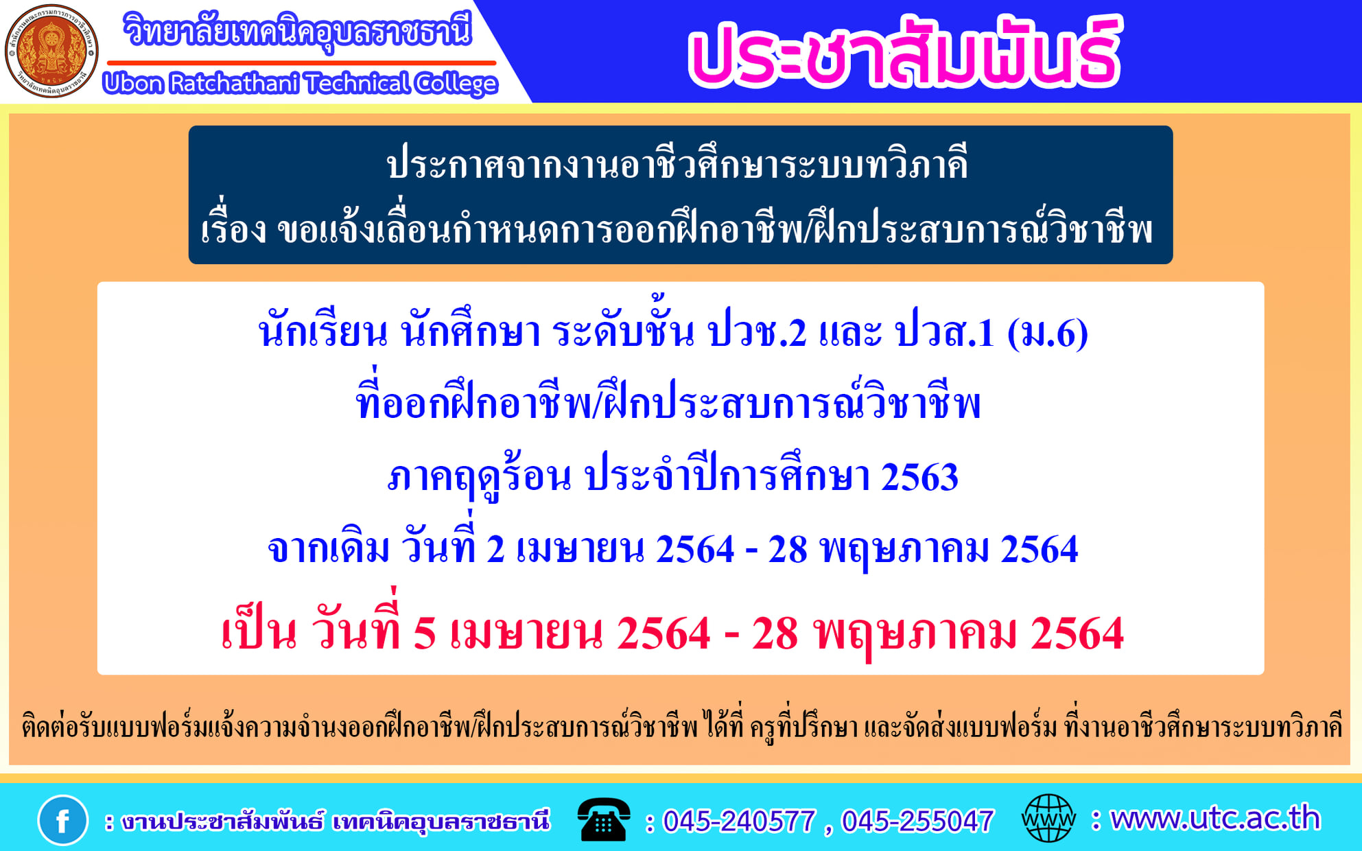 ประกาศ การลงทะเบียนฝึกงาน ของนักเรียน นักศึกษาระดับชั้น ปวช.2 และ ปวส.1 ทวิภาคี