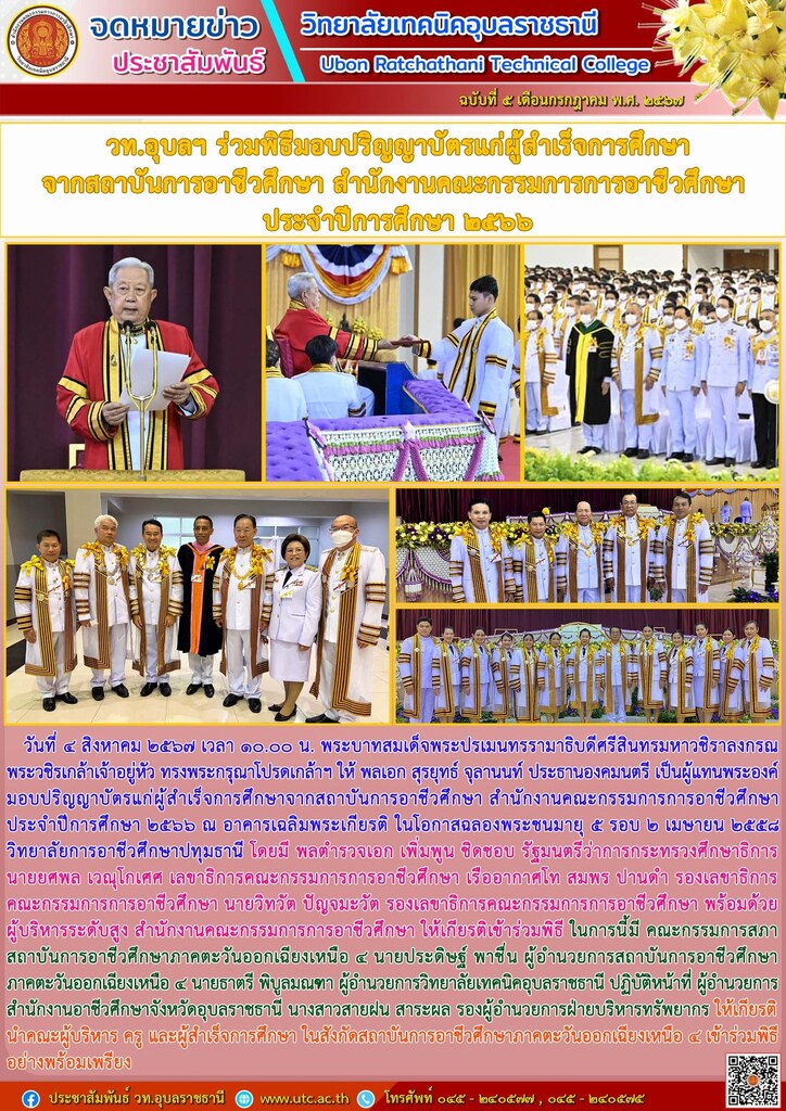 วท.อุบลฯ ร่วมพิธีมอบปริญญาบัตรแก่ผู้สำเร็จการศึกษาจากสถาบันการอาชีวศึกษา สำนักงานคณะกรรมการการอาชีวศึกษา ประจำปีการศึกษา ๒๕๖๖