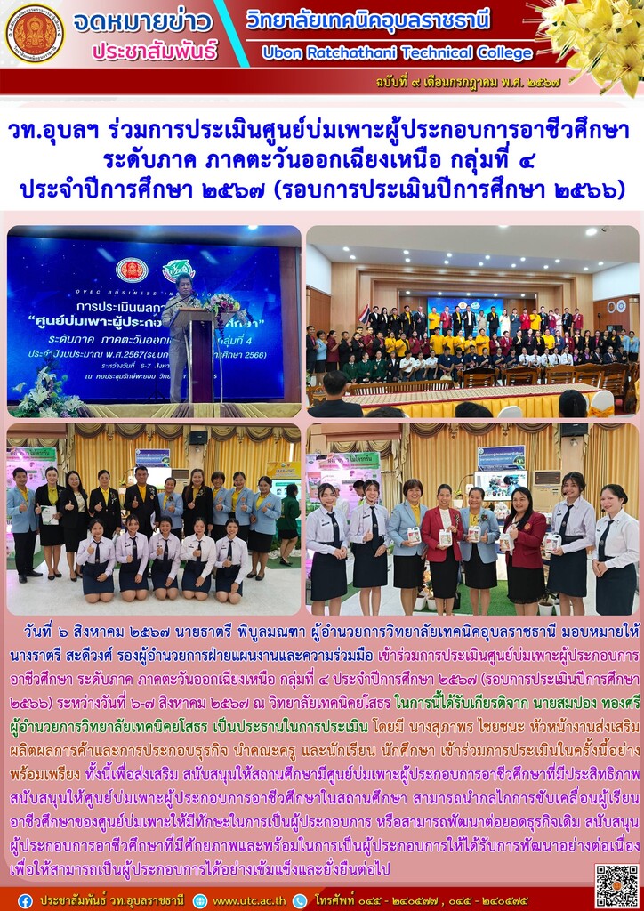 วันที่ ๖ สิงหาคม ๒๕๖๗ นายธาตรี พิบูลมณฑา ผู้อำนวยการวิทยาลัยเทคนิคอุบลราชธานี มอบหมายให้ นางราตรี สะดีวงศ์ รองผู้อำนวยการฝ่ายแผนงานและความร่วมมือ เข้าร่วมการประเมินศูนย์บ่มเพาะผู้ประกอบการอาชีวศึกษา ระดับภาค ภาคตะวันออกเฉียงเหนือ กลุ่มที่ ๔ ประจำปีการศึกษา ๒๕๖๗ (รอบการประเมินปีการศึกษา๒๕๖๖) ระหว่างวันที่ ๖-๗ สิงหาคม ๒๕๖๗ ณ วิทยาลัยเทคนิคยโสธร ในการนี้ได้รับเกียรติจาก นายสมปอง ทองศรีผู้อำนวยการวิทยาลัยเทคนิคยโสธร เป็นประธานในการประเมิน โดยมี นางสุภาพร ไชยชนะ หัวหน้างานส่งเสริมผลิตผลการค้าและการประกอบธุรกิจ นำคณะครู และนักเรียน นักศึกษา เข้าร่วมการประเมินในครั้งนี้อย่างพร้อมเพรียง ทั้งนี้เพื่อส่งเสริม สนับสนุนให้สถานศึกษามีศูนย์บ่มเพาะผู้ประกอบการอาชีวศึกษาที่มีประสิทธิภาพสนับสนุนให้ศูนย์บ่มเพาะผู้ประกอบการอาชีวศึกษาในสถานศึกษา สามารถนำกลไกการขับเคลื่อนผู้เรียนอาชีวศึกษาของศูนย์บ่มเพาะให้มีทักษะในการเป็นผู้ประกอบการ หรือสามารถพัฒนาต่อยอดธุรกิจเดิม สนับสนุนผู้ประกอบการอาชีวศึกษาที่มีศักยภาพและพร้อมในการเป็นผู้ประกอบการให้ได้รับการพัฒนาอย่างต่อเนื่อง เพื่อให้สามารถเป็นผู้ประกอบการได้อย่างเข้มแข็งและยั่งยืนต่อไป