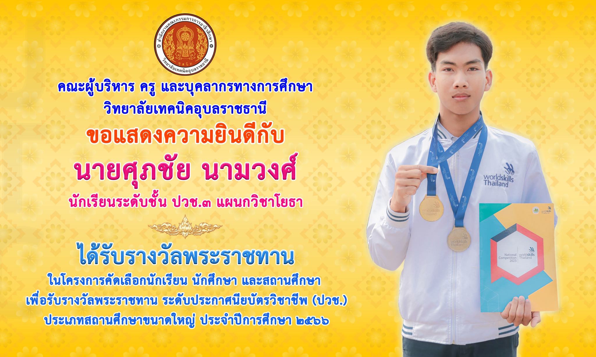 คณะผู้บริหาร ครู และบุคลากรทางการศึกษา วิทยาลัยเทคนิคอุบลราชธานี ขอแสดงความยินดีกับ นายศุภชัย นามวงศ์ นักเรียนระดับชั้น ปวช.๓ แผนกวิชาโยธา ได้รับรางวัลพระราชทาน