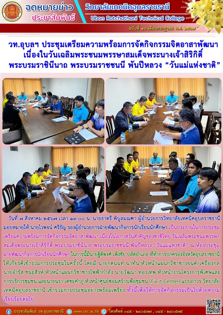 วันที่ ๗ สิงหาคม ๒๕๖๗ เวลา ๑๓.๐๐ น. นายธาตรี พิบูลมณฑา ผู้อำนวยการวิทยาลัยเทคนิคอุบลราชธานี มอบหมายให้ นายไวพจน์ ศรีธัญ รองผู้อำนวยการฝ่ายพัฒนากิจการนักเรียนนักศึกษา เป็นประธานในการประชุมเตรียมความพร้อมการจัดกิจกรรมจิตอาสาพัฒนา เนื่องในโอกาสวันสำคัญของชาติไทย วันเฉลิมพระชนมพรรษาสมเด็จพระนางเจ้าสิริกิติ์ พระบรมราชินีนาถ พระบรมราชชนนี พันปีหลวง “วันแม่แห่งชาติ” ณ ห้องประชุมฝ่ายพัฒนากิจการนักเรียนนักศึกษา ในการนี้มีนายฐิติพงศ์ เพ็งชัย ปลัดอำเภอ ที่ทำการปกครองจังหวัดอุบลราชธานีให้เกียรติเข้าร่วมการประชุมในครั้งนี้ โดยมี นายกตนนท์ นาทัน หัวหน้าแผนกวิชาช่างยนต์/เครื่องกล นายจำรัส ชนะสิงห์ หัวหน้าแผนกวิชาช่างไฟฟ้ากำลัง นายวัฒนา ทองเทพ หัวหน้างานโครงการพิเศษและการบริการชุมชน และนายนรา เดชะคำภู หัวหน้าศูนย์ซ่อมสร้างเพื่อชุมชน (Fix it Center) แบบถาวร วิทยาลัยเทคนิคอุบลราชธานี เข้าร่วมการประชุมอย่างพร้อมเพรียง ทั้งนี้เพื่อให้การจัดกิจกรรมเป็นไปด้วยความเรียบร้อยต่อไป