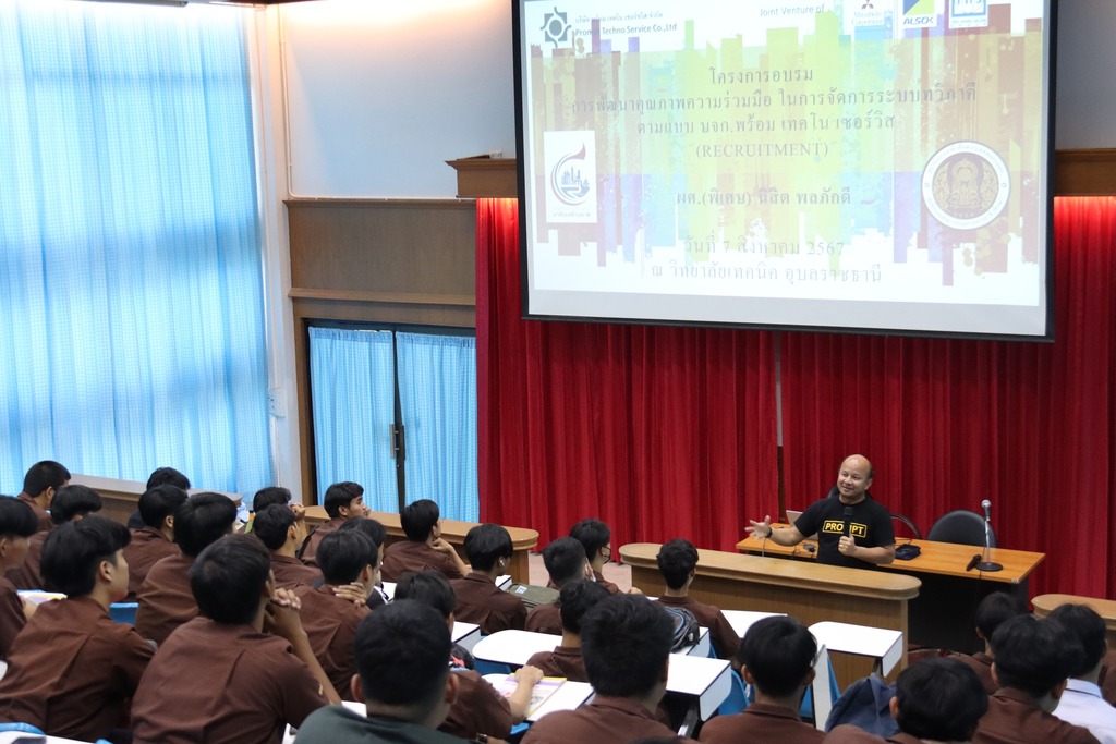 วันที่ ๗ สิงหาคม ๒๕๖๗ เวลา ๑๕.๐๐ น. นายธาตรี พิบูลมณฑา ผู้อำนวยการวิทยาลัยเทคนิคอุบลราชธานี มอบหมายให้ นายทรงศักดิ์ สัตนาโค หัวหน้างานอาชีวศึกษาระบบทวิภาคี ว่าที่ ร.ต.กรีฑาวุฒิ ทนงจิตร หัวหน้างานความร่วมมือ พร้อมด้วยคณะครู และบุคลากรทางการศึกษาที่เกี่ยวข้อง นำนักเรียน นักศึกษา แผนกวิชาช่างไฟฟ้ากำลัง และแผนกวิชาอิเล็กทรอนิกส์ เข้ารับฟังโครงการอบรมการพัฒนาคุณภาพความร่วมมือ ในการจัดการระบบทวิภาคีตามแบบ บจก.พร้อม เทคโน เซอร์วิส (RECRUITMENT) และรับสมัครนักเรียน นักศึกษา ณ ห้องประชุมบัวฟ้า โดยได้รับความอนุเคราะห์วิทยากรจาก พร้อม เทคโน เซอร์วิส จำกัด ทั้งนี้เพื่อให้นักศึกษาได้รับประสบการณ์ในการทำงาน ตลอดจนได้ฝึกภาคปฏิบัติ จากการปฏิบัติงานจริงและเมื่อจบภาคการศึกษาแล้ว สามารถนำไปพัฒนาตนเองเพื่อให้เป็นบุคลากรที่มีคุณภาพที่เหมาะสมและเป็นที่ต้องการของตลาดแรงงานต่อไป