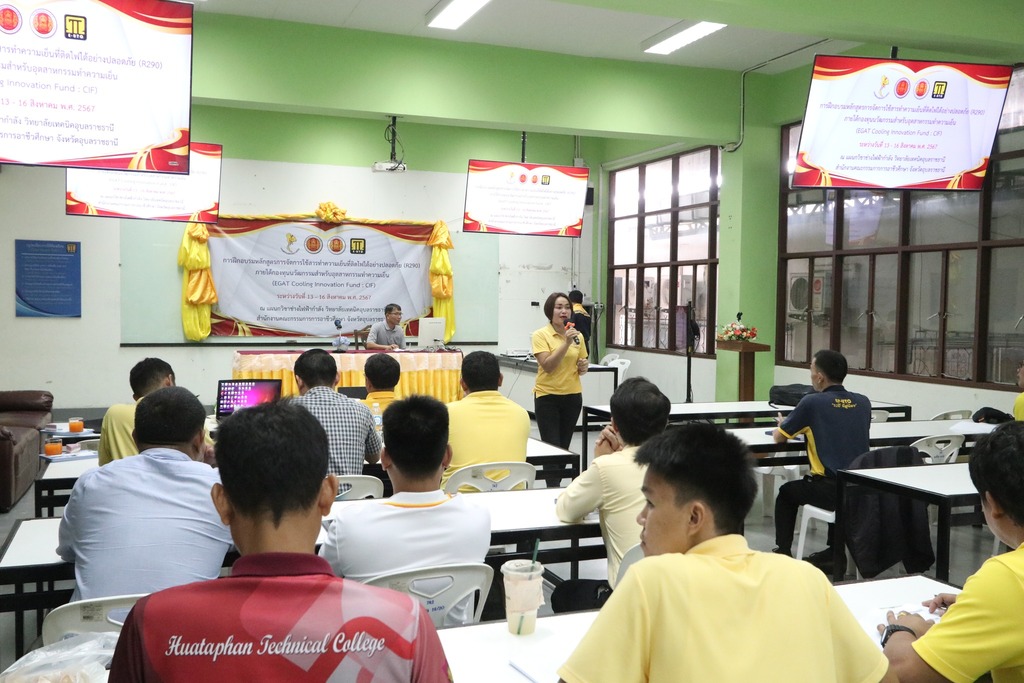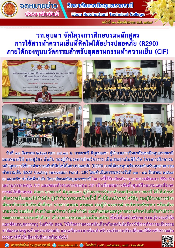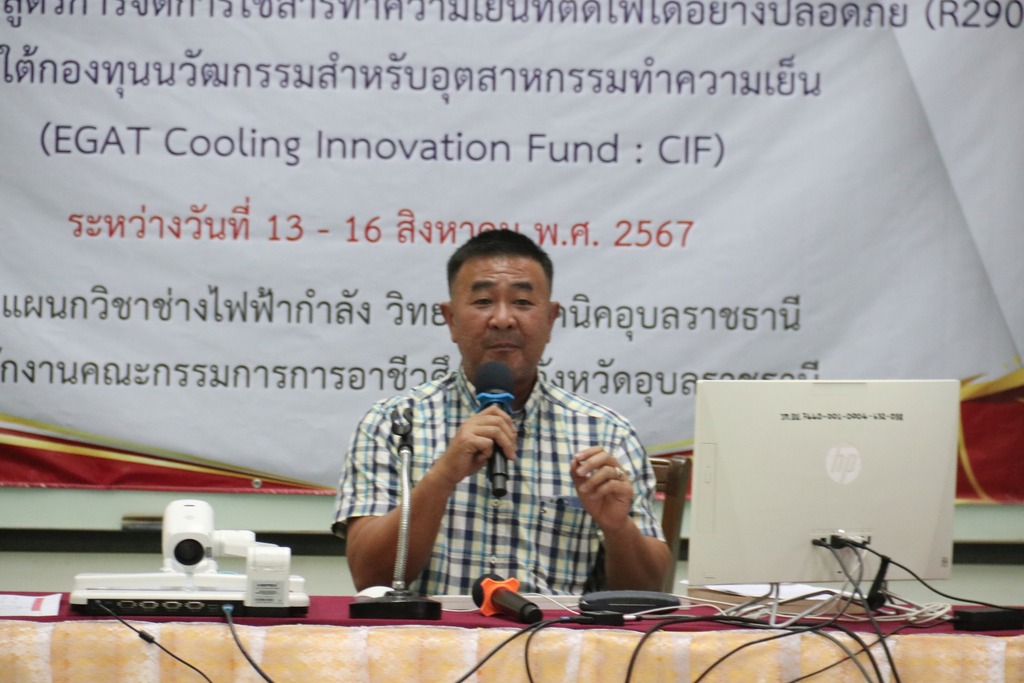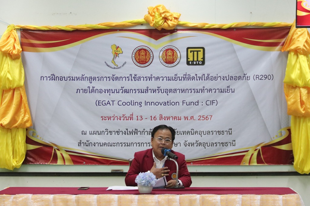 วันที่ ๑๓ สิงหาคม ๒๕๖๗ เวลา ๐๙.๓๐ น. นายธาตรี พิบูลมณฑา ผู้อำนวยการวิทยาลัยเทคนิคอุบลราชธานี มอบหมายให้ นายสุวิชา มั่นยืน รองผู้อำนวยการฝ่ายวิชาการ เป็นประธานในพิธีเปิด โครงการฝึกอบรมหลักสูตรการใช้สารทำความเย็นที่ติดไฟได้อย่างปลอดภัย (R290) ภายใต้กองทุนนวัตกรรมสำหรับอุตสาหกรรมทำความเย็น (EGAT Cooling Innovation Fund : CIF) โดยดำเนินการระหว่างวันที่ ๑๓ – ๑๖ สิงหาคม ๒๕๖๗ ณ แผนกวิชาช่างไฟฟ้ากำลัง วิทยาลัยเทคนิคอุบลราชธานี ในการนี้ได้รับเกียรติจาก นางสาวชนัตตาภา ศิรินาวิน เลขานุการกองทุน CIF และคณะทำงานจากกองทุน CIF เข้าเยี่ยมชมการจัดตั้งศูนย์ฝึกอบรมและสังเกตการณ์จัดฝึกอบรม ต่อมา นายธาตรี พิบูลมณฑา ผู้อำนวยการวิทยาลัยเทคนิคอุบลราชธานี ได้ให้เกียรติเข้าตรวจเยี่ยมและให้กำลังใจ ผู้เข้าร่วมการอบรมในครั้งนี้ ทั้งนี้มีนายไวพจน์ ศรีธัญ รองผู้อำนวยการฝ่ายพัฒนากิจการนักเรียนนักศึกษา นางสาวสายฝน สาระผล รองผู้อำนวยการฝ่ายบริหารทรัพยากร พร้อมด้วยนาย จำรัส ชนะสิงห์ หัวหน้าแผนกวิชาช่างไฟฟ้ากำลัง และตัวแทนคณะครูจากสถานศึกษาในสังกัดสำนักงานคณะกรรมการการอาชีวศึกษา เข้าร่วมการอบรมอย่างพร้อมเพรียง ทั้งนี้เพื่อสร้างทักษะ ความรู้ความเข้าใจ และพัฒนาบุคลากรครู ในสังกัด สอศ. ให้เกิดความตระหนักเกี่ยวกับเทคโนโลยีการใช้สารทำความเย็นธรรมชาติและมาตรฐานด้านความปลอดภัย และเตรียมความพร้อมสำหรับรองรับการปรับเปลี่ยนมาใช้สารทำความเย็นธรรมชาติที่เป็นมิตรกับสิ่งแวดล้อมต่อไป