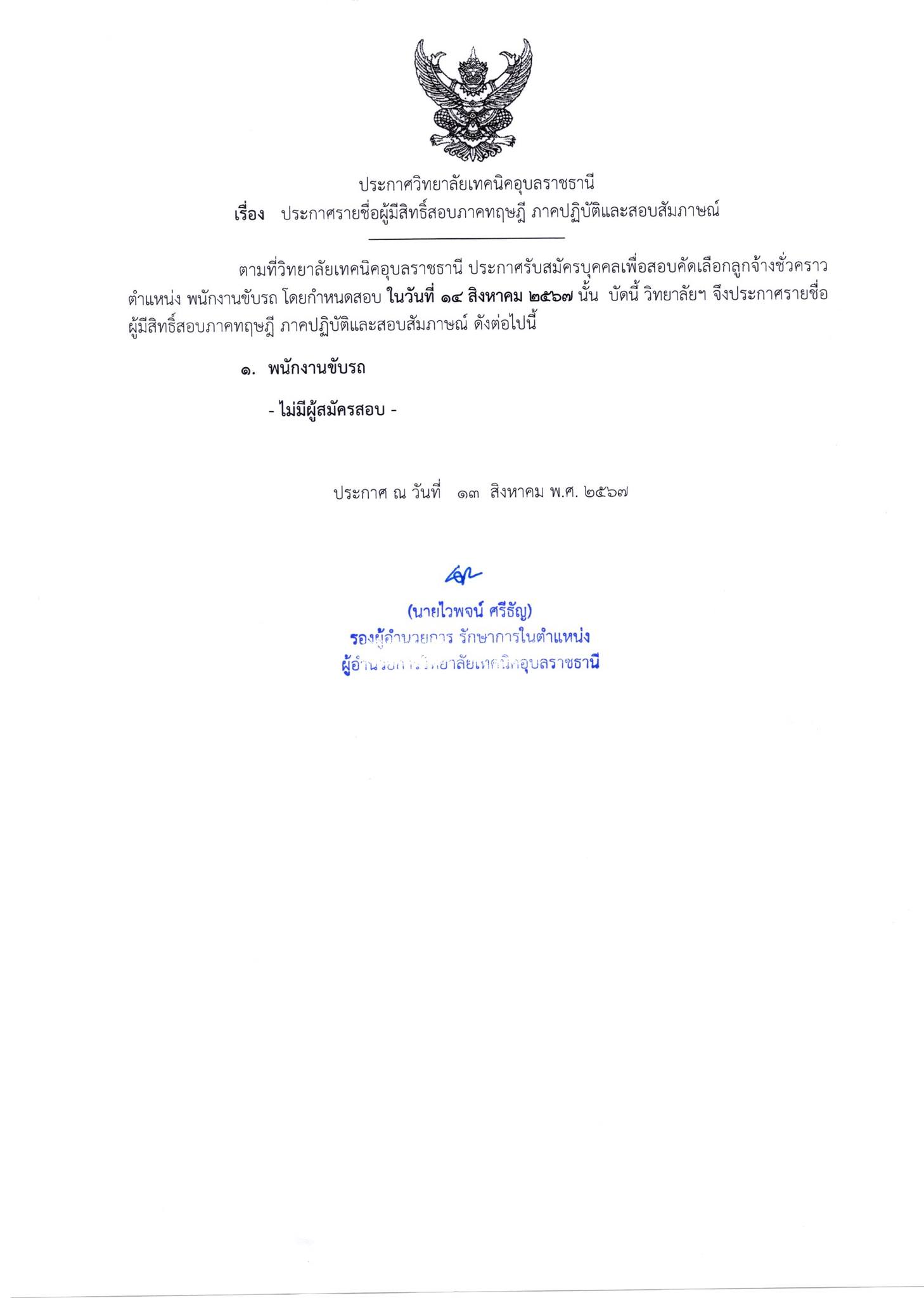 ตามที่วิทยาลัยเทคนิคอุบลราชธานี ประกาศรับสมัครบุคคลเพื่อสอบคัดเลือกลูกจ้างชั่วคราวตำแหน่ง พนักงานขับรถ โดยกำหนดสอบ ในวันที่ 14 สิงหาคม 2567 นั้น บัดนี้ วิทยาลัยฯ จึงประกาศรายชื่อผู้มีสิทธิ์สอบภาคทฤษฎี ภาคปฏิบัติและสอบสัมภาษณ์ ดังต่อไปนี้