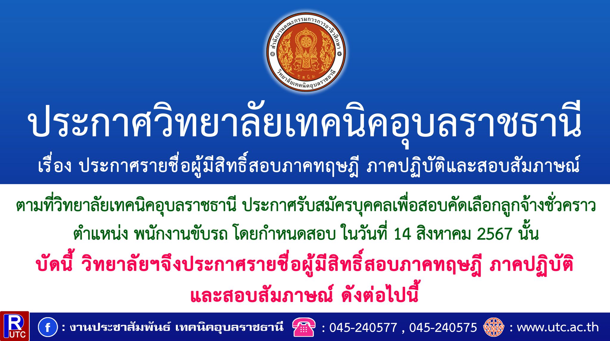 ประกาศรายชื่อผู้มีสิทธิ์สอบภาคทฤษฎี ภาคปฏิบัติและสอบสัมภาษณ์ ตามที่วิทยาลัยเทคนิคอุบลราชธานี ประกาศรับสมัครบุคคลเพื่อสอบคัดเลือกลูกจ้างชั่วคราวตำแหน่ง พนักงานขับรถ