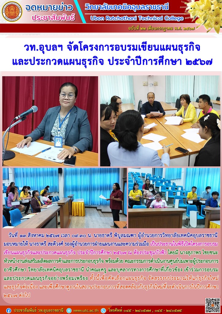 วันที่ ๑๓ สิงหาคม ๒๕๖๗ เวลา ๐๙.๓๐ น. นายธาตรี พิบูลมณฑา ผู้อำนวยการวิทยาลัยเทคนิคอุบลราชธานี มอบหมายให้ นางราตรี สะดีวงศ์ รองผู้อำนวยการฝ่ายแผนงานและความร่วมมือ เป็นประธานในพิธีเปิดโครงการอบรมเขียนแผนธุรกิจและประกวดแผนธุรกิจ ประจำปีการศึกษา ๒๕๖๗ ณ ห้องประชุมบัวฟ้า โดยมีนางสุภาพร ไชยชนะ หัวหน้างานส่งเสริมผลิตผลการค้าและการประกอบธุรกิจ พร้อมด้วยคณะกรรมการดำเนินงานศูนย์บ่มเพาะผู้ประกอบการอาชีวศึกษา วิทยาลัยเทคนิคอุบลราชธานี นำคณะครู และบุคลากรทางการศึกษาที่เกี่ยวข้อง เข้าร่วมโครงการอย่างพร้อมเพรียง ทั้งนี้เพื่อคัดเลือกแผนธุรกิจ จัดสรรงบประมาณให้แก่ธุรกิจใหม่และธุรกิจต่อเนื่อง และเพื่อศึกษาดูงานในสถานประกอบการที่สอดคล้องกับธุรกิจใหม่ที่จะดำเนินการในปีการศึกษา ๒๕๖๗ ต่อไป