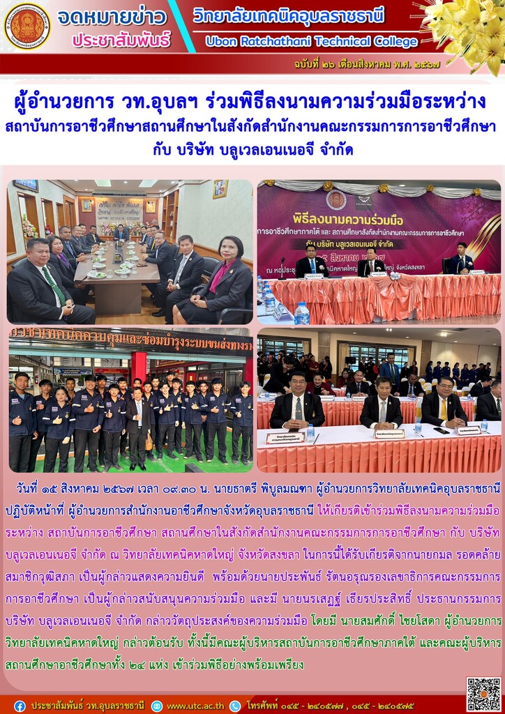 วันที่ ๑๕ สิงหาคม ๒๕๖๗ เวลา ๐๙.๓๐ น. นายธาตรี พิบูลมณฑา ผู้อำนวยการวิทยาลัยเทคนิคอุบลราชธานี ปฏิบัติหน้าที่ ผู้อำนวยการสำนักงานอาชีวศึกษาจังหวัดอุบลราชธานี ให้เกียรติเข้าร่วมพิธีลงนามความร่วมมือระหว่าง สถาบันการอาชีวศึกษา สถานศึกษาในสังกัดสำนักงานคณะกรรมการการอาชีวศึกษา กับ บริษัท บลูเวลเอนเนอจี จำกัด ณ วิทยาลัยเทคนิคหาดใหญ่ จังหวัดสงขลา ในการนี้ได้รับเกียรติจากนายกมล รอดคล้าย สมาชิกวุฒิสภา เป็นผู้กล่าวแสดงความยินดี พร้อมด้วยนายประพันธ์ รัตนอรุณรองเลขาธิการคณะกรรมการการอาชีวศึกษา เป็นผู้กล่าวสนับสนุนความร่วมมือ และมี นายนรเสฏฐ์ เธียรประสิทธิ์ ประธานกรรมการบริษัท บลูเวลเอนเนอจี จำกัด กล่าววัตถุประสงค์ของความร่วมมือ โดยมี นายสมศักดิ์ ไชยโสดา ผู้อำนวยการวิทยาลัยเทคนิคหาดใหญ่ กล่าวต้อนรับ ทั้งนี้มีคณะผู้บริหารสถาบันการอาชีวศึกษาภาคใต้ และคณะผู้บริหารสถานศึกษาอาชีวศึกษาทั้ง ๒๔ แห่ง เข้าร่วมพิธีอย่างพร้อมเพรียง