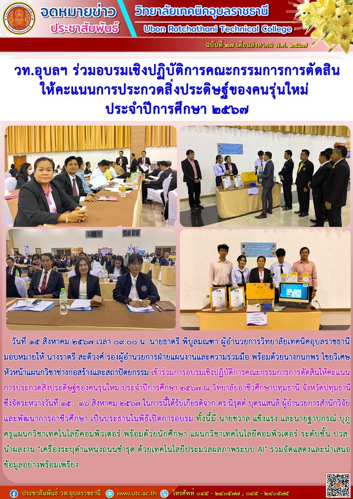 วันที่ ๑๕ สิงหาคม ๒๕๖๗ เวลา ๐๙.๐๐ น. นายธาตรี พิบูลมณฑา ผู้อำนวยการวิทยาลัยเทคนิคอุบลราชธานี มอบหมายให้ นางราตรี สะดีวงศ์ รองผู้อำนวยการฝ่ายแผนงานและความร่วมมือ พร้อมด้วยนางกนกพร ไชยวิเศษ หัวหน้าแผนกวิชาช่างก่อสร้างและสถาปัตยกรรม เข้าร่วมการอบรมเชิงปฏิบัติการคณะกรรมการการตัดสินให้คะแนนการประกวดสิ่งประดิษฐ์ของคนรุ่นใหม่ ประจำปีการศึกษา ๒๕๖๗ ณ วิทยาลัยอาชีวศึกษาปทุมธานี จังหวัดปทุมธานีซึ่งจัดระหว่างวันที่ ๑๕ – ๑๖ สิงหาคม ๒๕๖๗ ในการนี้ได้รับเกียรติจาก ดร.นิรุตต์ บุตรแสนลี ผู้อำนวยการสำนักวิจัยและพัฒนาการอาชีวศึกษา เป็นประธานในพิธีเปิดการอบรม ทั้งนี้มี นายชวาล แข็งแรง และนายฐาปกรณ์ บุภู่ ครูแผนกวิชาเทคโนโลยีคอมพิวเตอร์ พร้อมด้วยนักศึกษา แผนกวิชาเทคโนโลยีคอมพิวเตอร์ ระดับชั้น ปวส. นำผลงาน “เครื่องระบุตำแหน่งถนนชำรุด ด้วยเทคโนโลยีประมวลผลภาพระบบ AI” ร่วมจัดแสดงและนำเสนอข้อมูลอย่างพร้อมเพรียง