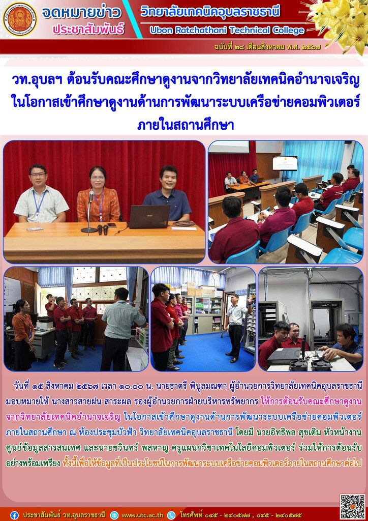 วันที่ ๑๕ สิงหาคม ๒๕๖๗ เวลา ๑๐.๐๐ น. นายธาตรี พิบูลมณฑา ผู้อำนวยการวิทยาลัยเทคนิคอุบลราชธานี มอบหมายให้ นางสาวสายฝน สาระผล รองผู้อำนวยการฝ่ายบริหารทรัพยากร ให้การต้อนรับคณะศึกษาดูงานจากวิทยาลัยเทคนิคอำนาจเจริญ เนื่องในโอกาสเข้าศึกษาดูงานด้านการพัฒนาระบบเครือข่ายคอมพิวเตอร์ภายในสถานศึกษา ณ ห้องประชุมบัวฟ้า วิทยาลัยเทคนิคอุบลราชธานี โดยมี นายอิทธิพล สุขเติม หัวหน้างานศูนย์ข้อมูลสารสนเทศ และนายชวินทร์ พลหาญ ครูแผนกวิชาเทคโนโลยีคอมพิวเตอร์ ร่วมให้การต้อนรับอย่างพร้อมเพรียง ทั้งนี้เพื่อให้ข้อมูลที่เป็นประโยชน์ในการพัฒนาระบบเครือข่ายคอมพิวเตอร์ภายในสถานศึกษาต่อไป