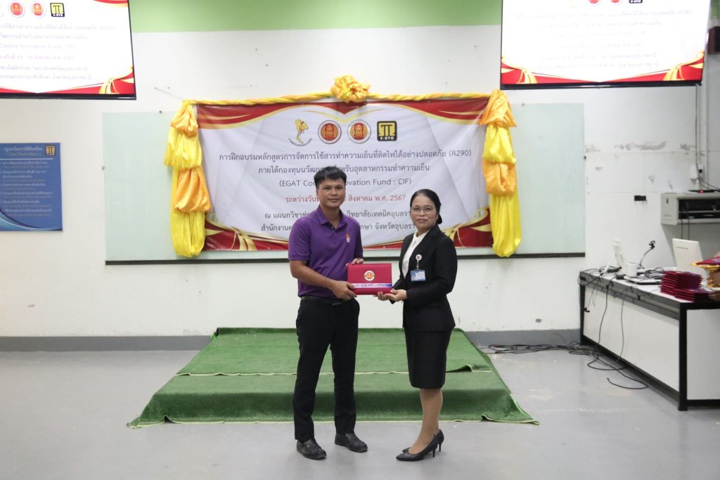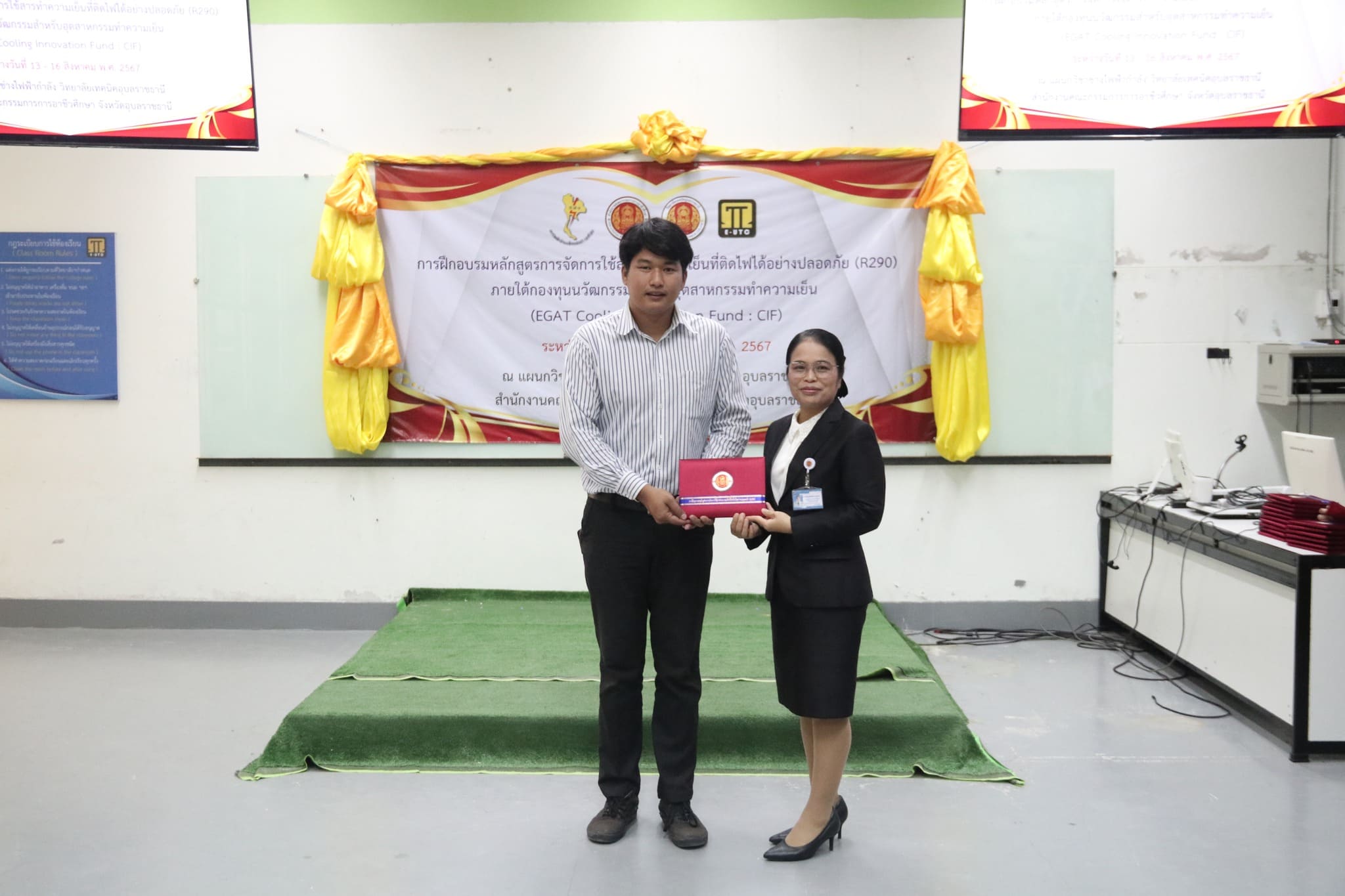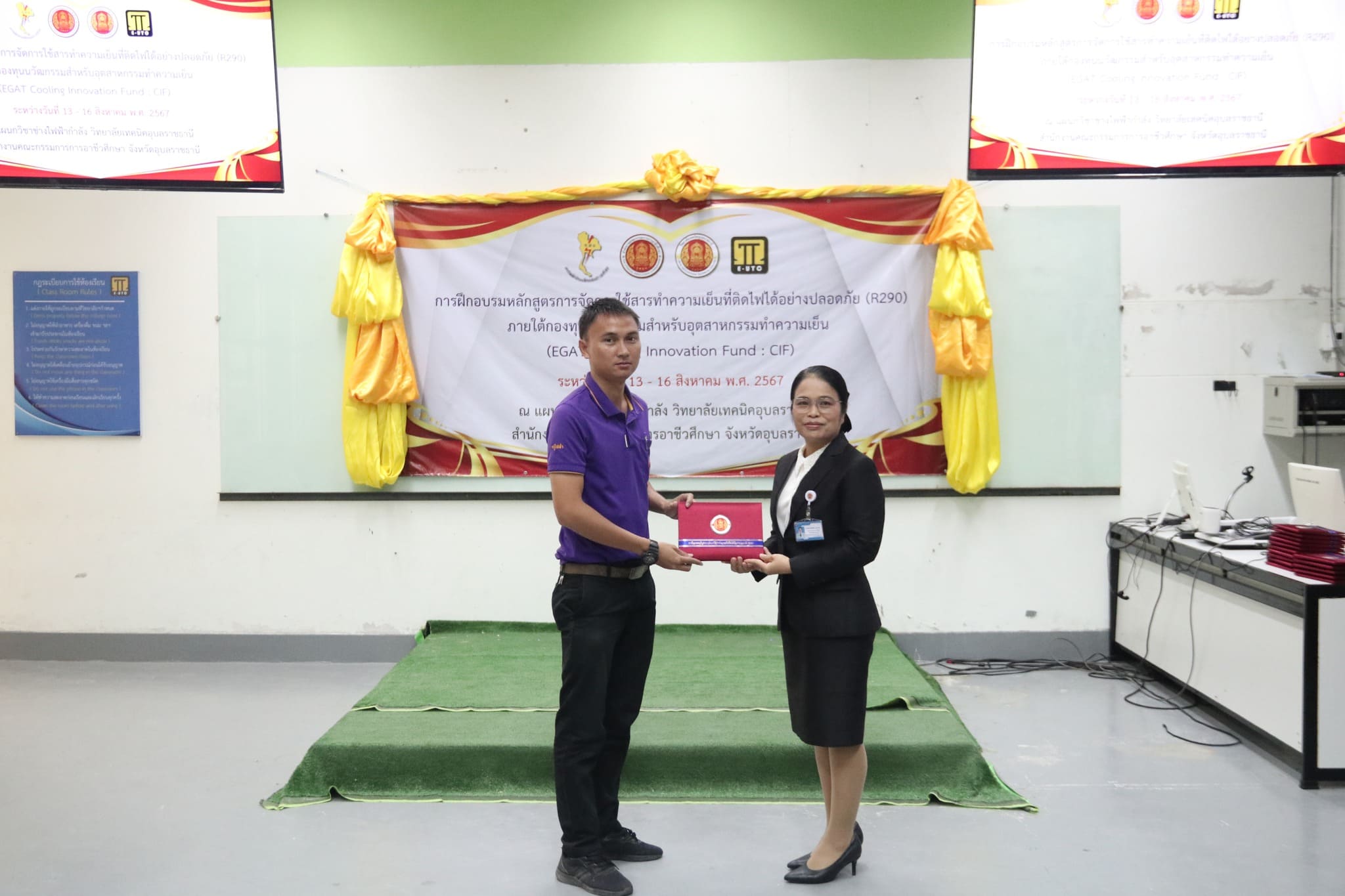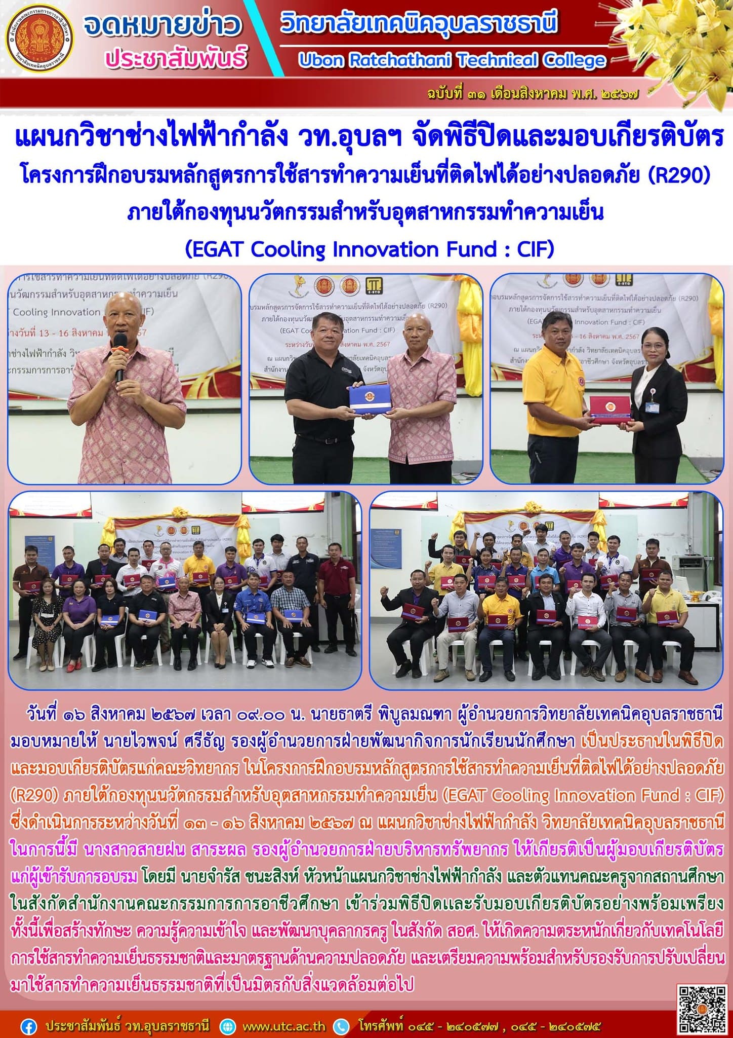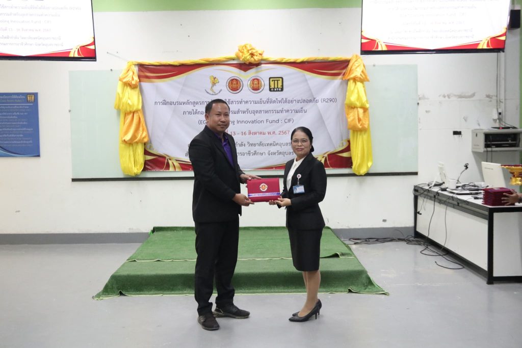 วันที่ ๑๖ สิงหาคม ๒๕๖๗ เวลา ๐๙.๐๐ น. นายธาตรี พิบูลมณฑา ผู้อำนวยการวิทยาลัยเทคนิคอุบลราชธานี มอบหมายให้ นายไวพจน์ ศรีธัญ รองผู้อำนวยการฝ่ายพัฒนากิจการนักเรียนนักศึกษา เป็นประธานในพิธีปิดและมอบเกียรติบัตรแก่คณะวิทยากร ในโครงการฝึกอบรมหลักสูตรการใช้สารทำความเย็นที่ติดไฟได้อย่างปลอดภัย (R290) ภายใต้กองทุนนวัตกรรมสำหรับอุตสาหกรรมทำความเย็น (EGAT Cooling Innovation Fund : CIF) ซึ่งดำเนินการระหว่างวันที่ ๑๓ – ๑๖ สิงหาคม ๒๕๖๗ ณ แผนกวิชาช่างไฟฟ้ากำลัง วิทยาลัยเทคนิคอุบลราชธานี ในการนี้มี นางสาวสายฝน สาระผล รองผู้อำนวยการฝ่ายบริหารทรัพยากร ให้เกียรติเป็นผู้มอบเกียรติบัตรแก่ผู้เข้ารับการอบรม โดยมี นายจำรัส ชนะสิงห์ หัวหน้าแผนกวิชาช่างไฟฟ้ากำลัง และตัวแทนคณะครูจากสถานศึกษาในสังกัดสำนักงานคณะกรรมการการอาชีวศึกษา เข้าร่วมพิธีปิดเเละรับมอบเกียรติบัตรอย่างพร้อมเพรียง ทั้งนี้เพื่อสร้างทักษะ ความรู้ความเข้าใจ และพัฒนาบุคลากรครู ในสังกัด สอศ. ให้เกิดความตระหนักเกี่ยวกับเทคโนโลยีการใช้สารทำความเย็นธรรมชาติและมาตรฐานด้านความปลอดภัย และเตรียมความพร้อมสำหรับรองรับการปรับเปลี่ยนมาใช้สารทำความเย็นธรรมชาติที่เป็นมิตรกับสิ่งแวดล้อมต่อไป