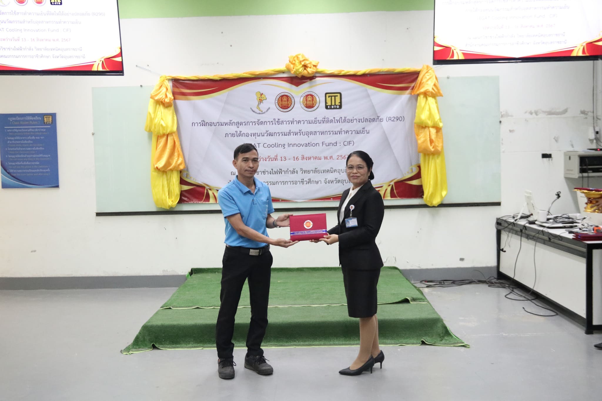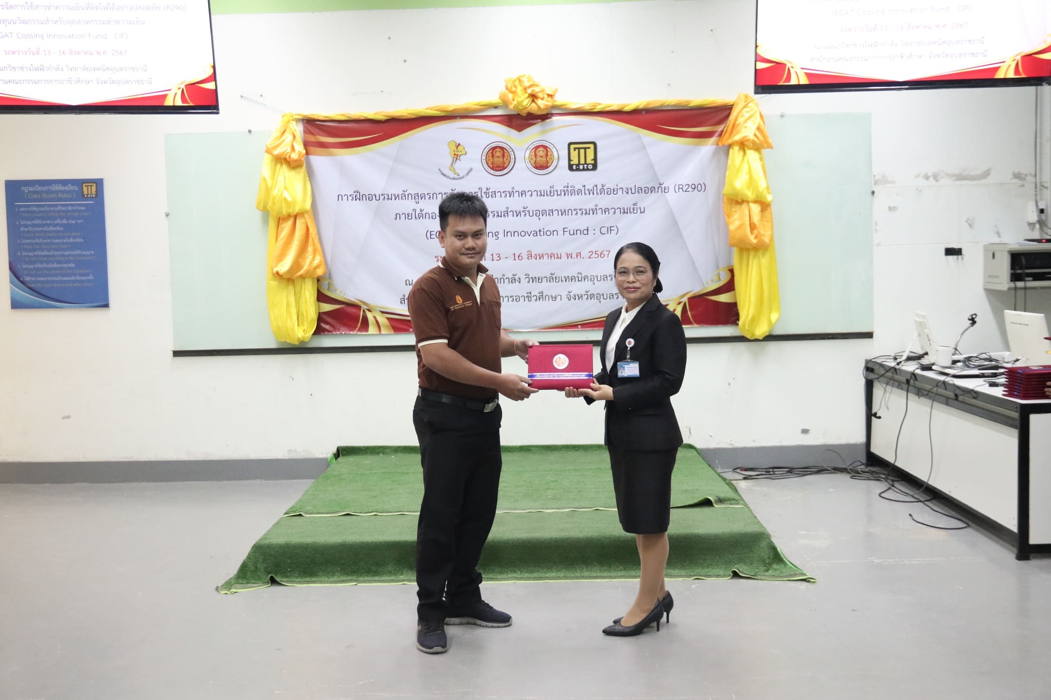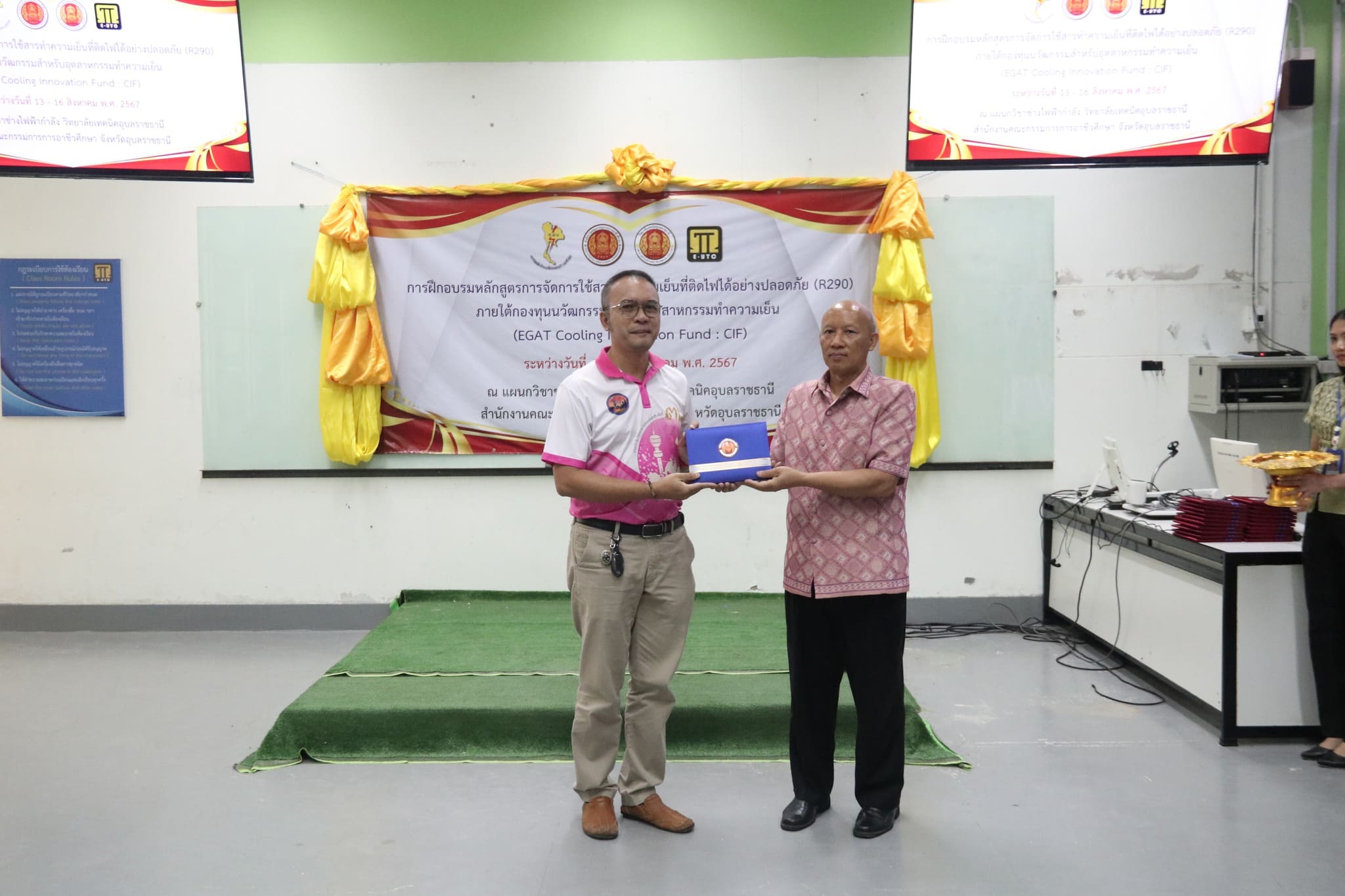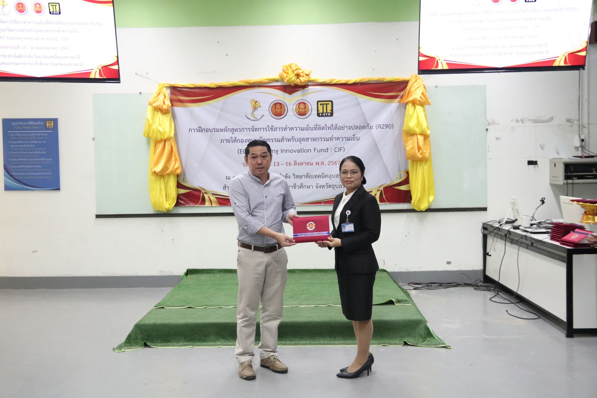 วันที่ ๑๖ สิงหาคม ๒๕๖๗ เวลา ๐๙.๐๐ น. นายธาตรี พิบูลมณฑา ผู้อำนวยการวิทยาลัยเทคนิคอุบลราชธานี มอบหมายให้ นายไวพจน์ ศรีธัญ รองผู้อำนวยการฝ่ายพัฒนากิจการนักเรียนนักศึกษา เป็นประธานในพิธีปิดและมอบเกียรติบัตรแก่คณะวิทยากร ในโครงการฝึกอบรมหลักสูตรการใช้สารทำความเย็นที่ติดไฟได้อย่างปลอดภัย (R290) ภายใต้กองทุนนวัตกรรมสำหรับอุตสาหกรรมทำความเย็น (EGAT Cooling Innovation Fund : CIF) ซึ่งดำเนินการระหว่างวันที่ ๑๓ – ๑๖ สิงหาคม ๒๕๖๗ ณ แผนกวิชาช่างไฟฟ้ากำลัง วิทยาลัยเทคนิคอุบลราชธานี ในการนี้มี นางสาวสายฝน สาระผล รองผู้อำนวยการฝ่ายบริหารทรัพยากร ให้เกียรติเป็นผู้มอบเกียรติบัตรแก่ผู้เข้ารับการอบรม โดยมี นายจำรัส ชนะสิงห์ หัวหน้าแผนกวิชาช่างไฟฟ้ากำลัง และตัวแทนคณะครูจากสถานศึกษาในสังกัดสำนักงานคณะกรรมการการอาชีวศึกษา เข้าร่วมพิธีปิดเเละรับมอบเกียรติบัตรอย่างพร้อมเพรียง ทั้งนี้เพื่อสร้างทักษะ ความรู้ความเข้าใจ และพัฒนาบุคลากรครู ในสังกัด สอศ. ให้เกิดความตระหนักเกี่ยวกับเทคโนโลยีการใช้สารทำความเย็นธรรมชาติและมาตรฐานด้านความปลอดภัย และเตรียมความพร้อมสำหรับรองรับการปรับเปลี่ยนมาใช้สารทำความเย็นธรรมชาติที่เป็นมิตรกับสิ่งแวดล้อมต่อไป