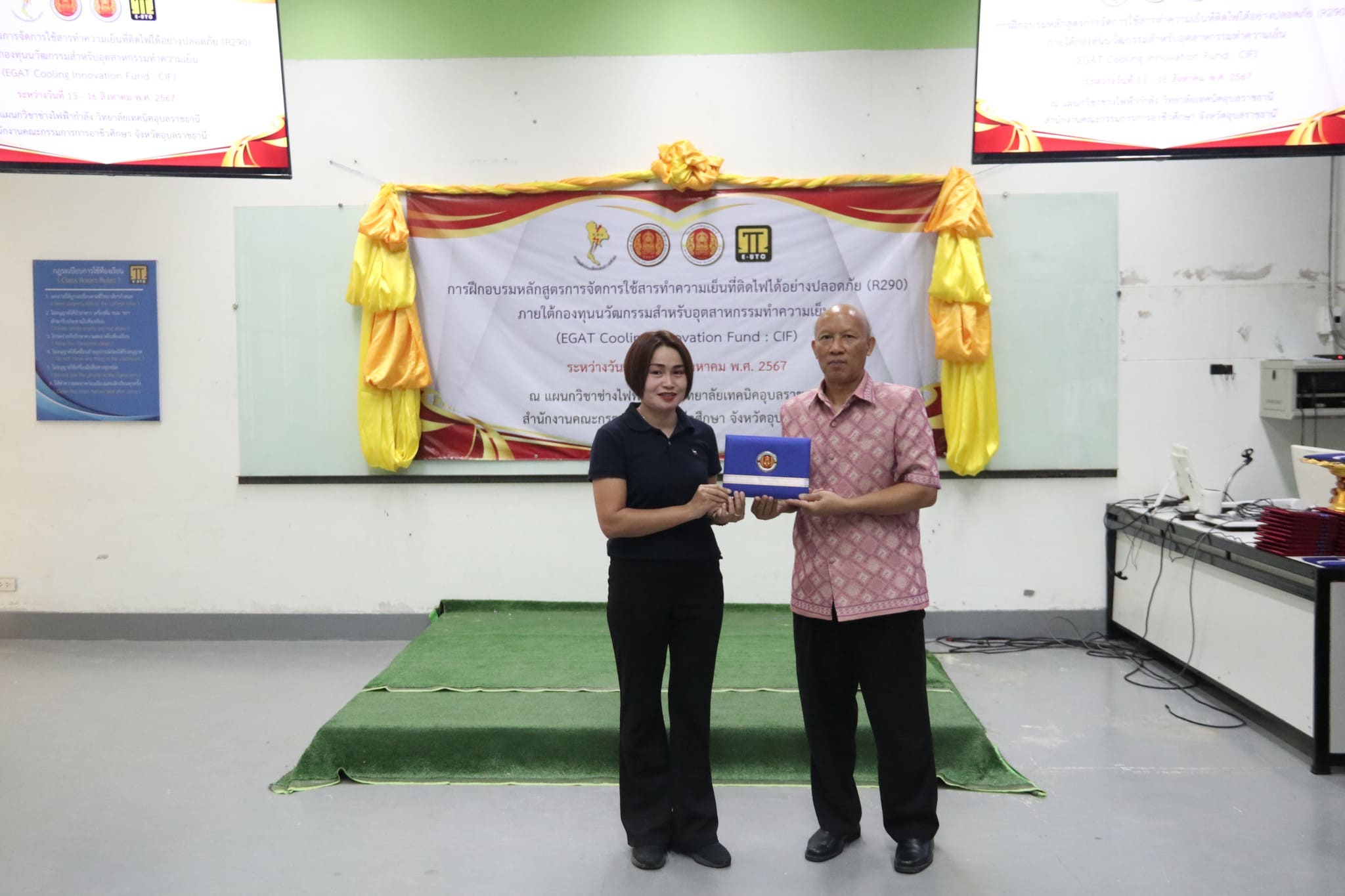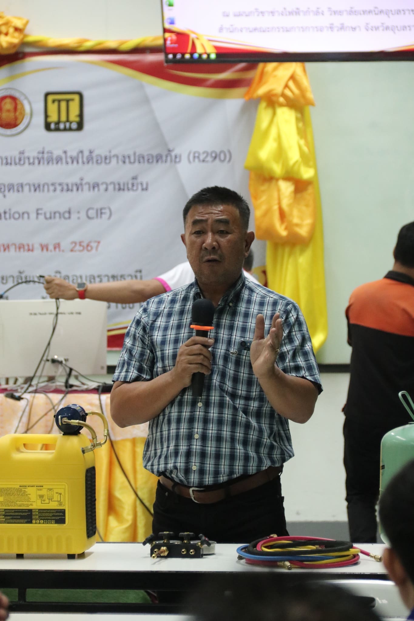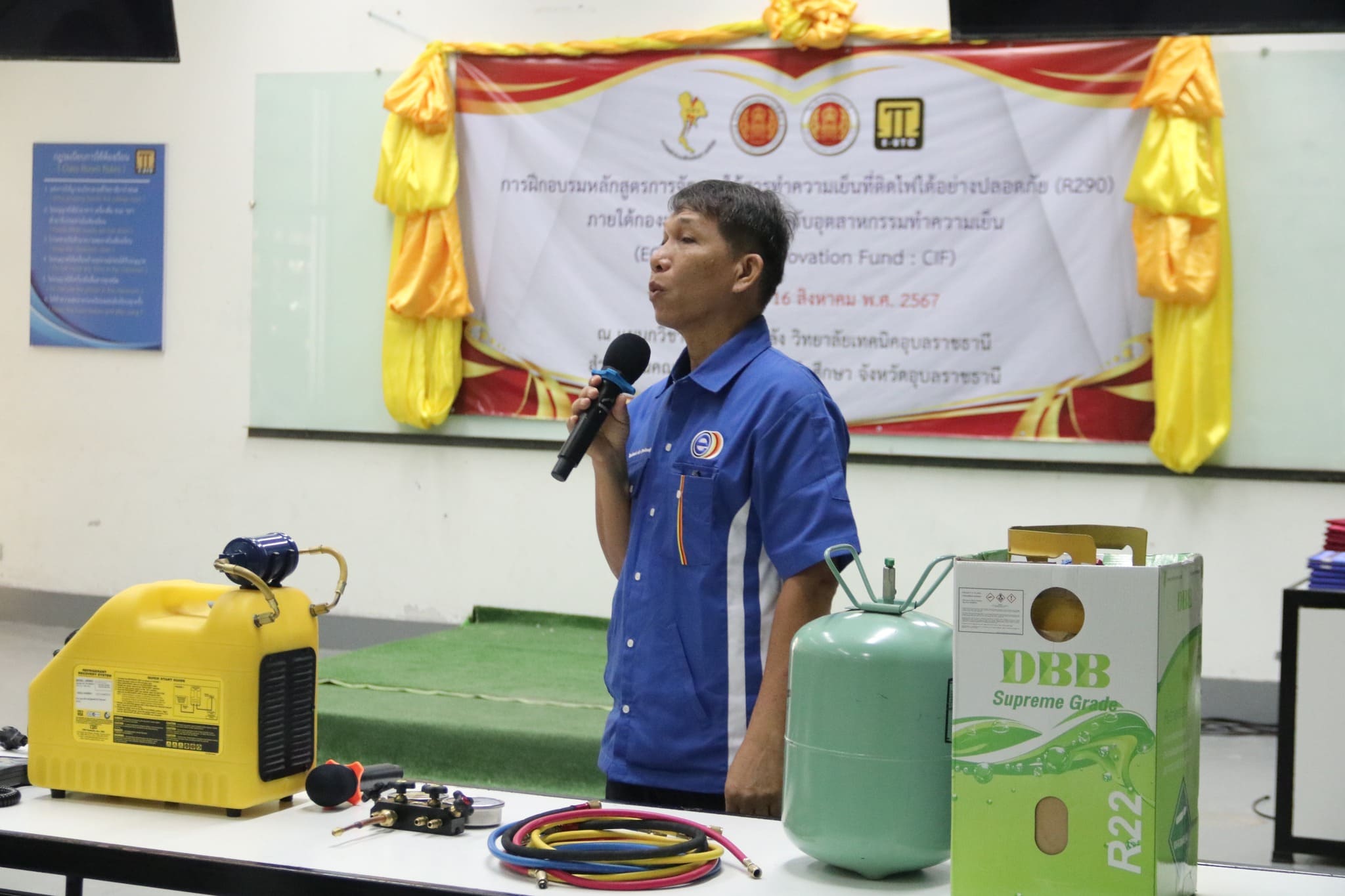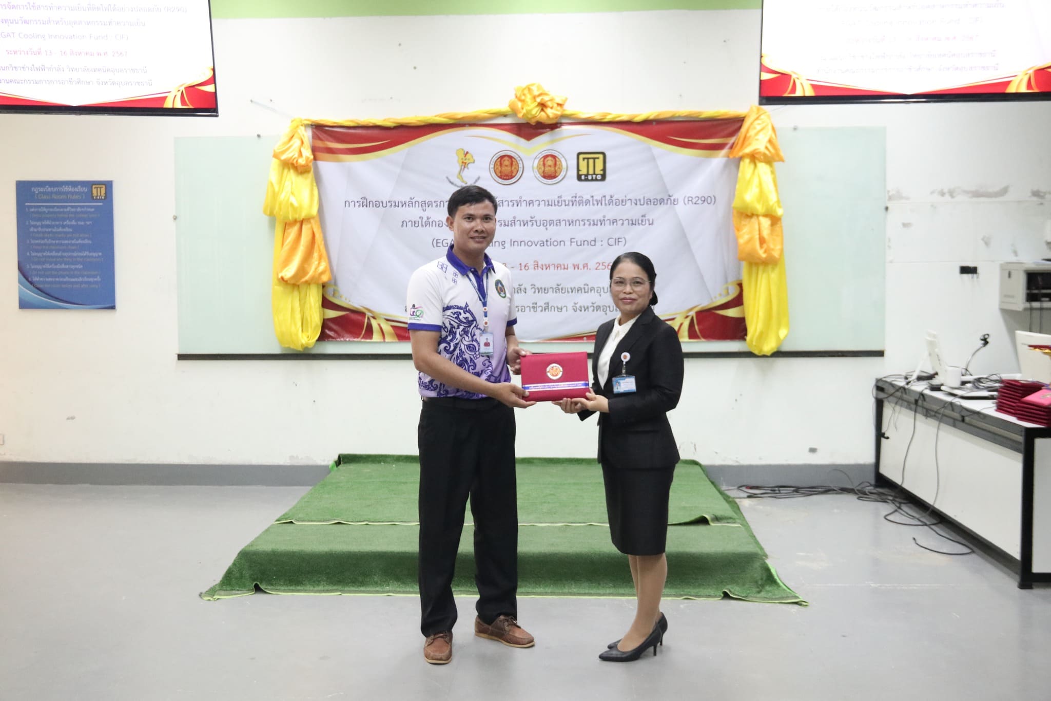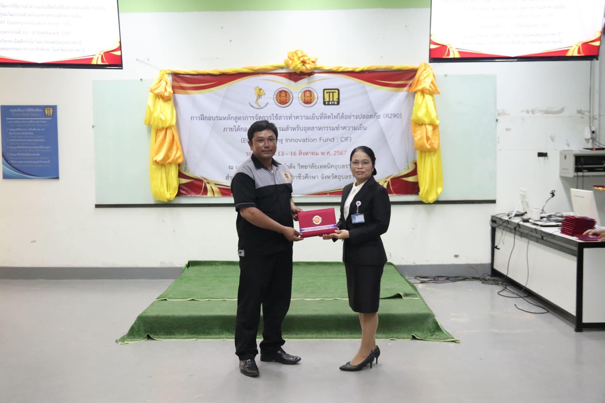 วันที่ ๑๖ สิงหาคม ๒๕๖๗ เวลา ๐๙.๐๐ น. นายธาตรี พิบูลมณฑา ผู้อำนวยการวิทยาลัยเทคนิคอุบลราชธานี มอบหมายให้ นายไวพจน์ ศรีธัญ รองผู้อำนวยการฝ่ายพัฒนากิจการนักเรียนนักศึกษา เป็นประธานในพิธีปิดและมอบเกียรติบัตรแก่คณะวิทยากร ในโครงการฝึกอบรมหลักสูตรการใช้สารทำความเย็นที่ติดไฟได้อย่างปลอดภัย (R290) ภายใต้กองทุนนวัตกรรมสำหรับอุตสาหกรรมทำความเย็น (EGAT Cooling Innovation Fund : CIF) ซึ่งดำเนินการระหว่างวันที่ ๑๓ – ๑๖ สิงหาคม ๒๕๖๗ ณ แผนกวิชาช่างไฟฟ้ากำลัง วิทยาลัยเทคนิคอุบลราชธานี ในการนี้มี นางสาวสายฝน สาระผล รองผู้อำนวยการฝ่ายบริหารทรัพยากร ให้เกียรติเป็นผู้มอบเกียรติบัตรแก่ผู้เข้ารับการอบรม โดยมี นายจำรัส ชนะสิงห์ หัวหน้าแผนกวิชาช่างไฟฟ้ากำลัง และตัวแทนคณะครูจากสถานศึกษาในสังกัดสำนักงานคณะกรรมการการอาชีวศึกษา เข้าร่วมพิธีปิดเเละรับมอบเกียรติบัตรอย่างพร้อมเพรียง ทั้งนี้เพื่อสร้างทักษะ ความรู้ความเข้าใจ และพัฒนาบุคลากรครู ในสังกัด สอศ. ให้เกิดความตระหนักเกี่ยวกับเทคโนโลยีการใช้สารทำความเย็นธรรมชาติและมาตรฐานด้านความปลอดภัย และเตรียมความพร้อมสำหรับรองรับการปรับเปลี่ยนมาใช้สารทำความเย็นธรรมชาติที่เป็นมิตรกับสิ่งแวดล้อมต่อไป