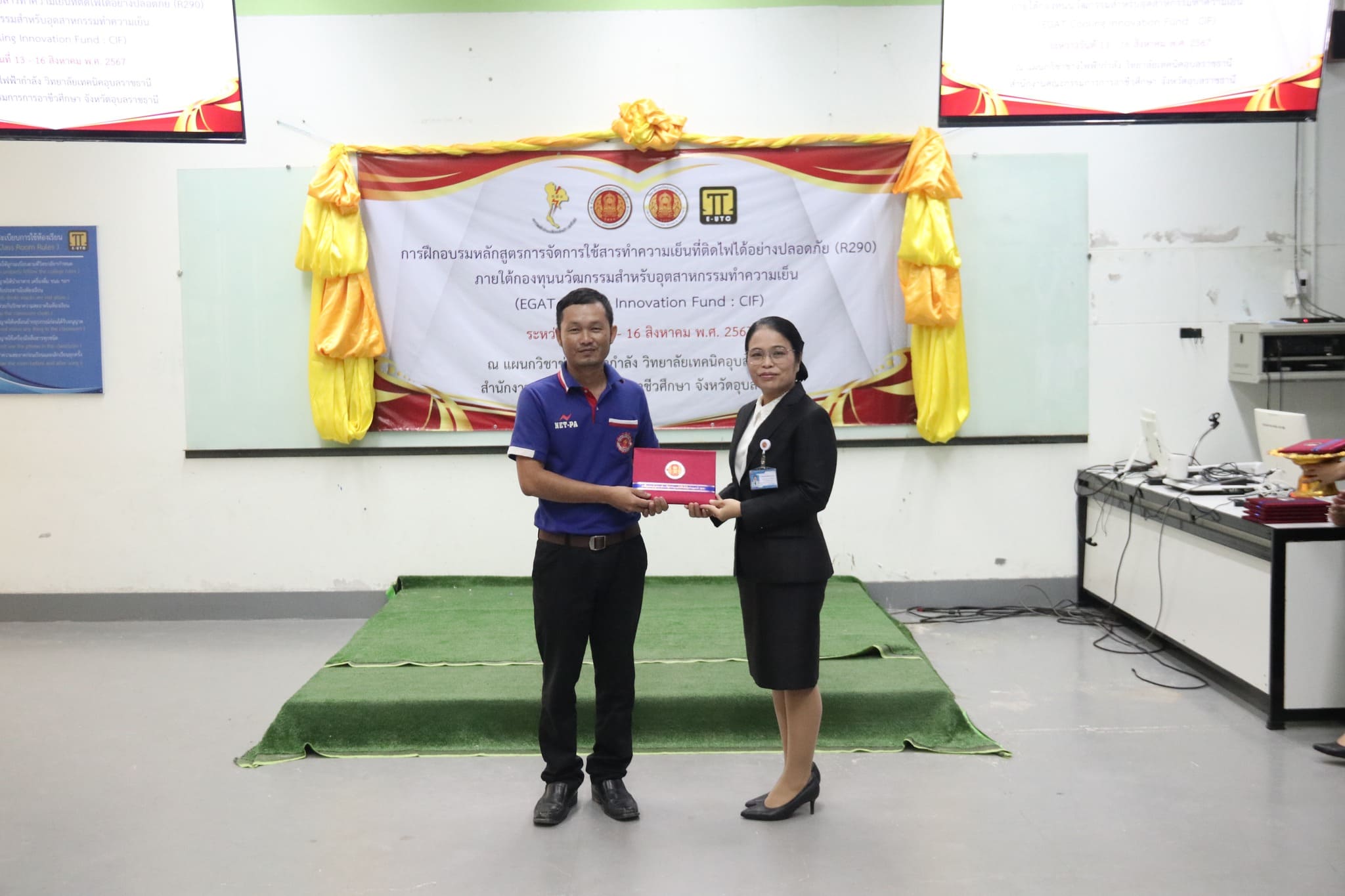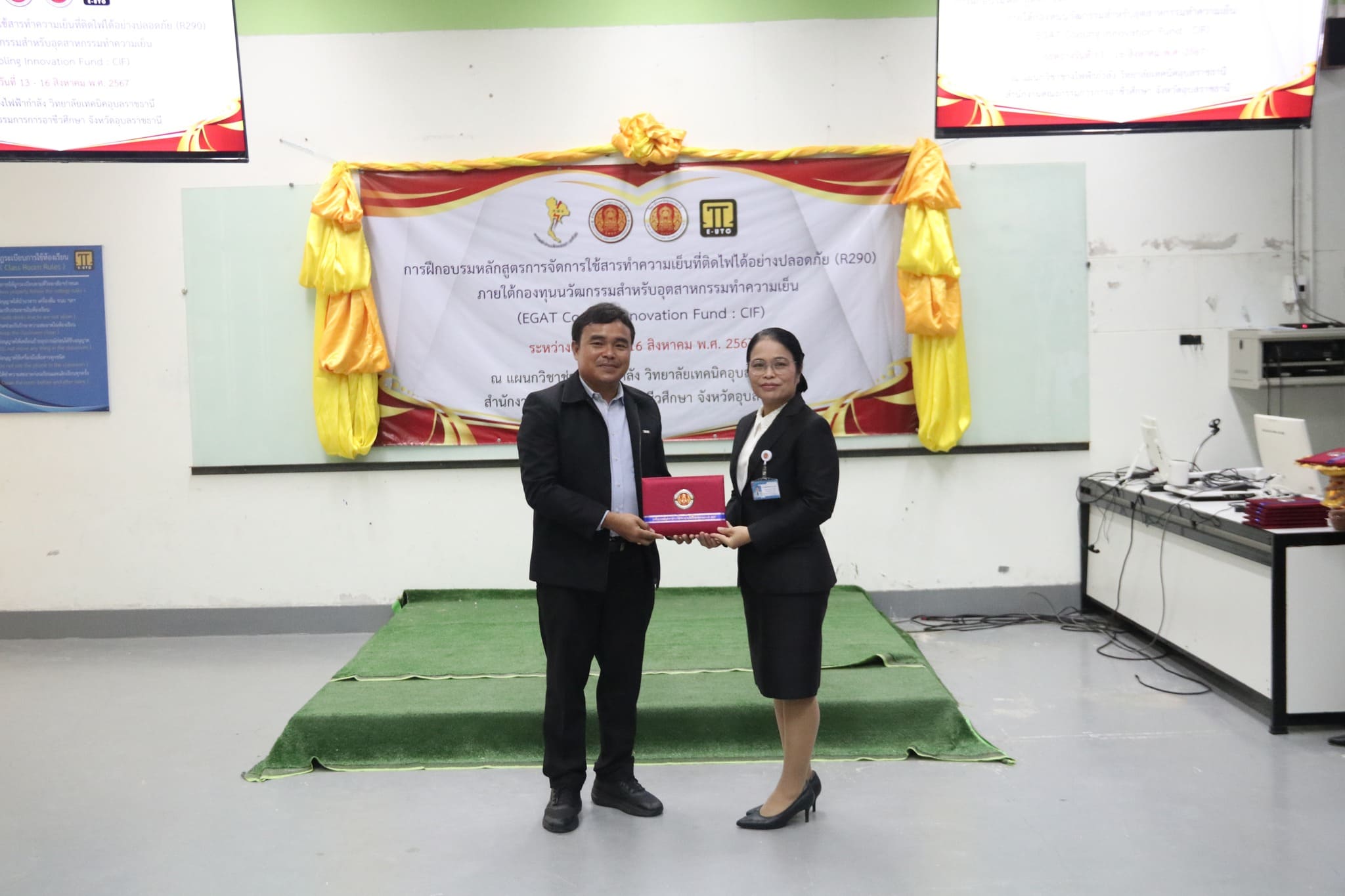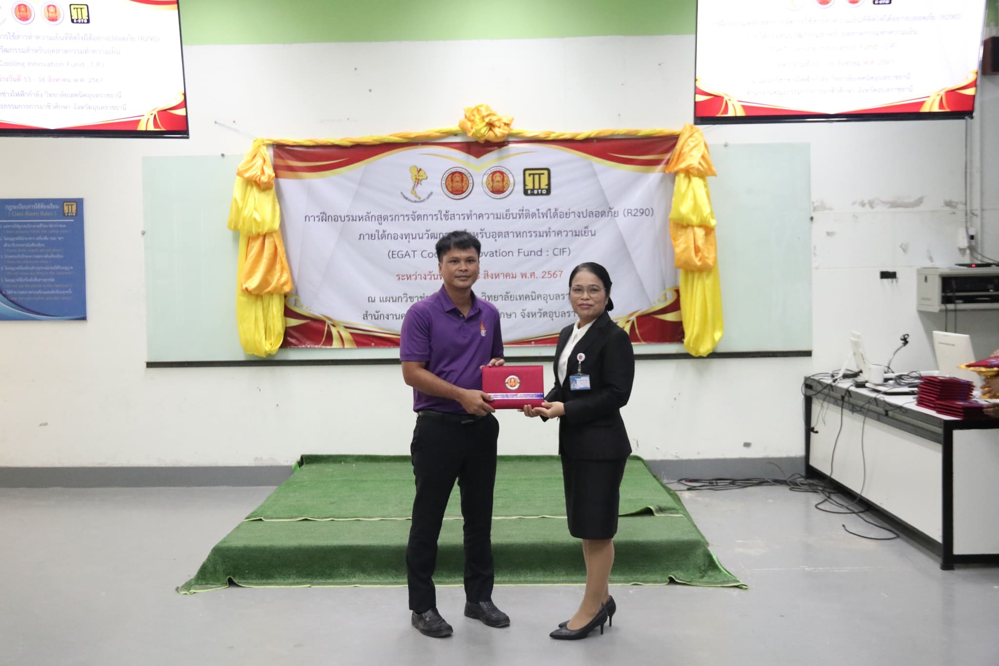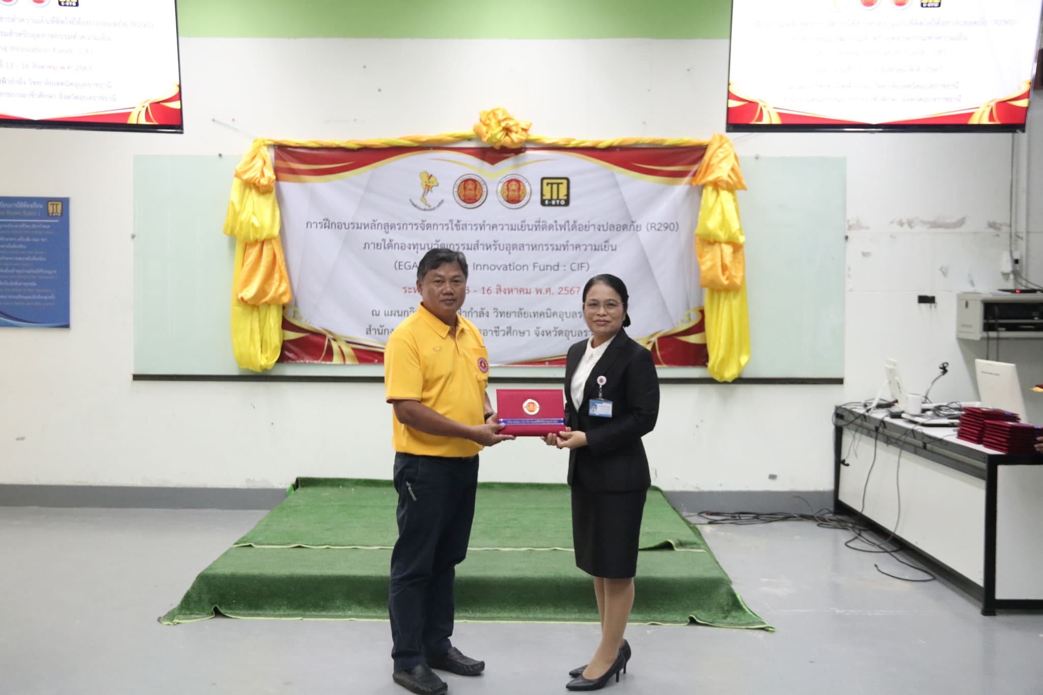 วันที่ ๑๖ สิงหาคม ๒๕๖๗ เวลา ๐๙.๐๐ น. นายธาตรี พิบูลมณฑา ผู้อำนวยการวิทยาลัยเทคนิคอุบลราชธานี มอบหมายให้ นายไวพจน์ ศรีธัญ รองผู้อำนวยการฝ่ายพัฒนากิจการนักเรียนนักศึกษา เป็นประธานในพิธีปิดและมอบเกียรติบัตรแก่คณะวิทยากร ในโครงการฝึกอบรมหลักสูตรการใช้สารทำความเย็นที่ติดไฟได้อย่างปลอดภัย (R290) ภายใต้กองทุนนวัตกรรมสำหรับอุตสาหกรรมทำความเย็น (EGAT Cooling Innovation Fund : CIF) ซึ่งดำเนินการระหว่างวันที่ ๑๓ – ๑๖ สิงหาคม ๒๕๖๗ ณ แผนกวิชาช่างไฟฟ้ากำลัง วิทยาลัยเทคนิคอุบลราชธานี ในการนี้มี นางสาวสายฝน สาระผล รองผู้อำนวยการฝ่ายบริหารทรัพยากร ให้เกียรติเป็นผู้มอบเกียรติบัตรแก่ผู้เข้ารับการอบรม โดยมี นายจำรัส ชนะสิงห์ หัวหน้าแผนกวิชาช่างไฟฟ้ากำลัง และตัวแทนคณะครูจากสถานศึกษาในสังกัดสำนักงานคณะกรรมการการอาชีวศึกษา เข้าร่วมพิธีปิดเเละรับมอบเกียรติบัตรอย่างพร้อมเพรียง ทั้งนี้เพื่อสร้างทักษะ ความรู้ความเข้าใจ และพัฒนาบุคลากรครู ในสังกัด สอศ. ให้เกิดความตระหนักเกี่ยวกับเทคโนโลยีการใช้สารทำความเย็นธรรมชาติและมาตรฐานด้านความปลอดภัย และเตรียมความพร้อมสำหรับรองรับการปรับเปลี่ยนมาใช้สารทำความเย็นธรรมชาติที่เป็นมิตรกับสิ่งแวดล้อมต่อไป