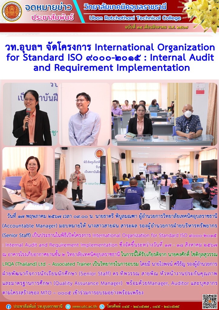 วันที่ ๑๗ พฤษภาคม ๒๕๖๗ เวลา ๐๙.๐๐ น. นายธาตรี พิบูลมณฑา ผู้อำนวยการวิทยาลัยเทคนิคอุบลราชธานี(Accountable Manager) มอบหมายให้ นางสาวสายฝน สาระผล รองผู้อำนวยการฝ่ายบริหารทรัพยากร (Senior Staff) เป็นประธานในพิธีเปิดโครงการ International Organization for Standard ISO ๙๐๐๐-๒๐๑๕ : Internal Audit and Requirement Implementation ซึ่งจัดขึ้นระหว่างวันที่ ๑๗ – ๑๘ สิงหาคม ๒๕๖๗ ณ อาคารโรงเก็บอากาศยานชั้น ๒ วิทยาลัยเทคนิคอุบลราชธานี ในการนี้ได้รับเกียรติจาก นายคงศักดิ์ โชติกุลสุวรรณLRQA (Thailand) Ltd. – Associated Trainer เป็นวิทยากรในการอบรม โดยมี นายไวพจน์ ศรีธัญ รองผู้อำนวยการฝ่ายพัฒนากิจการนักเรียนนักศึกษา (Senior Staff) ดร.ทิพวรรณ สายพิณ หัวหน้างานประกันคุณภาพและมาตรฐานการศึกษา (Quality Assurance Manager) พร้อมด้วยManager, Auditor และบุคลากรตามโครงสร้างของ MTO – ๐๐๐๕ เข้าร่วมการอบรมอย่างพร้อมเพรียง