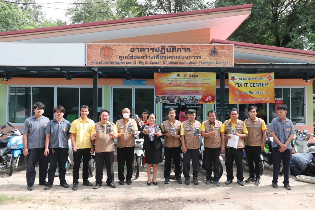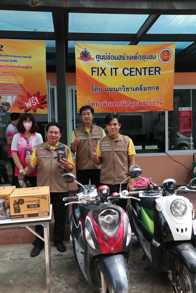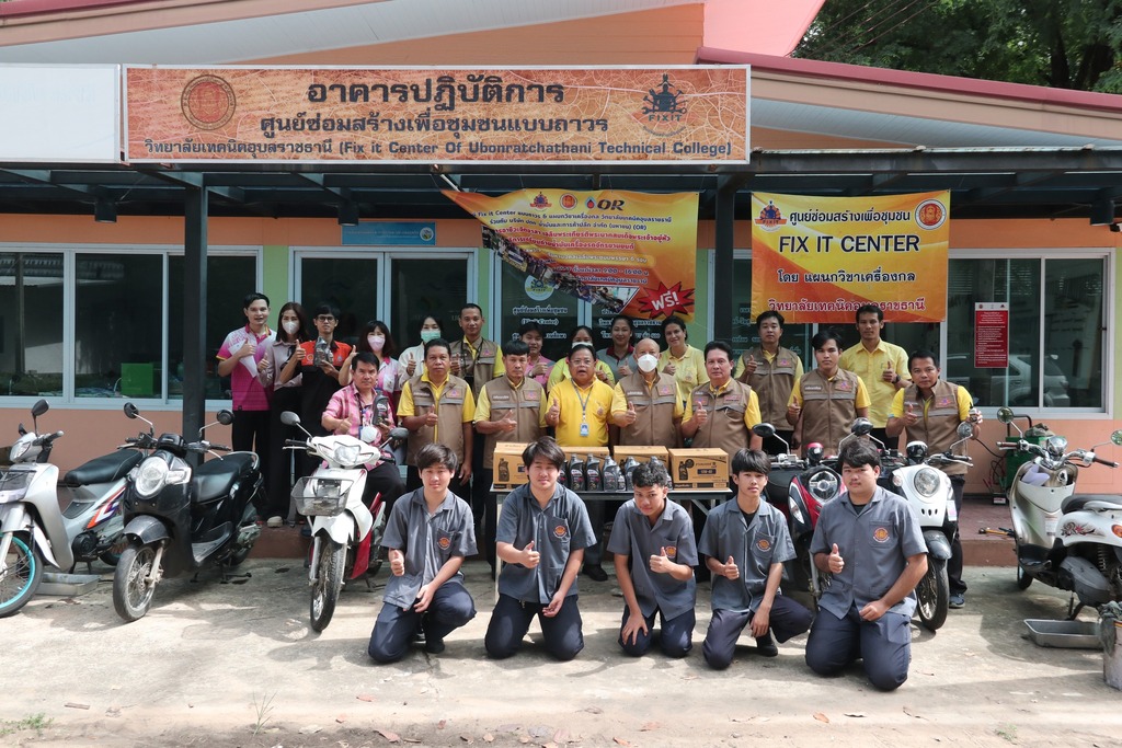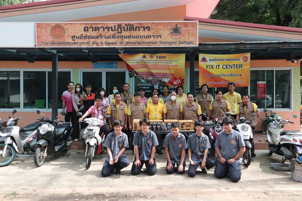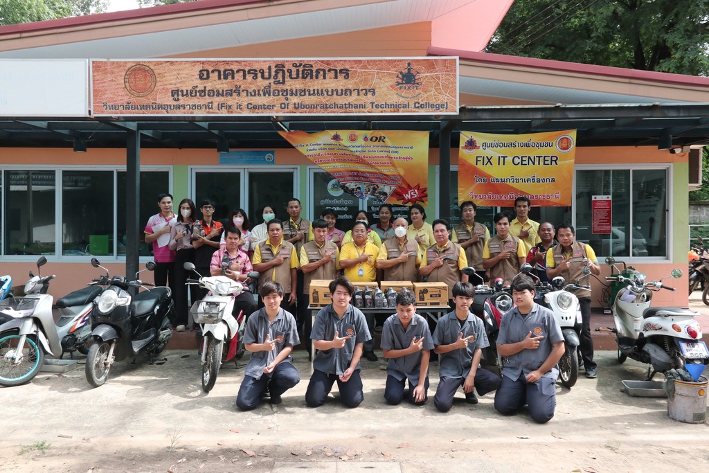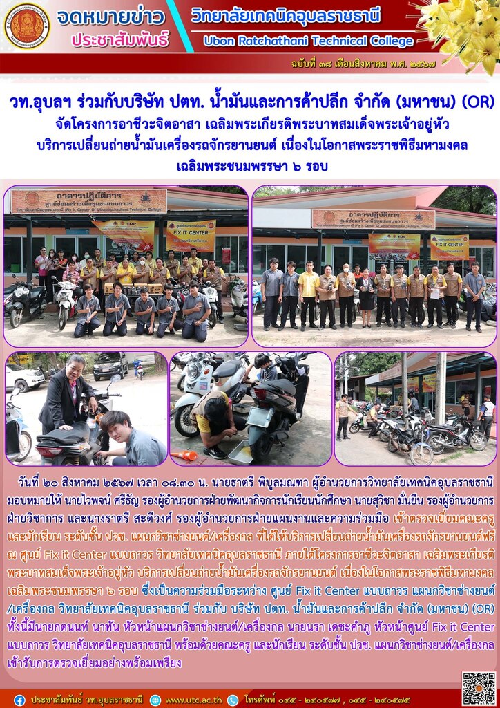 วันที่ ๒๐ สิงหาคม ๒๕๖๗ เวลา ๐๘.๓๐ น. นายธาตรี พิบูลมณฑา ผู้อำนวยการวิทยาลัยเทคนิคอุบลราชธานี มอบหมายให้ นายไวพจน์ ศรีธัญ รองผู้อำนวยการฝ่ายพัฒนากิจการนักเรียนนักศึกษา นายสุวิชา มั่นยืน รองผู้อำนวยการฝ่ายวิชาการ และนางราตรี สะดีวงศ์ รองผู้อำนวยการฝ่ายแผนงานและความร่วมมือ เข้าตรวจเยี่ยมคณะครู และนักเรียน ระดับชั้น ปวช. แผนกวิชาช่างยนต์/เครื่องกล ที่ได้ให้บริการเปลี่ยนถ่ายน้ำมันเครื่องรถจักรยานยนต์ฟรี ณ ศูนย์ Fix it Center แบบถาวร วิทยาลัยเทคนิคอุบลราชธานี ภายใต้โครงการอาชีวจิตอาสา เฉลิมพระเกียรติพระบาทสมเด็จพระเจ้าอยู่หัว บริการเปลี่ยนถ่ายน้ำมันเครื่องรถจักรยานยนต์ เนื่องในโอกาสพระราชพิธีมหามงคลเฉลิมพระชนมพรรษา ๖ รอบ ซึ่งเป็นความร่วมมือระหว่าง ศูนย์ Fix it Center แบบถาวร แผนกวิชาช่างยนต์/เครื่องกล วิทยาลัยเทคนิคอุบลราชธานี ร่วมกับ บริษัท ปตท. น้ำมันและการค้าปลีก จำกัด (มหาชน) (OR)ทั้งนี้มีนายกตนนท์ นาทัน หัวหน้าแผนกวิชาช่างยนต์/เครื่องกล นายนรา เดชะคำภู หัวหน้าศูนย์ Fix it Center แบบถาวร วิทยาลัยเทคนิคอุบลราชธานี พร้อมด้วยคณะครู และนักเรียน ระดับชั้น ปวช. แผนกวิชาช่างยนต์/เครื่องกล เข้ารับการตรวจเยี่ยมอย่างพร้อมเพรียง