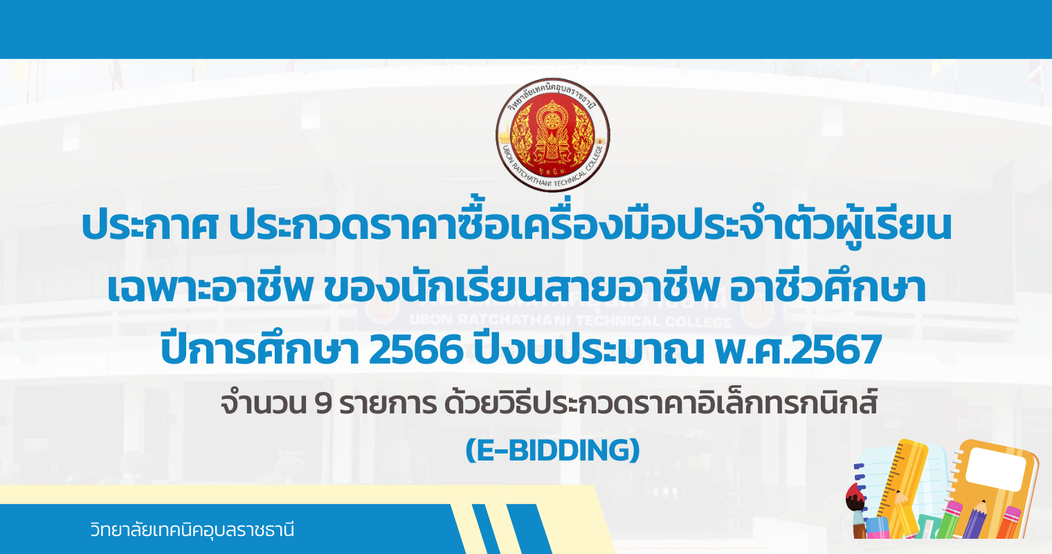 ประกาศ ประกวดราคาซื้อเครื่องมือประจำตัวผู้เรียนเฉพาะอาชีพ ของนักเรียนสายอาชีพ อาชีวศึกษา ปีการศึกษา 2566 ปีงบประมาณ พ.ศ.2567 จำนวน 9 รายการ ด้วยวิธีประกวดราคาอิเล็กทรกนิกส์ (e-bidding)