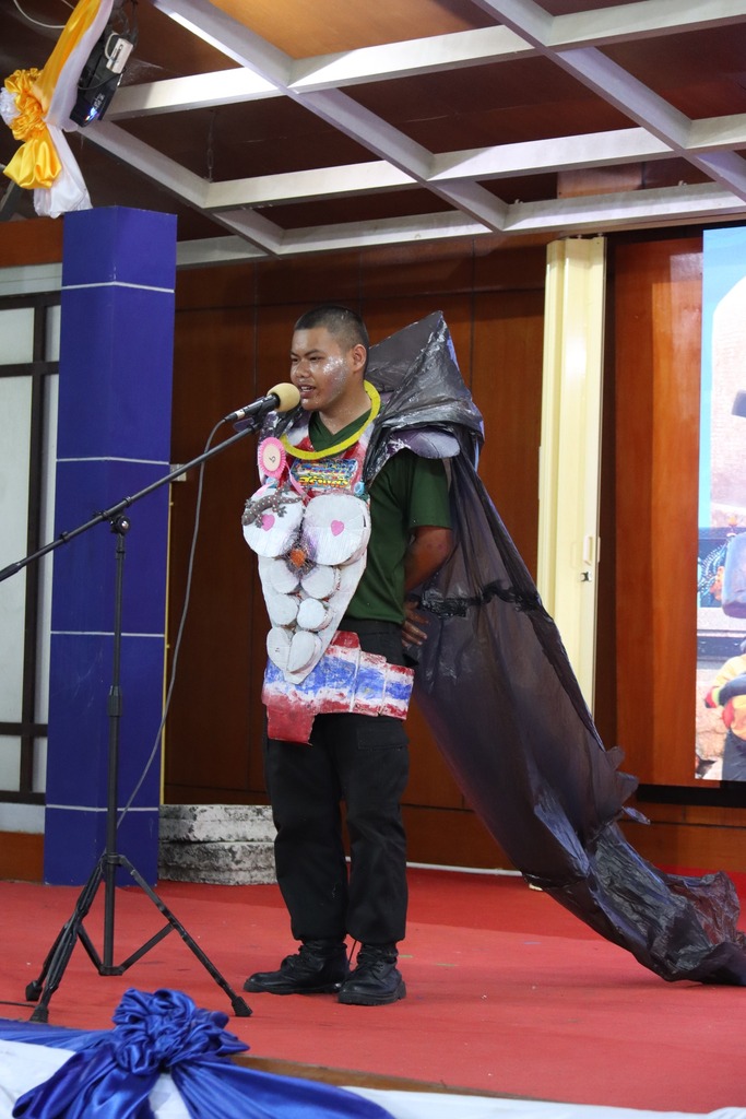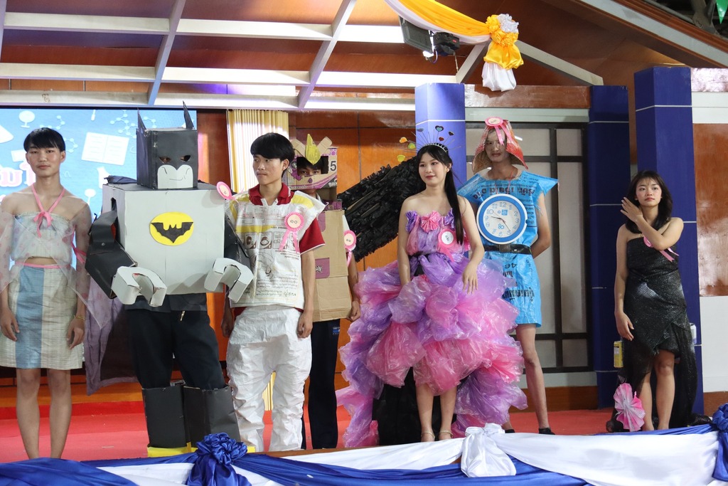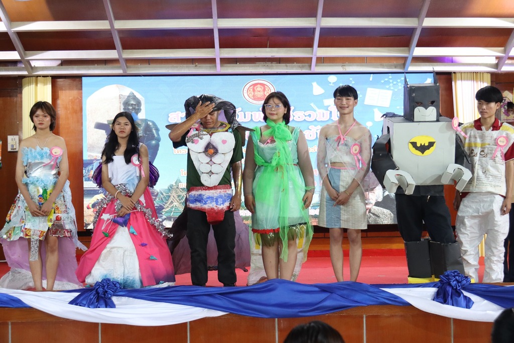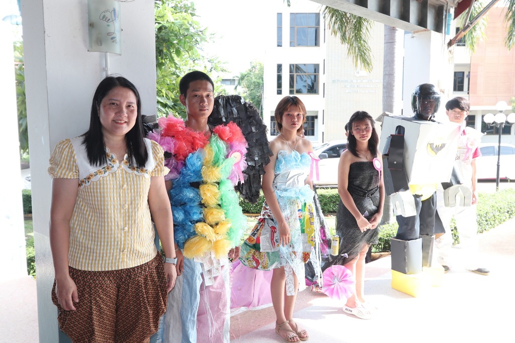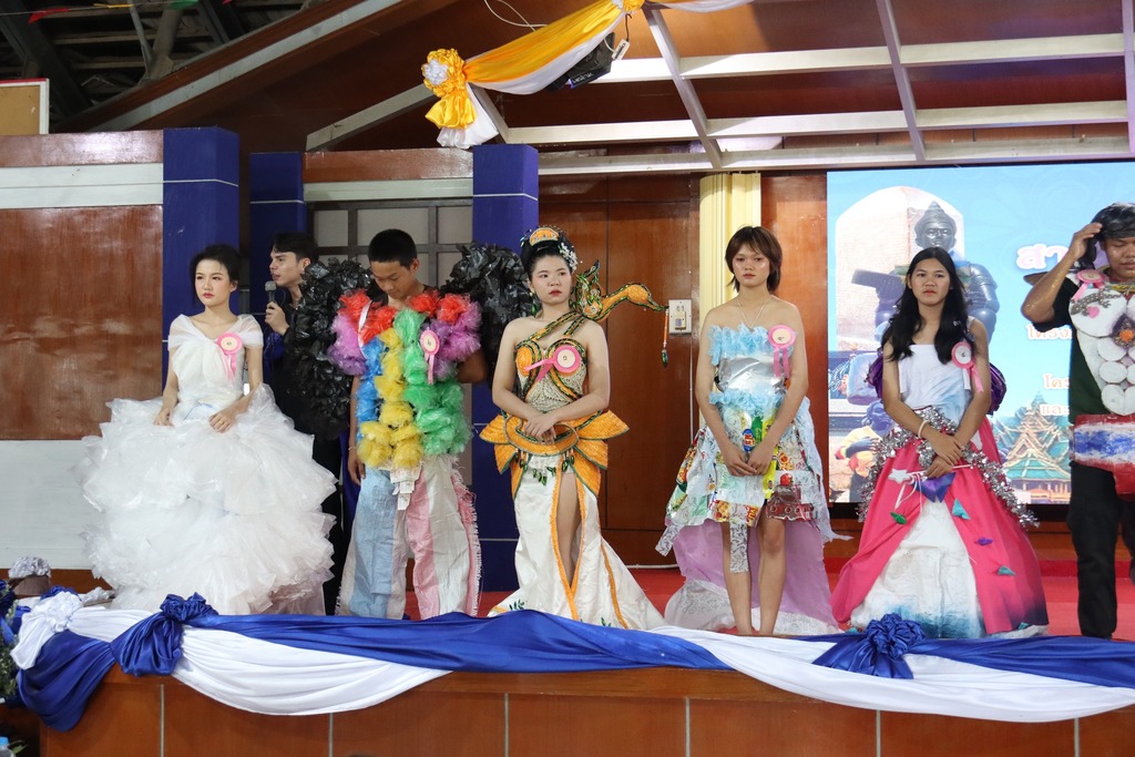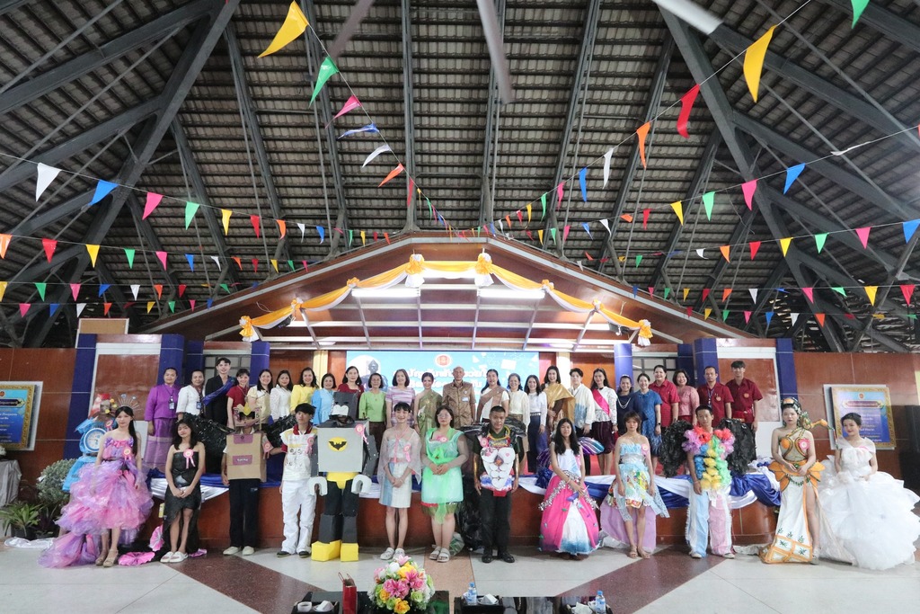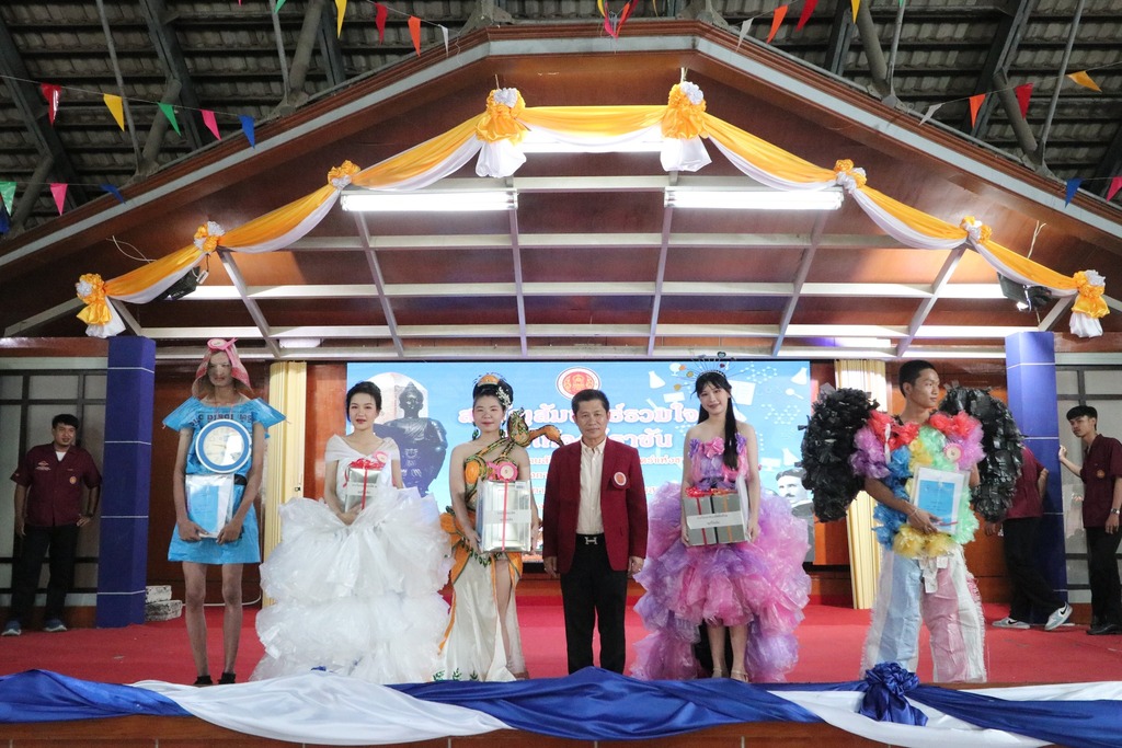 อย่างพร้อมเพรียง ต่อมาเวลา ๑๑.๐๐ น. นายธาตรี พิบูลมณฑา ผู้อำนวยการวิทยาลัยเทคนิคอุบลราชธานี ได้ให้เกียรติมอบเกียรติบัตรผู้ที่ได้รับรางวัลจากการประกวดชุดรีไซเคิล พร้อมกับเยี่ยมชมและให้กำลังใจ