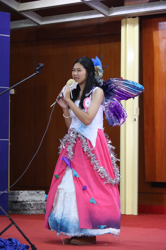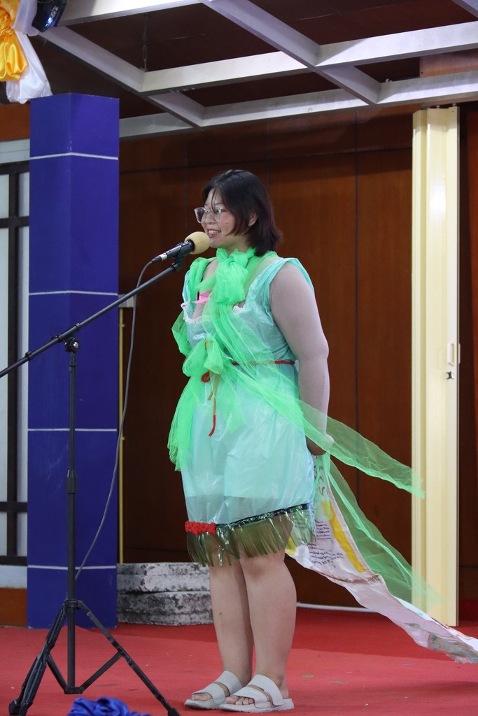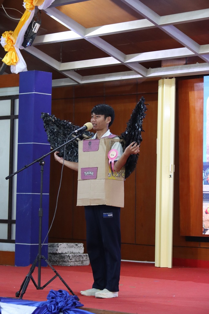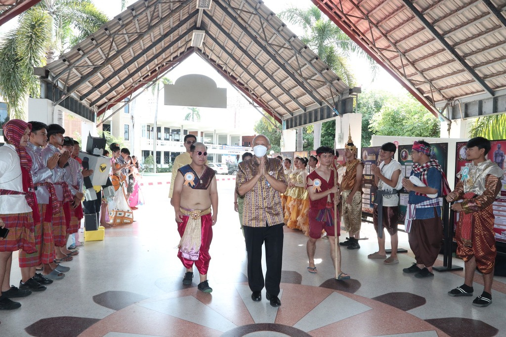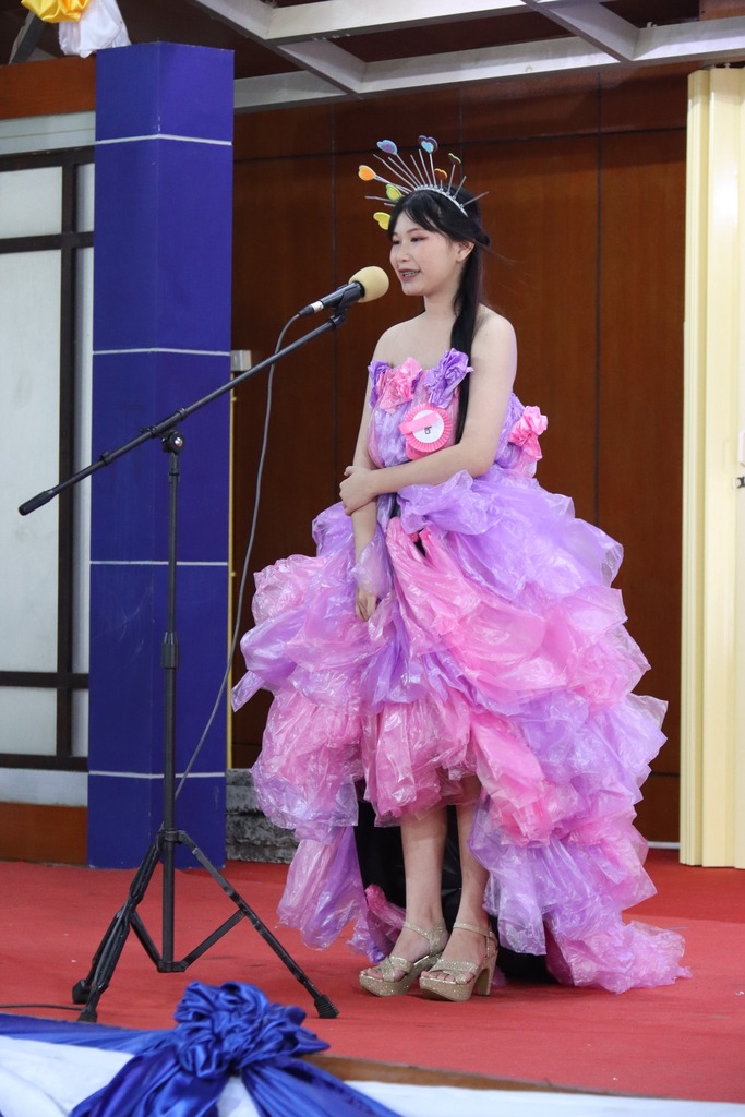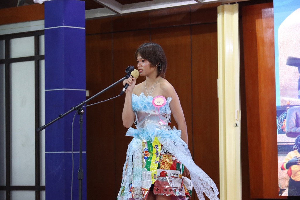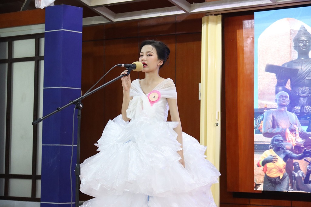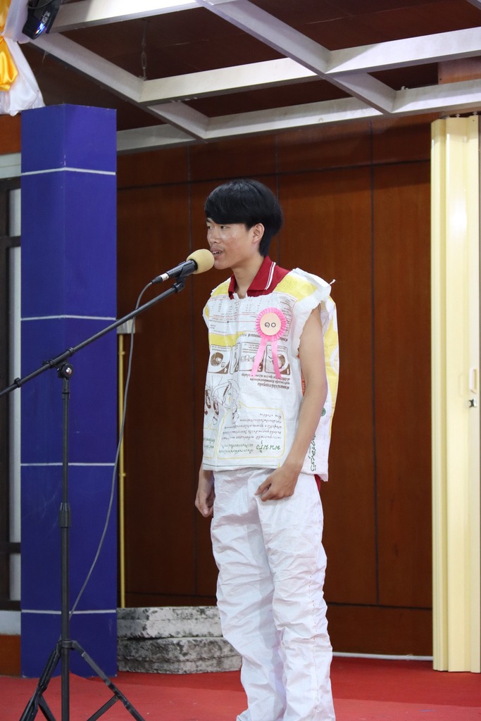 อย่างพร้อมเพรียง ต่อมาเวลา ๑๑.๐๐ น. นายธาตรี พิบูลมณฑา ผู้อำนวยการวิทยาลัยเทคนิคอุบลราชธานี ได้ให้เกียรติมอบเกียรติบัตรผู้ที่ได้รับรางวัลจากการประกวดชุดรีไซเคิล พร้อมกับเยี่ยมชมและให้กำลังใจ