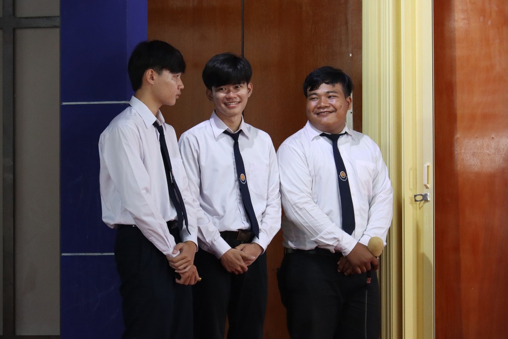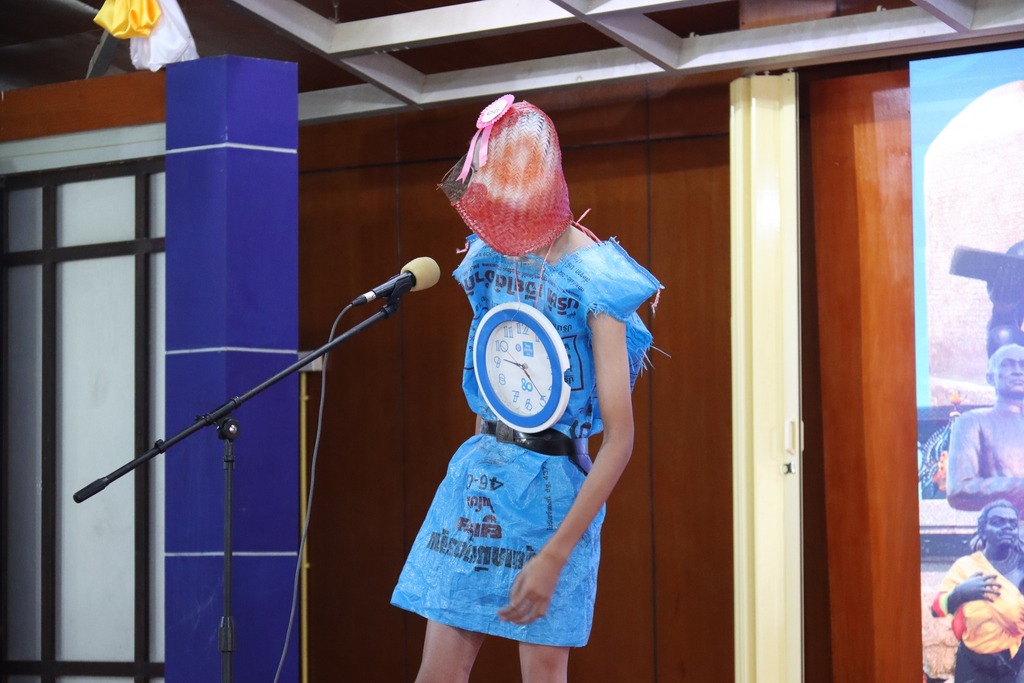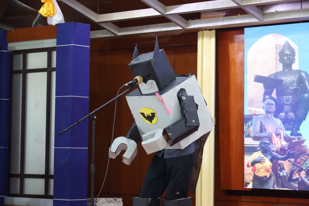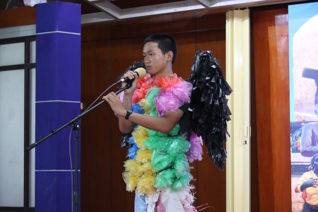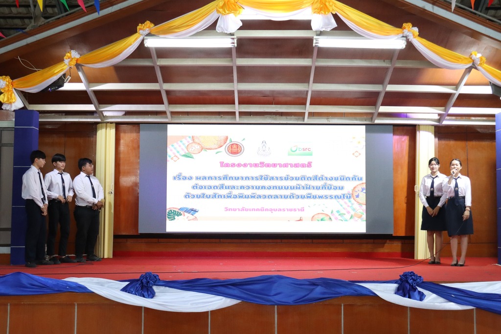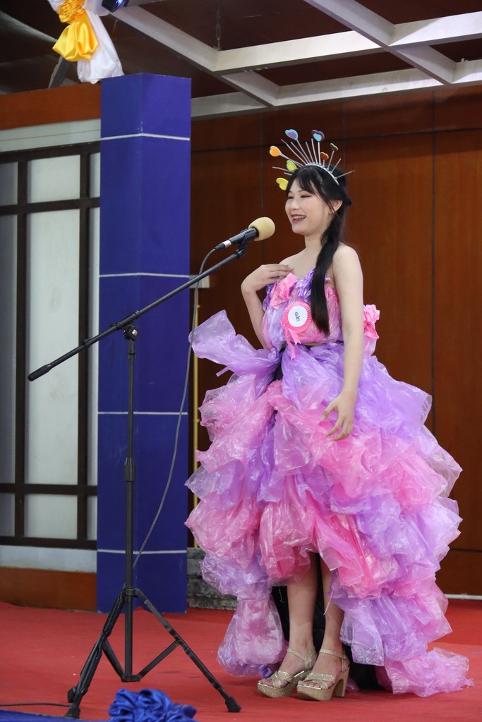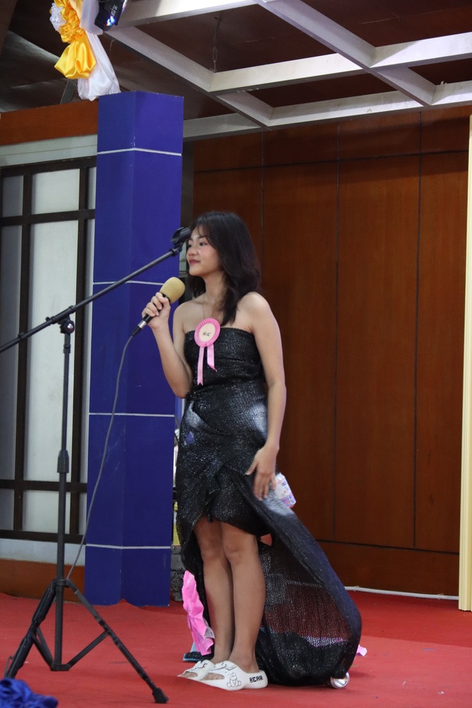 อย่างพร้อมเพรียง ต่อมาเวลา ๑๑.๐๐ น. นายธาตรี พิบูลมณฑา ผู้อำนวยการวิทยาลัยเทคนิคอุบลราชธานี ได้ให้เกียรติมอบเกียรติบัตรผู้ที่ได้รับรางวัลจากการประกวดชุดรีไซเคิล พร้อมกับเยี่ยมชมและให้กำลังใจ