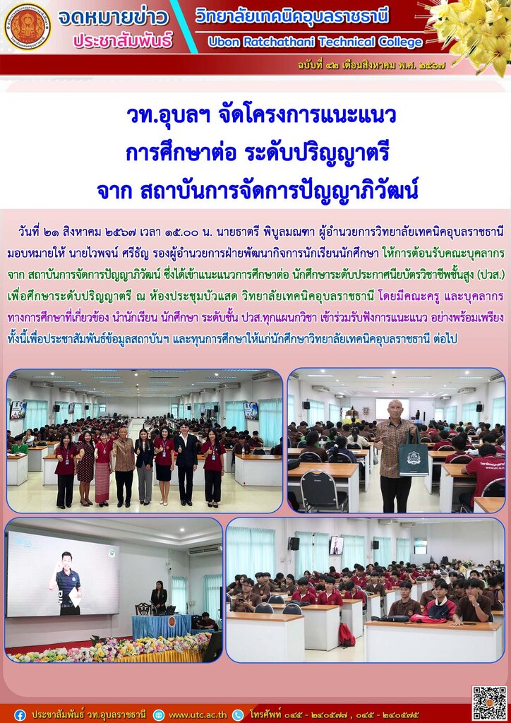 วันที่ ๒๑ สิงหาคม ๒๕๖๗ เวลา ๑๕.๐๐ น. นายธาตรี พิบูลมณฑา ผู้อำนวยการวิทยาลัยเทคนิคอุบลราชธานี มอบหมายให้ นายไวพจน์ ศรีธัญ รองผู้อำนวยการฝ่ายพัฒนากิจการนักเรียนนักศึกษา ให้การต้อนรับคณะบุคลากรจาก สถาบันการจัดการปัญญาภิวัฒน์ ซึ่งได้เข้าแนะแนวการศึกษาต่อ นักศึกษาระดับประกาศนียบัตรวิชาชีพชั้นสูง (ปวส.)เพื่อศึกษาระดับปริญญาตรี ณ ห้องประชุมบัวแสด วิทยาลัยเทคนิคอุบลราชธานี โดยมีคณะครู และบุคลากรทางการศึกษาที่เกี่ยวข้อง นำนักเรียน นักศึกษา ระดับชั้น ปวส.ทุกแผนกวิชา เข้าร่วมรับฟังการแนะแนว อย่างพร้อมเพรียงทั้งนี้เพื่อประชาสัมพันธ์ข้อมูลสถาบันฯ และทุนการศึกษาให้แก่นักศึกษาวิทยาลัยเทคนิคอุบลราชธานี ต่อไป