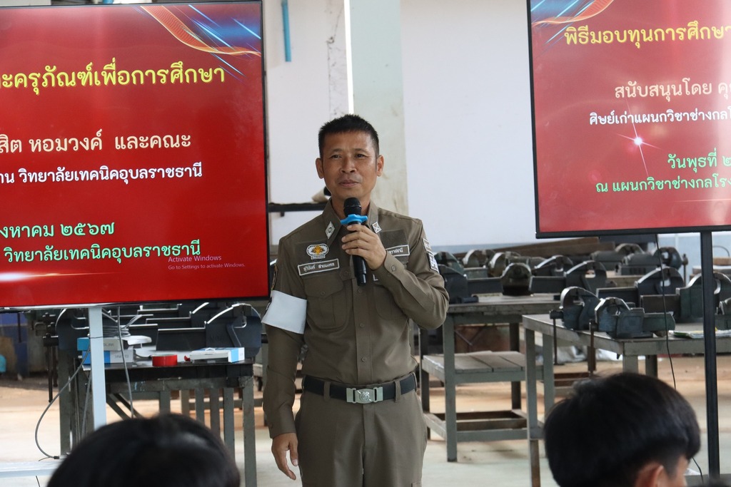 วันที่ ๒๘ สิงหาคม ๒๕๖๗ เวลา ๑๑.๐๐ น. นายธาตรี พิบูลมณฑา ผู้อำนวยการวิทยาลัยเทคนิคอุบลราชธานี ให้เกียรติกล่าวต้อนรับ พร้อมนำคณะครู และนักเรียน นักศึกษา แผนกวิชาช่างกลโรงงาน เข้าร่วมพิธีมอบทุนการศึกษาและครุภัณฑ์เพื่อการศึกษา ณ แผนกวิชาช่างกลโรงงาน ในการนี้ได้รับเกียรติจาก นายดุสิต หอมวงค์ ศิษย์เก่าแผนกวิชาช่างกลโรงงานวิทยาลัยเทคนิคอุบลราชธานี และคณะ เป็นผู้มอบทุนการศึกษาและครุภัณฑ์เพื่อการศึกษา ทั้งนี้มี นายสุวิชา มั่นยืน รองผู้อำนวยการฝ่ายวิชาการ นายบัณฑิตย์ เหลาทอง หัวหน้าแผนกวิชาช่างกลโรงงาน พร้อมด้วยคณะครู และนักเรียน นักศึกษา แผนกวิชาช่างกลโรงงาน เข้ารับทุนการศึกษาและครุภัณฑ์เพื่อการศึกษาอย่างพร้อมเพรียง
