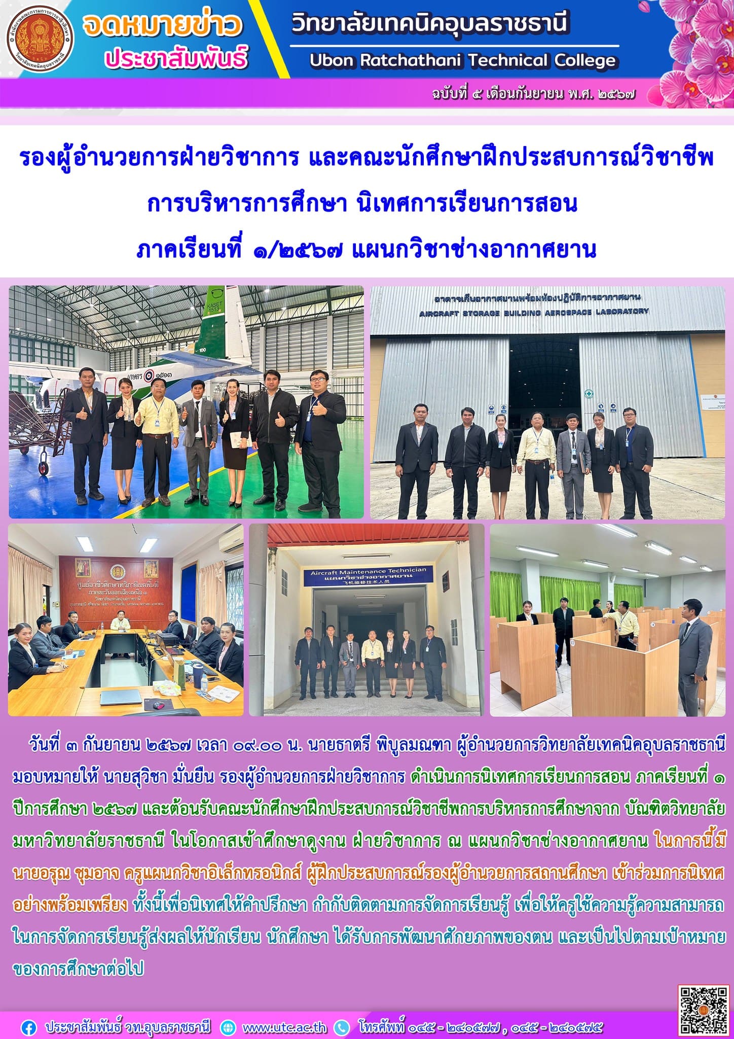 วันที่ ๓ กันยายน ๒๕๖๗ เวลา ๐๙.๐๐ น. นายธาตรี พิบูลมณฑา ผู้อำนวยการวิทยาลัยเทคนิคอุบลราชธานีมอบหมายให้ นายสุวิชา มั่นยืน รองผู้อำนวยการฝ่ายวิชาการ ดำเนินการนิเทศการเรียนการสอน ภาคเรียนที่ ๑ปีการศึกษา ๒๕๖๗ และต้อนรับคณะนักศึกษาฝึกประสบการณ์วิชาชีพการบริหารการศึกษาจาก บัณฑิตวิทยาลัยมหาวิทยาลัยราชธานี ในโอกาสเข้าศึกษาดูงาน ฝ่ายวิชาการ ณ แผนกวิชาช่างอากาศยาน ในการนี้มี นายอรุณ ชุมอาจ ครูแผนกวิชาอิเล็กทรอนิกส์ ผู้ฝึกประสบการณ์รองผู้อำนวยการสถานศึกษา เข้าร่วมการนิเทศอย่างพร้อมเพรียง ทั้งนี้เพื่อนิเทศให้คำปรึกษา กำกับติดตามการจัดการเรียนรู้ เพื่อให้ครูใช้ความรู้ความสามารถในการจัดการเรียนรู้ส่งผลให้นักเรียน นักศึกษา ได้รับการพัฒนาศักยภาพของตน และเป็นไปตามเป้าหมายของการศึกษาต่อไป