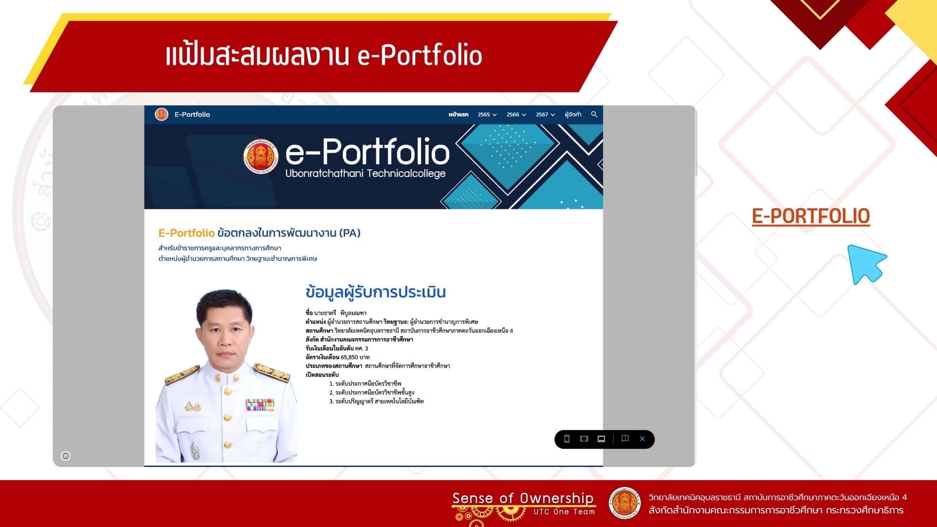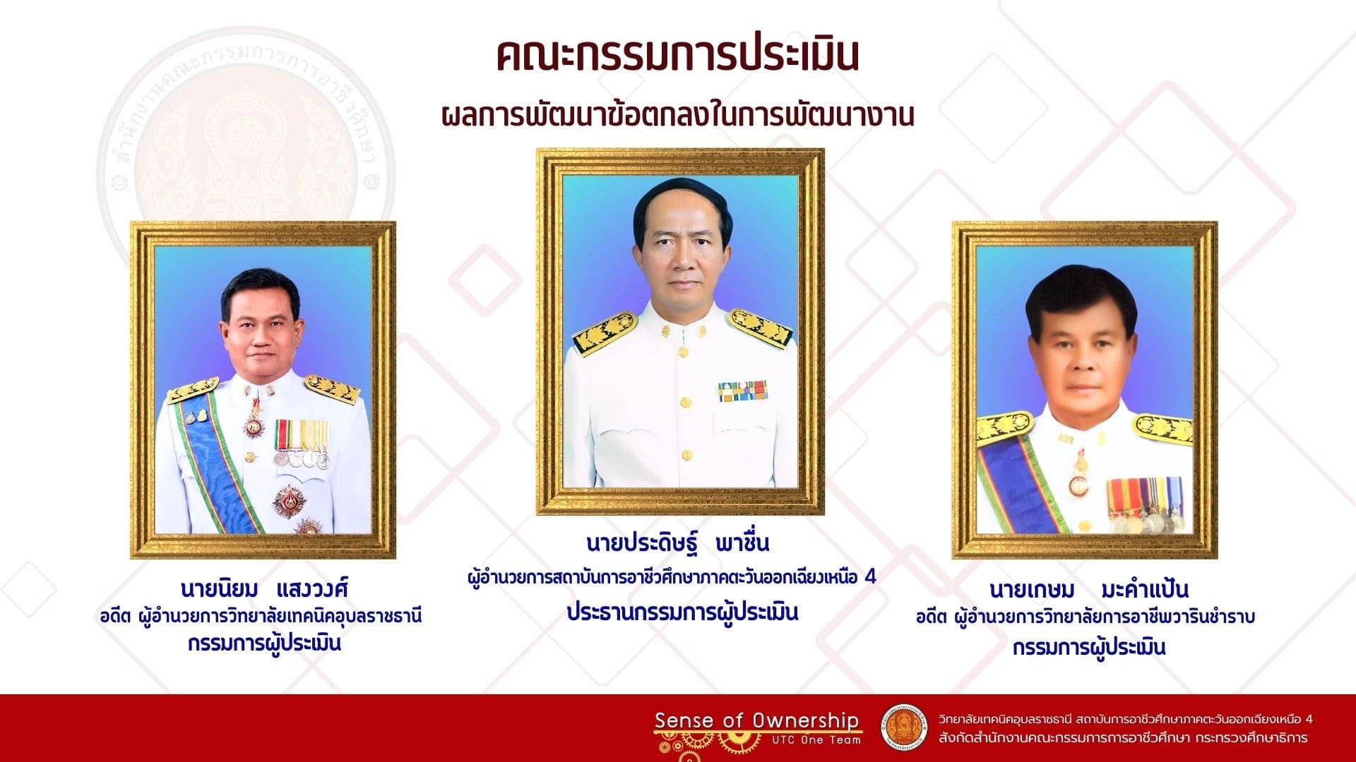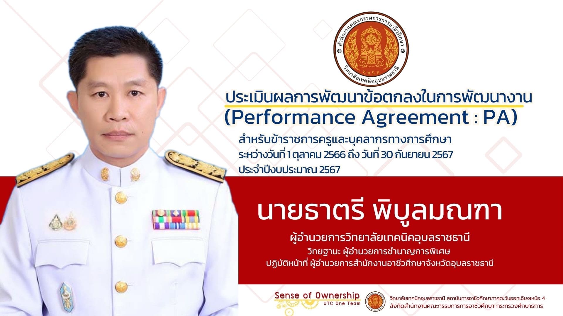 วันที่ ๔ กันยายน ๒๕๖๗ เวลา ๐๙.๐๐ น. นายธาตรี พิบูลมณฑา ผู้อำนวยการวิทยาลัยเทคนิคอุบลราชธานี เข้ารับการประเมินผลการพัฒนางานตามข้อตกลง (Performance Agreement : PA) สำหรับข้าราชการครูและบุคลากรทางการศึกษา ตำแหน่ง ผู้บริหารสถานศึกษา วิทยฐานะ ผู้อำนวยการชำนาญการพิเศษ ประจำปีงบประมาณ พ.ศ. ๒๕๖๗ ณ ห้องประชุมบัวแดง วิทยาลัยเทคนิคอุบลราชธานี ในการนี้ได้รับเกียรติจากนายประดิษฐ์ พาชื่น ผู้อำนวยการสถาบันการอาชีวศึกษาภาคตะวันออกเฉียงเหนือ ๔ เป็นประธานกรรมการผู้ประเมิน โดยมี นายนิยม แสงวงศ์ อดีตผู้อำนวยการวิทยาลัยเทคนิคอุบลราชธานี และนายเกษม มะคำแป้นอดีตผู้อำนวยการวิทยาลัยการอาชีพวารินชำราบ ร่วมเป็นกรรมการผู้ประเมิน ทั้งนี้มีนางสาวสายฝน สาระผลรองผู้อำนวยการฝ่ายบริหารทรัพยากร คณะครู และบุคลากรทางการศึกษาที่เกี่ยวข้อง เข้าร่วมการประเมินอย่างพร้อมเพรียง