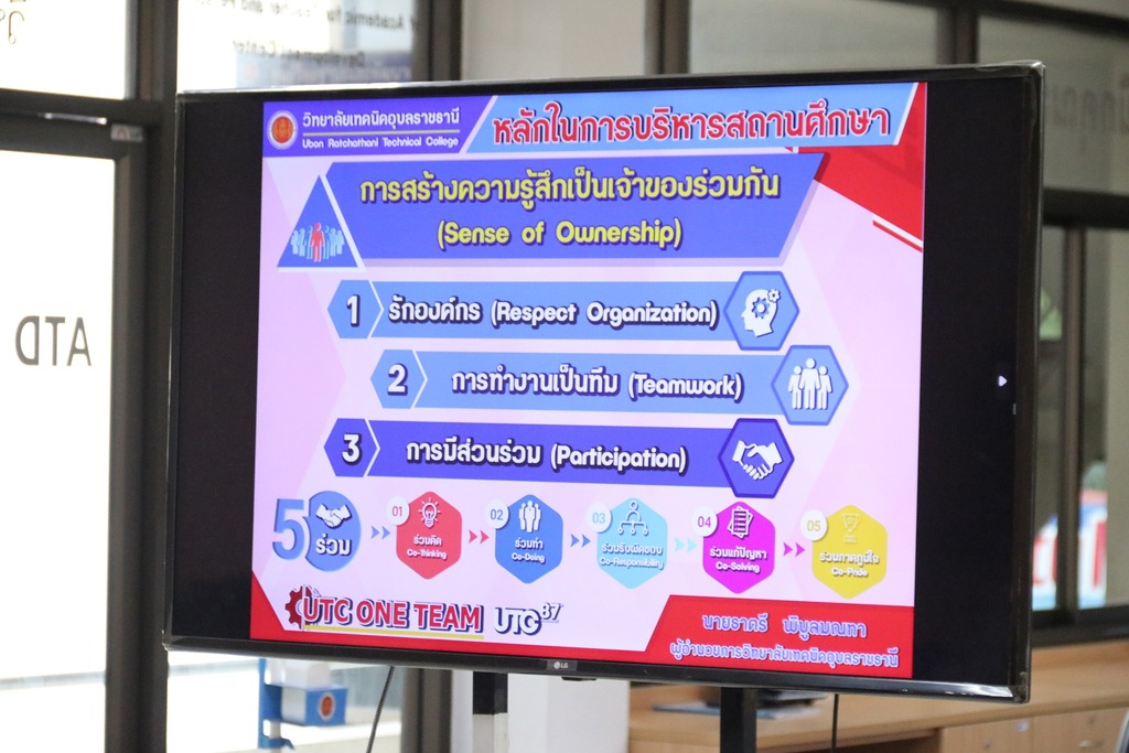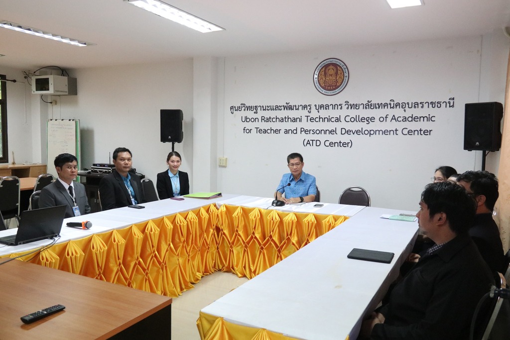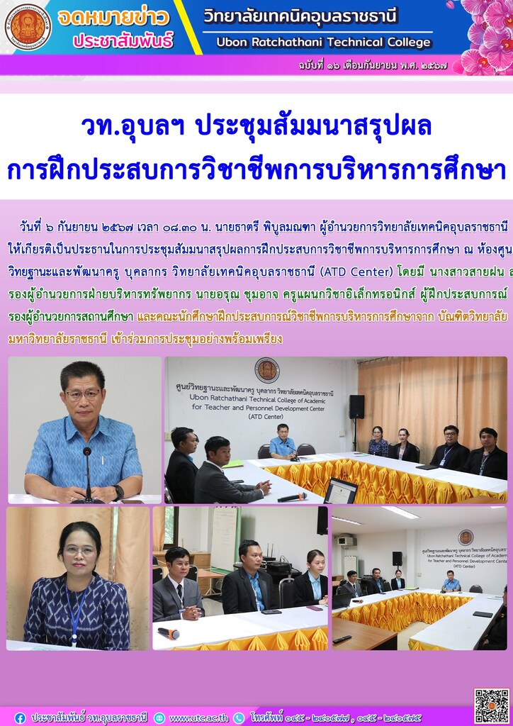 วันที่ ๖ กันยายน ๒๕๖๗ เวลา ๐๘.๓๐ น. นายธาตรี พิบูลมณฑา ผู้อำนวยการวิทยาลัยเทคนิคอุบลราชธานี ให้เกียรติเป็นประธานในการประชุมสัมมนาสรุปผลการฝึกประสบการวิชาชีพการบริหารการศึกษา ณ ห้องศูนย์วิทยฐานะและพัฒนาครู บุคลากร วิทยาลัยเทคนิคอุบลราชธานี (ATD Center) โดยมี นางสาวสายฝน สาระผล รองผู้อำนวยการฝ่ายบริหารทรัพยากร นายอรุณ ชุมอาจ ครูแผนกวิชาอิเล็กทรอนิกส์ ผู้ฝึกประสบการณ์รองผู้อำนวยการสถานศึกษา และคณะนักศึกษาฝึกประสบการณ์วิชาชีพการบริหารการศึกษาจาก บัณฑิตวิทยาลัยมหาวิทยาลัยราชธานี เข้าร่วมการประชุมอย่างพร้อมเพรียง