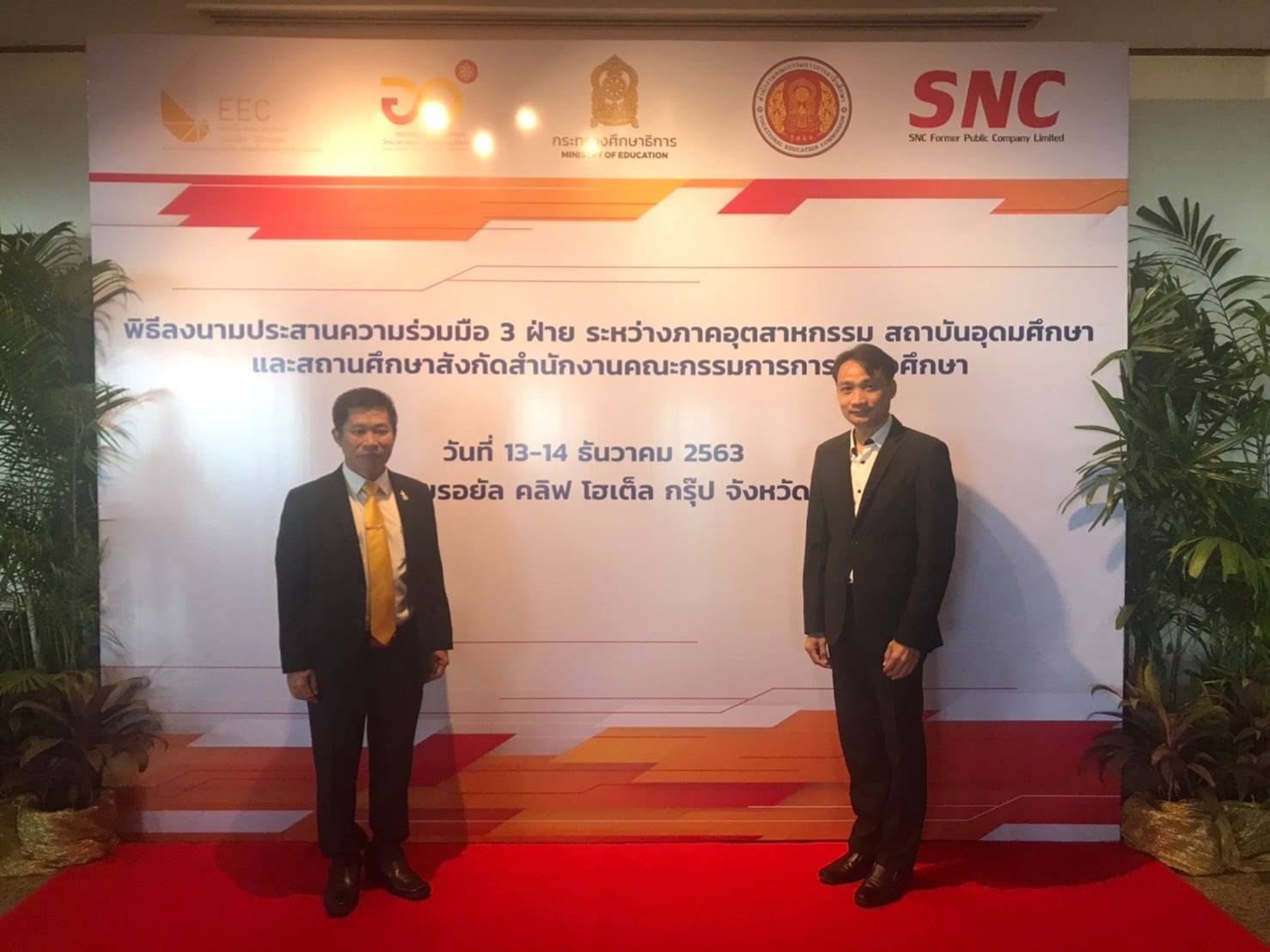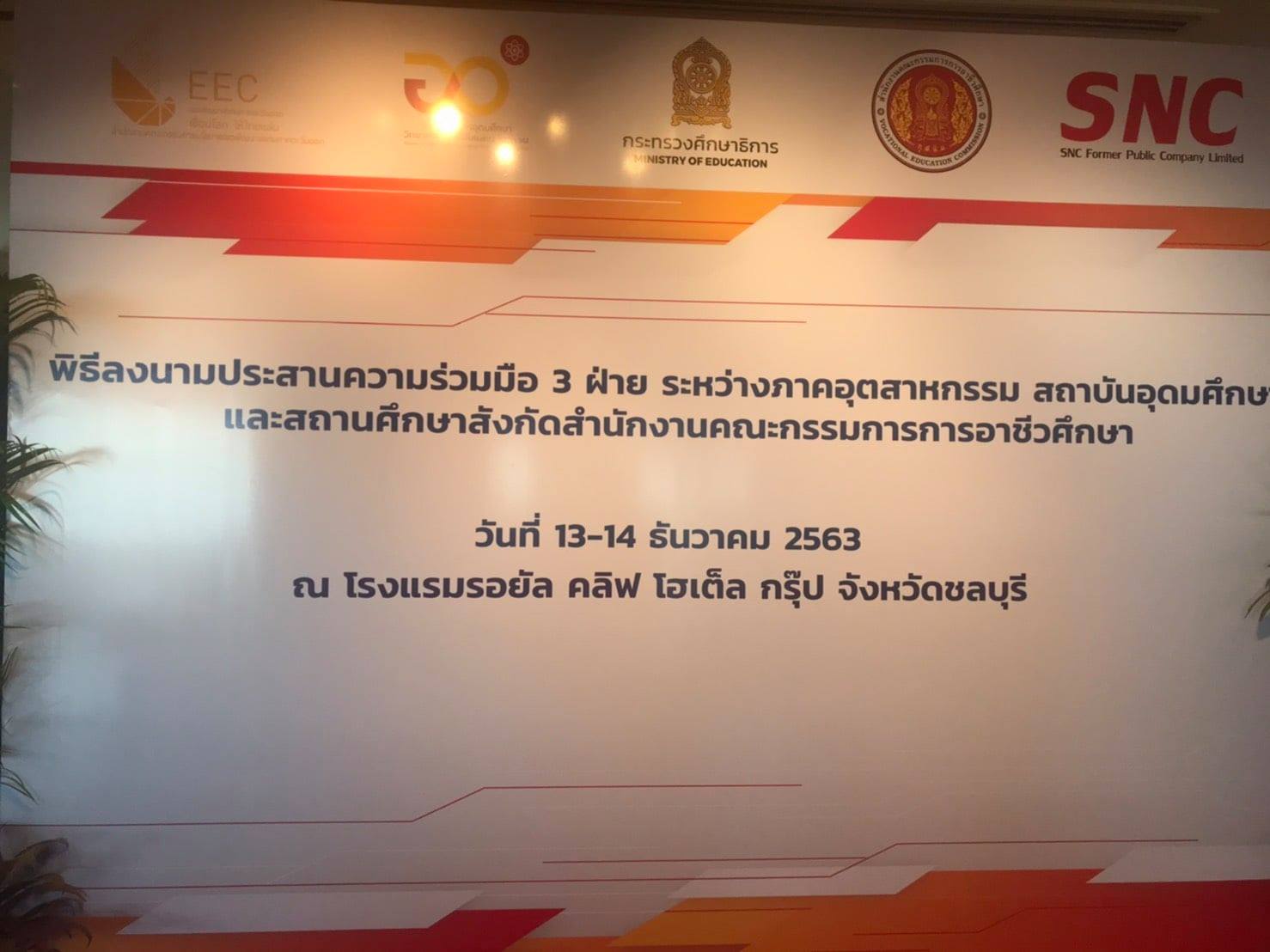 นายธาตรี พิบูลมณฑา ผู้อำนวยการวิทยาลัยเทคนิคอุบลราชธานี พร้อมนายวิเชียร กำทอง หัวหน้างานอาชีวศึกษาระบบทวิภาคี เข้าร่วมพิธีลงนามประสานความร่วมมือ ๓ ฝ่าย ระหว่างภาคอุตสาหกรรม สถาบันอุดมศึกษา และสถานศึกษาสังกัดสำนักงานคณะกรรมการการอาชีวศึกษา วิทยาลัยเทคนิคอุบลราชธานี กับ บริษัท เอส เอ็น ซี ฟอร์เมอร์ จำกัด (มหาชน) เพื่อพัฒนาบุคลากรและการศึกษาภาคอุตสาหกรรม ต่อยอดความสำเร็จ รองรับ EEC Industry (โครงการเขตพัฒนาพิเศษภาคตะวันออก แผนยุทธศาสตร์ภายใต้ ไทยแลนด์ ๔.๐ ) การลงนามดังกล่าวจัดขึ้นระหว่างวันที่ ๑๓ – ๑๔ ธันวาคม ๒๕๖๓ ณ โรงแรม รอยัล คลิฟ โฮเต็ล กรุ๊ป จังหวัดชลบุรี