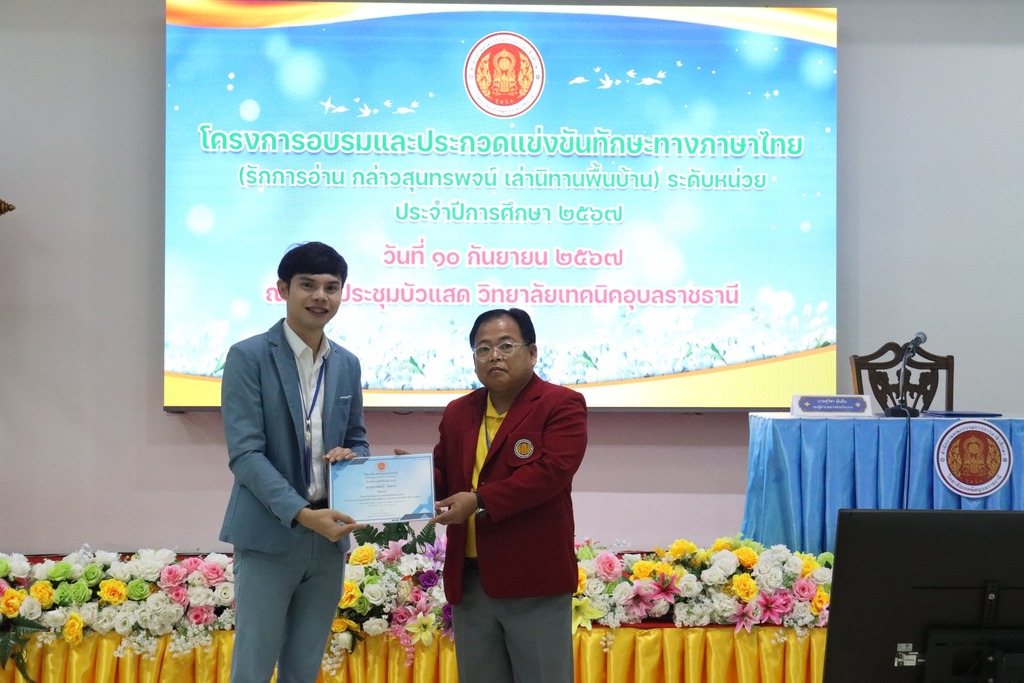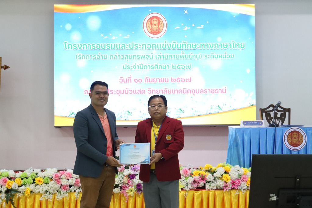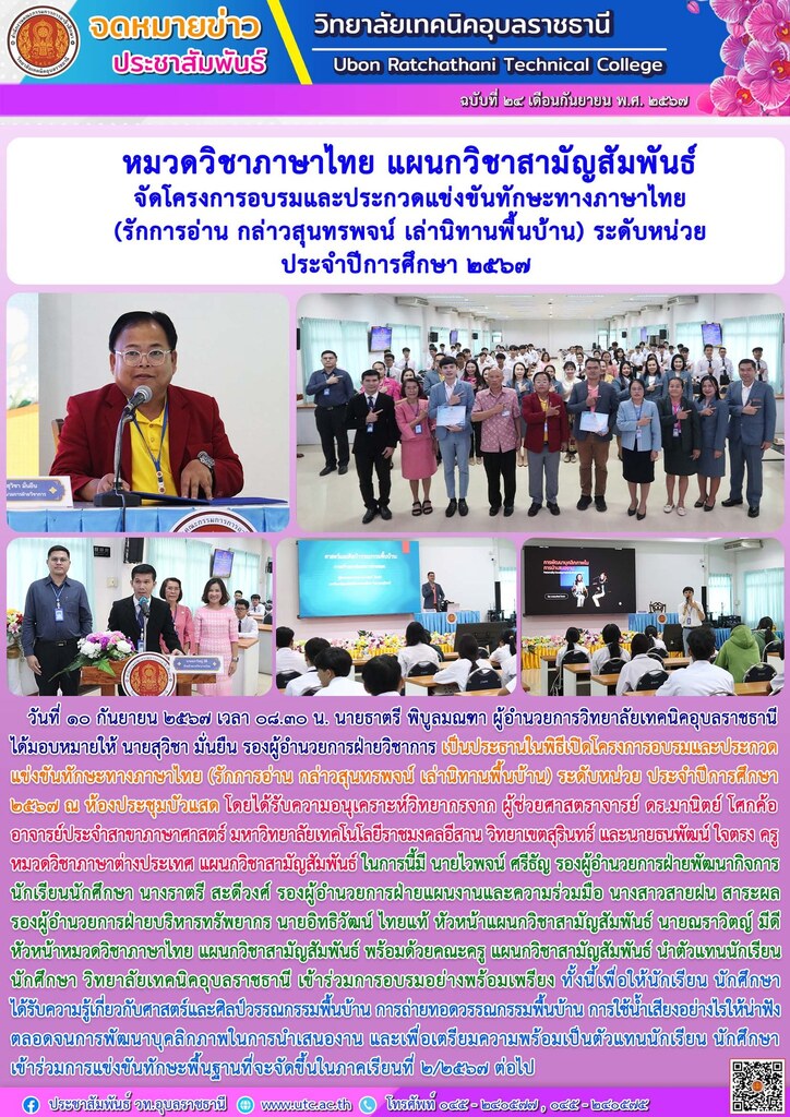 วันที่ ๑๐ กันยายน ๒๕๖๗ เวลา ๐๘.๓๐ น. นายธาตรี พิบูลมณฑา ผู้อำนวยการวิทยาลัยเทคนิคอุบลราชธานี ได้มอบหมายให้ นายสุวิชา มั่นยืน รองผู้อำนวยการฝ่ายวิชาการ เป็นประธานในพิธีเปิดโครงการอบรมและประกวดแข่งขันทักษะทางภาษาไทย (รักการอ่าน กล่าวสุนทรพจน์ เล่านิทานพื้นบ้าน) ระดับหน่วย ประจำปีการศึกษา ๒๕๖๗ ณ ห้องประชุมบัวแสด โดยได้รับความอนุเคราะห์วิทยากรจาก ผู้ช่วยศาสตราจารย์ ดร.มานิตย์ โศกค้อ อาจารย์ประจำสาขาภาษาศาสตร์ มหาวิทยาลัยเทคโนโลยีราชมงคลอีสาน วิทยาเขตสุรินทร์ และนายธนพัฒน์ ใจตรง ครูหมวดวิชาภาษาต่างประเทศ แผนกวิชาสามัญสัมพันธ์ ในการนี้มี นายไวพจน์ ศรีธัญ รองผู้อำนวยการฝ่ายพัฒนากิจการนักเรียนนักศึกษา นางราตรี สะดีวงศ์ รองผู้อำนวยการฝ่ายแผนงานและความร่วมมือ นางสาวสายฝน สาระผล รองผู้อำนวยการฝ่ายบริหารทรัพยากร นายอิทธิวัฒน์ ไทยแท้ หัวหน้าแผนกวิชาสามัญสัมพันธ์ นายณราวิตญ์ มีดี หัวหน้าหมวดวิชาภาษาไทย แผนกวิชาสามัญสัมพันธ์ พร้อมด้วยคณะครู แผนกวิชาสามัญสัมพันธ์ นำตัวแทนนักเรียน นักศึกษา วิทยาลัยเทคนิคอุบลราชธานี เข้าร่วมการอบรมอย่างพร้อมเพรียง ทั้งนี้เพื่อให้นักเรียน นักศึกษา ได้รับความรู้เกี่ยวกับศาสตร์และศิลป์วรรณกรรมพื้นบ้าน การถ่ายทอดวรรณกรรมพื้นบ้าน การใช้น้ำเสียงอย่างไรให้น่าฟัง ตลอดจนการพัฒนาบุคลิกภาพในการนำเสนองาน และเพื่อเตรียมความพร้อมเป็นตัวแทนนักเรียน นักศึกษา เข้าร่วมการแข่งขันทักษะพื้นฐานที่จะจัดขึ้นในภาคเรียนที่ ๒/๒๕๖๗ ต่อไป