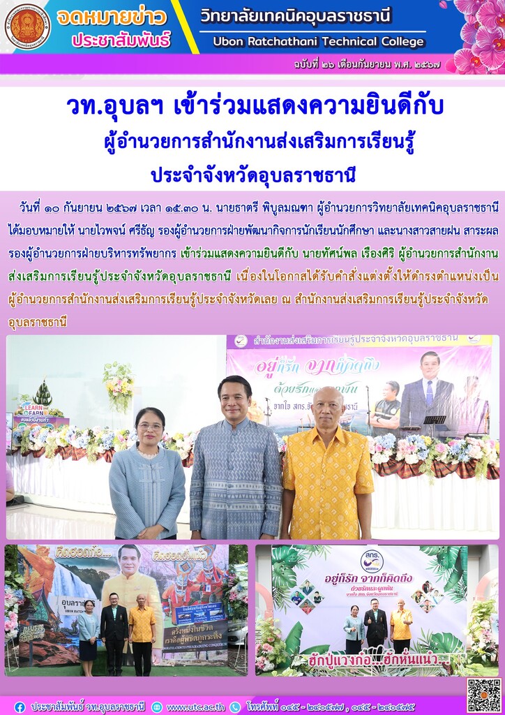 วันที่ ๑๐ กันยายน ๒๕๖๗ เวลา ๑๕.๓๐ น. นายธาตรี พิบูลมณฑา ผู้อำนวยการวิทยาลัยเทคนิคอุบลราชธานี ได้มอบหมายให้ นายไวพจน์ ศรีธัญ รองผู้อำนวยการฝ่ายพัฒนากิจการนักเรียนนักศึกษา และนางสาวสายฝน สาระผล รองผู้อำนวยการฝ่ายบริหารทรัพยากร เข้าร่วมแสดงความยินดีกับ นายทัศน์พล เรืองศิริ ผู้อำนวยการสำนักงานส่งเสริมการเรียนรู้ประจำจังหวัดอุบลราชธานี เนื่องในโอกาสได้รับคำสั่งแต่งตั้งให้ดำรงตำแหน่งเป็น ผู้อำนวยการสำนักงานส่งเสริมการเรียนรู้ประจำจังหวัดเลย ณ สำนักงานส่งเสริมการเรียนรู้ประจำจังหวัดอุบลราชธานี