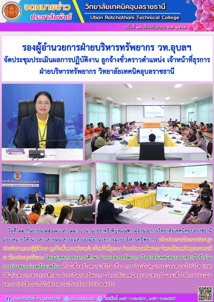 วันที่ ๑๒ กันยายน ๒๕๖๗ เวลา ๑๔.๐๐ น. นายธาตรี พิบูลมณฑา ผู้อำนวยการวิทยาลัยเทคนิคอุบลราชธานี มอบหมายให้ นางสาวสายฝน สาระผล รองผู้อำนวยการฝ่ายบริหารทรัพยากร เป็นประธานในการประชุมประเมินผลการปฏิบัติงาน ลูกจ้างชั่วคราวตำแหน่ง เจ้าหน้าที่ธุรการ ฝ่ายบริหารทรัพยากร วิทยาลัยเทคนิคอุบลราชธานี ณ ห้องประชุมบัวแดง โดยมีบุคลากรทางการศึกษา ฝ่ายบริหารทรัพยากร วิทยาลัยเทคนิคอุบลราชธานี เข้าร่วมการประชุมอย่างพร้อมเพรียง ทั้งนี้เพื่อสร้างความรู้ ความเข้าใจ เรื่อง การประเมินคุณธรรมและความโปร่งใส (ITA) ให้แก่บุคลากรทางการศึกษา ฝ่ายบริหารทรัพยากร วิทยาลัยเทคนิคอุบลราชธานี และเพื่อให้การประเมินผลการปฏิบัติงานเป็นไปด้วยความเรียบร้อย โปร่งใส ต่อไป
