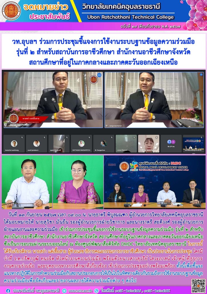 วันที่ ๑๓ กันยายน ๒๕๖๗ เวลา ๐๙.๐๐ น. นายธาตรี พิบูลมณฑา ผู้อำนวยการวิทยาลัยเทคนิคอุบลราชธานี ได้มอบหมายให้ นายสุวิชา มั่นยืน รองผู้อำนวยการฝ่ายวิชาการ และนางราตรี สะดีวงศ์ รองผู้อำนวยการฝ่ายแผนงานและความร่วมมือ เข้าร่วมการประชุมชี้แจงการใช้งานระบบฐานข้อมูลความร่วมมือ รุ่นที่ ๒ สำหรับสถาบันการอาชีวศึกษา สำนักงานอาชีวศึกษาจังหวัด สถานศึกษา ที่อยู่ในภาคกลาง และ ภาคตะวันออกเฉียงเหนือ ซึ่งเป็นการอบรมผ่านระบบออนไลน์ ณ ห้องศูนย์พัฒนาสื่อดิจิทัล DMDC วิทยาลัยเทคนิคอุบลราชธานี ในการนี้ได้รับเกียรติจาก นายสง่า เเต่เชื้อสาย ผู้ช่วยเลขาธิการคณะกรรมการการอาชีวศึกษา เป็นประธานในการประชุม โดยมี ว่าที่ ร.ต.กรีฑาวุฒิ ทนงจิต หัวหน้างานความร่วมมือ พร้อมด้วยนางสาวสุวรีย์ โสวะภาสน์ เจ้าหน้าที่ธุรการ งานความร่วมมือ และบุคลากรทางการศึกษาที่เกี่ยวข้อง เข้าร่วมการประชุมอย่างพร้อมเพรียง ทั้งนี้เพื่อชี้แจงแนวทางปฏิบัติในการทำความร่วมมือกับสถานประกอบการให้เป็นไปในทิศทางเดียวกันรวมถึงการใช้งานระบบฐานข้อมูลความร่วมมือเพื่อจัดเก็บและรายงานผลภายใต้ความร่วมมือต่าง ๆ ต่อไป