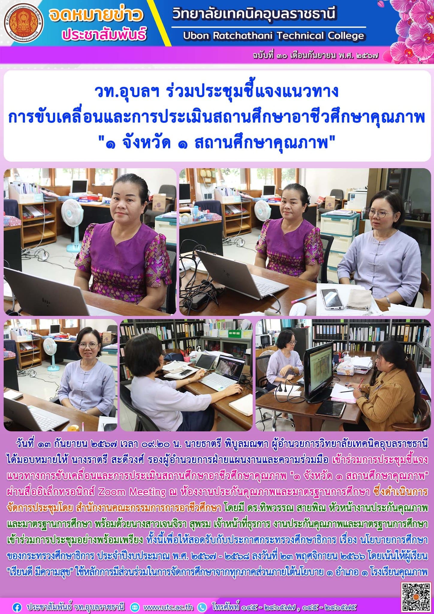 วันที่ ๑๓ กันยายน ๒๕๖๗ เวลา ๐๙.๒๐ น. นายธาตรี พิบูลมณฑา ผู้อำนวยการวิทยาลัยเทคนิคอุบลราชธานี ได้มอบหมายให้ นางราตรี สะดีวงศ์ รองผู้อำนวยการฝ่ายแผนงานและความร่วมมือ เข้าร่วมการประชุมชี้แจงแนวทางการขับเคลื่อนและการประเมินสถานศึกษาอาชีวศึกษาคุณภาพ “๑ จังหวัด ๑ สถานศึกษาคุณภาพ” ผ่านสื่ออิเล็กทรอนิกส์ Zoom Meeting ณ ห้องงานประกันคุณภาพและมาตรฐานการศึกษา ซึ่งดำเนินการจัดการประชุมโดยสำนักงานคณะกรรมการการอาชีวศึกษา โดยมี ดร.ทิพวรรณ สายพิณ หัวหน้างานประกันคุณภาพและมาตรฐานการศึกษา พร้อมด้วยนางสาวเจนจิรา สุพรม เจ้าหน้าที่ธุรการ งานประกันคุณภาพและมาตรฐานการศึกษา เข้าร่วมการประชุมอย่างพร้อมเพรียง ทั้งนี้เพื่อให้สอดรับกับประกาศกระทรวงศึกษาธิการ เรื่อง นโยบายการศึกษาของกระทรวงศึกษาธิการ ประจำปีงบประมาณ พ.ศ. ๒๕๖๗ – ๒๕๖๘ ลงวันที่ ๒๓ พฤศจิกายน ๒๕๖๖ โดยเน้นให้ผู้เรียน “เรียนดี มีความสุข” ใช้หลักการมีส่วนร่วมในการจัดการศึกษาจากทุกภาคส่วนภายใต้นโยบาย ๑ อำเภอ ๑ โรงเรียนคุณภาพ