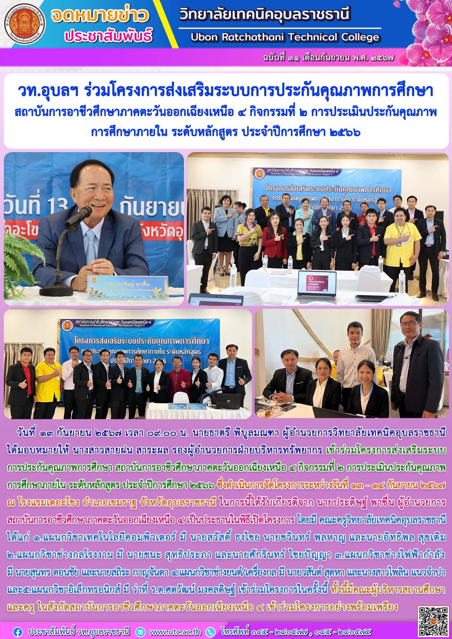 วันที่ ๑๓ กันยายน ๒๕๖๗ เวลา ๐๙.๐๐ น. นายธาตรี พิบูลมณฑา ผู้อำนวยการวิทยาลัยเทคนิคอุบลราชธานี ได้มอบหมายให้ นางสาวสายฝน สาระผล รองผู้อำนวยการฝ่ายบริหารทรัพยากร เข้าร่วมโครงการส่งเสริมระบบการประกันคุณภาพการศึกษา สถาบันการอาชีวศึกษาภาคตะวันออกเฉียงเหนือ ๔ กิจกรรมที่ ๒ การประเมินประกันคุณภาพการศึกษาภายใน ระดับหลักสูตร ประจำปีการศึกษา ๒๕๖๖ ซึ่งดำเนินการจัดโครงการระหว่างวันที่ ๑๓ – ๑๔ กันยายน ๒๕๖๗ ณ โรงแรมเดอะโขง อำเภอเขมราฐ จังหวัดอุบลราชธานี ในการนี้ได้รับเกียรติจาก นายประดิษฐ์ พาชื่น ผู้อำนวยการสถาบันการอาชีวศึกษาภาคตะวันออกเฉียงเหนือ ๔ เป็นประธานในพิธีเปิดโครงการ โดยมี คณะครูวิทยาลัยเทคนิคอุบลราชธานี ได้แก่ ๑.แผนกวิชาเทคโนโลยีคอมพิวเตอร์ มี นายสวัสดิ์ ธงไชย นายชวินทร์ พลหาญ และนายอิทธิพล สุขเติม ๒.แผนกวิชาช่างกลโรงงาน มี นายชนะ สุทธิประภา และนายศักรินทร์ ไชยปัญญา ๓.แผนกวิชาช่างไฟฟ้ากำลัง มี นายสุนทร ดอนชัย และนายสถิระ กาญจันดา ๔.แผนกวิชาช่างยนต์/เครื่องกล มี นายวสันต์ สุดหา และนางสาวไพลิน แนวจำปา และ๕.แผนกวิชาอิเล็กทรอนิกส์ มี ว่าที่ ร.ต.ศตวัฒน์ มงคลดิษฐ์ เข้าร่วมโครงการในครั้งนี้ ทั้งนี้มีคณะผู้บริหารสถานศึกษา ครู ในสังกัดสถาบันการอาชีวศึกษาภาคตะวันออกเฉียงเหนือ ๔ เข้าร่วมโครงการอย่างพร้อมเพรียง