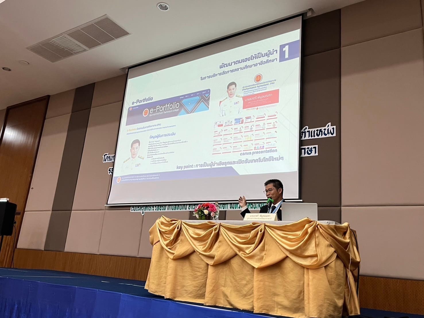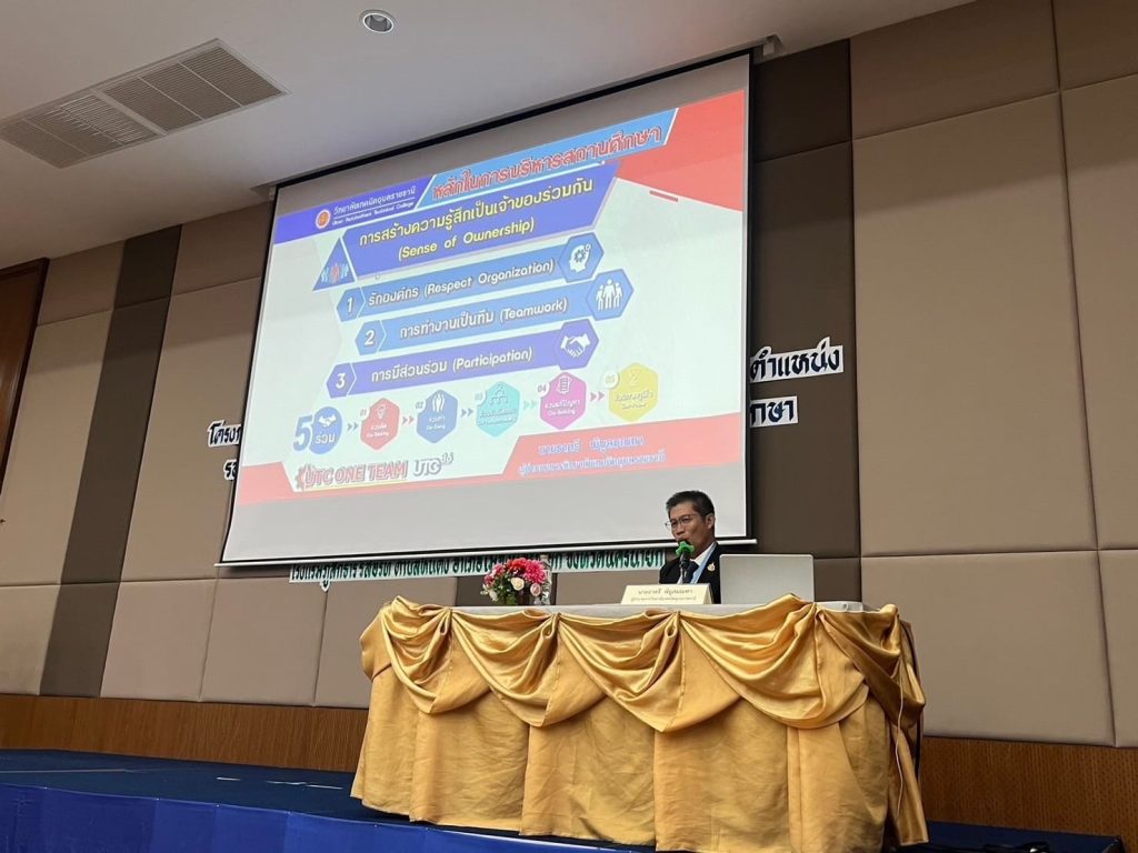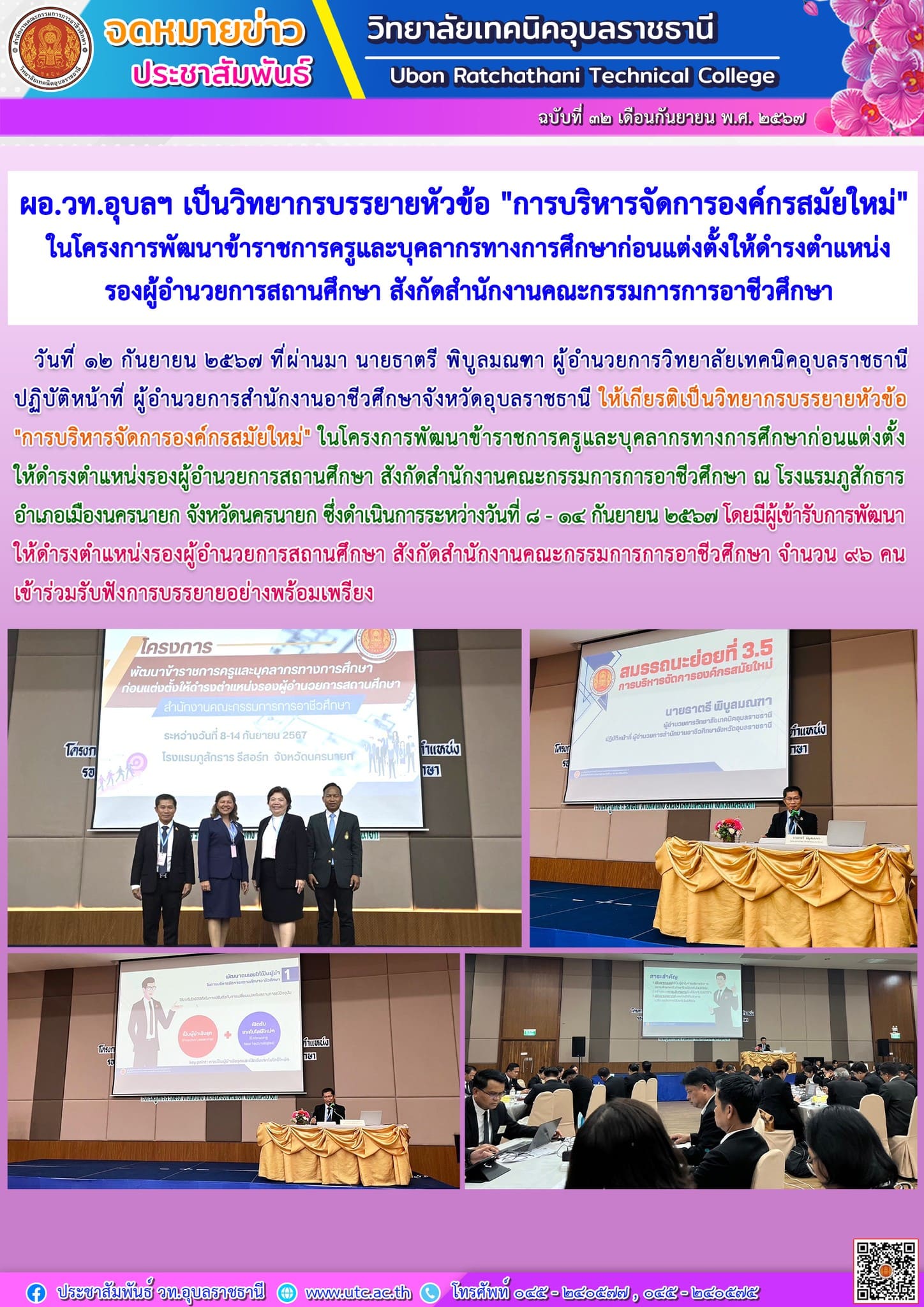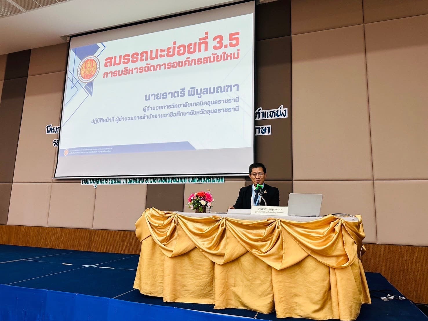 วันที่ ๑๒ กันยายน ๒๕๖๗ ที่ผ่านมา นายธาตรี พิบูลมณฑา ผู้อำนวยการวิทยาลัยเทคนิคอุบลราชธานี ปฏิบัติหน้าที่ ผู้อำนวยการสำนักงานอาชีวศึกษาจังหวัดอุบลราชธานี ให้เกียรติเป็นวิทยากรบรรยายหัวข้อ “การบริหารจัดการองค์กรสมัยใหม่” ในโครงการพัฒนาข้าราชการครูและบุคลากรทางการศึกษาก่อนแต่งตั้งให้ดำรงตำแหน่งรองผู้อำนวยการสถานศึกษา สังกัดสำนักงานคณะกรรมการการอาชีวศึกษา ณ โรงแรมภูสักธาร อำเภอเมืองนครนายก จังหวัดนครนายก ซึ่งดำเนินการระหว่างวันที่ ๘ – ๑๔ กันยายน ๒๕๖๗ โดยมีผู้เข้ารับการพัฒนา ให้ดำรงตำแหน่งรองผู้อำนวยการสถานศึกษา สังกัดสำนักงานคณะกรรมการการอาชีวศึกษา จำนวน ๙๖ คน เข้าร่วมรับฟังการบรรยายอย่างพร้อมเพรียง