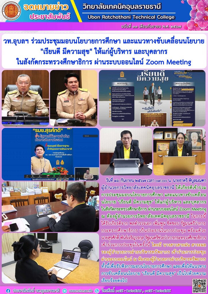 วันที่ ๑๖ กันยายน ๒๕๖๗ เวลา ๐๙.๐๐ น. นายธาตรี พิบูลมณฑา ผู้อำนวยการวิทยาลัยเทคนิคอุบลราชธานี ให้เกียรติเข้าร่วมการประชุมมอบนโยบายการศึกษา และแนวทางขับเคลื่อนนโยบาย “เรียนดี มีความสุข” ให้แก่ผู้บริหาร และบุคลากรในสังกัดกระทรวงศึกษาธิการ ผ่านระบบออนไลน์ Zoom Meeting ณ ห้องผู้อำนวยการวิทยาลัยเทคนิคอุบลราชธานี ในการนี้ได้รับเกียรติจาก พลตำรวจเอก เพิ่มพูน ชิดชอบ รัฐมนตรีว่าการกระทรวงศึกษาธิการ เป็นประธานในการประชุม พร้อมด้วยนายสุรศักดิ์ พันธ์เจริญวรกุล รัฐมนตรีช่วยว่าการกระทรวงศึกษาธิการ เข้าร่วมการประชุมในครั้งนี้ โดยมี นางสาวสายฝน สาระผล รองผู้อำนวยการฝ่ายบริหารทรัพยากร เข้าร่วมการประชุมผ่านระบบออนไลน์ ณ ห้องรองผู้อำนวยการฝ่ายบริหารทรัพยากร ทั้งนี้เพื่อรับฟังการมอบนโยบายการศึกษา และเพื่อให้แนวทางการขับเคลื่อนนโยบาย “เรียนดี มีความสุข” เป็นไปด้วยความเรียบร้อยต่อไป