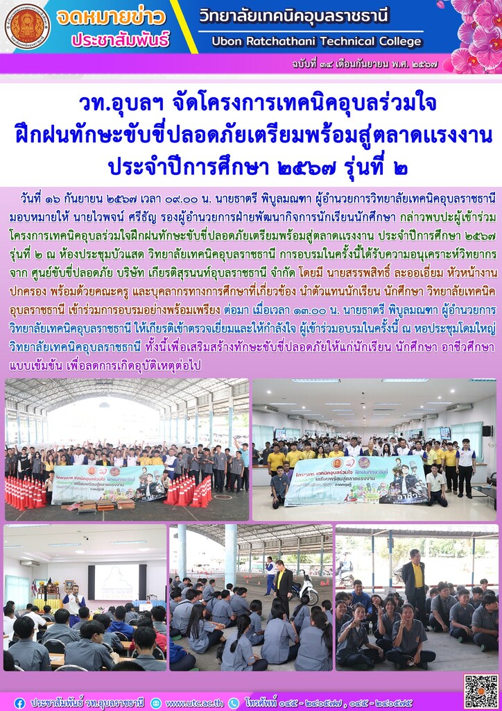 วันที่ ๑๖ กันยายน ๒๕๖๗ เวลา ๐๙.๐๐ น. นายธาตรี พิบูลมณฑา ผู้อำนวยการวิทยาลัยเทคนิคอุบลราชธานี มอบหมายให้ นายไวพจน์ ศรีธัญ รองผู้อำนวยการฝ่ายพัฒนากิจการนักเรียนนักศึกษา กล่าวพบปะผู้เข้าร่วมโครงการเทคนิคอุบลร่วมใจฝึกฝนทักษะขับขี่ปลอดภัยเตรียมพร้อมสู่ตลาดเเรงงาน ประจำปีการศึกษา ๒๕๖๗ รุ่นที่ ๒ ณ ห้องประชุมบัวแสด วิทยาลัยเทคนิคอุบลราชธานี การอบรมในครั้งนี้ได้รับความอนุเคราะห์วิทยากรจาก ศูนย์ขับขี่ปลอดภัย บริษัท เกียรติสุรนนท์อุบลราชธานี จำกัด โดยมี นายสรรพสิทธิ์ ละออเอี่ยม หัวหน้างานปกครอง พร้อมด้วยคณะครู และบุคลากรทางการศึกษาที่เกี่ยวข้อง นำตัวแทนนักเรียน นักศึกษา วิทยาลัยเทคนิคอุบลราชธานี เข้าร่วมการอบรมอย่างพร้อมเพรียง ต่อมา เมื่อเวลา ๑๓.๐๐ น. นายธาตรี พิบูลมณฑา ผู้อำนวยการวิทยาลัยเทคนิคอุบลราชธานี ให้เกียรติเข้าตรวจเยี่ยมและให้กำลังใจ ผู้เข้าร่วมอบรมในครั้งนี้ ณ หอประชุมโดมใหญ่วิทยาลัยเทคนิคอุบลราชธานี ทั้งนี้เพื่อเสริมสร้างทักษะขับขี่ปลอดภัยให้แก่นักเรียน นักศึกษา อาชีวศึกษา แบบเข้มข้น เพื่อลดการเกิดอุบัติเหตุต่อไป