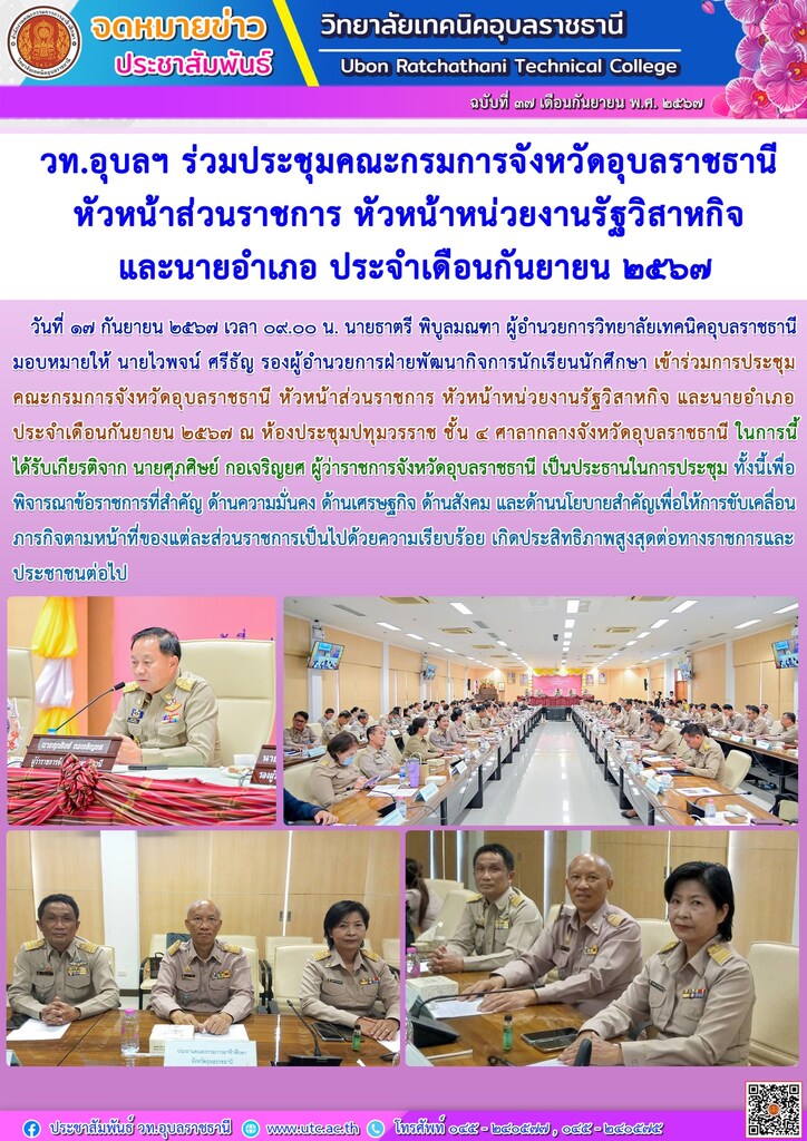 วันที่ ๑๗ กันยายน ๒๕๖๗ เวลา ๐๙.๐๐ น. นายธาตรี พิบูลมณฑา ผู้อำนวยการวิทยาลัยเทคนิคอุบลราชธานีมอบหมายให้ นายไวพจน์ ศรีธัญ รองผู้อำนวยการฝ่ายพัฒนากิจการนักเรียนนักศึกษา เข้าร่วมการประชุมคณะกรมการจังหวัดอุบลราชธานี หัวหน้าส่วนราชการ หัวหน้าหน่วยงานรัฐวิสาหกิจ และนายอำเภอ ประจำเดือนกันยายน ๒๕๖๗ ณ ห้องประชุมปทุมวรราช ชั้น ๔ ศาลากลางจังหวัดอุบลราชธานี ในการนี้ได้รับเกียรติจาก นายศุภศิษย์ กอเจริญยศ ผู้ว่าราชการจังหวัดอุบลราชธานี เป็นประธานในการประชุม ทั้งนี้เพื่อพิจารณาข้อราชการที่สำคัญ ด้านความมั่นคง ด้านเศรษฐกิจ ด้านสังคม และด้านนโยบายสำคัญเพื่อให้การขับเคลื่อนภารกิจตามหน้าที่ของแต่ละส่วนราชการเป็นไปด้วยความเรียบร้อย เกิดประสิทธิภาพสูงสุดต่อทางราชการและประชาชนต่อไป