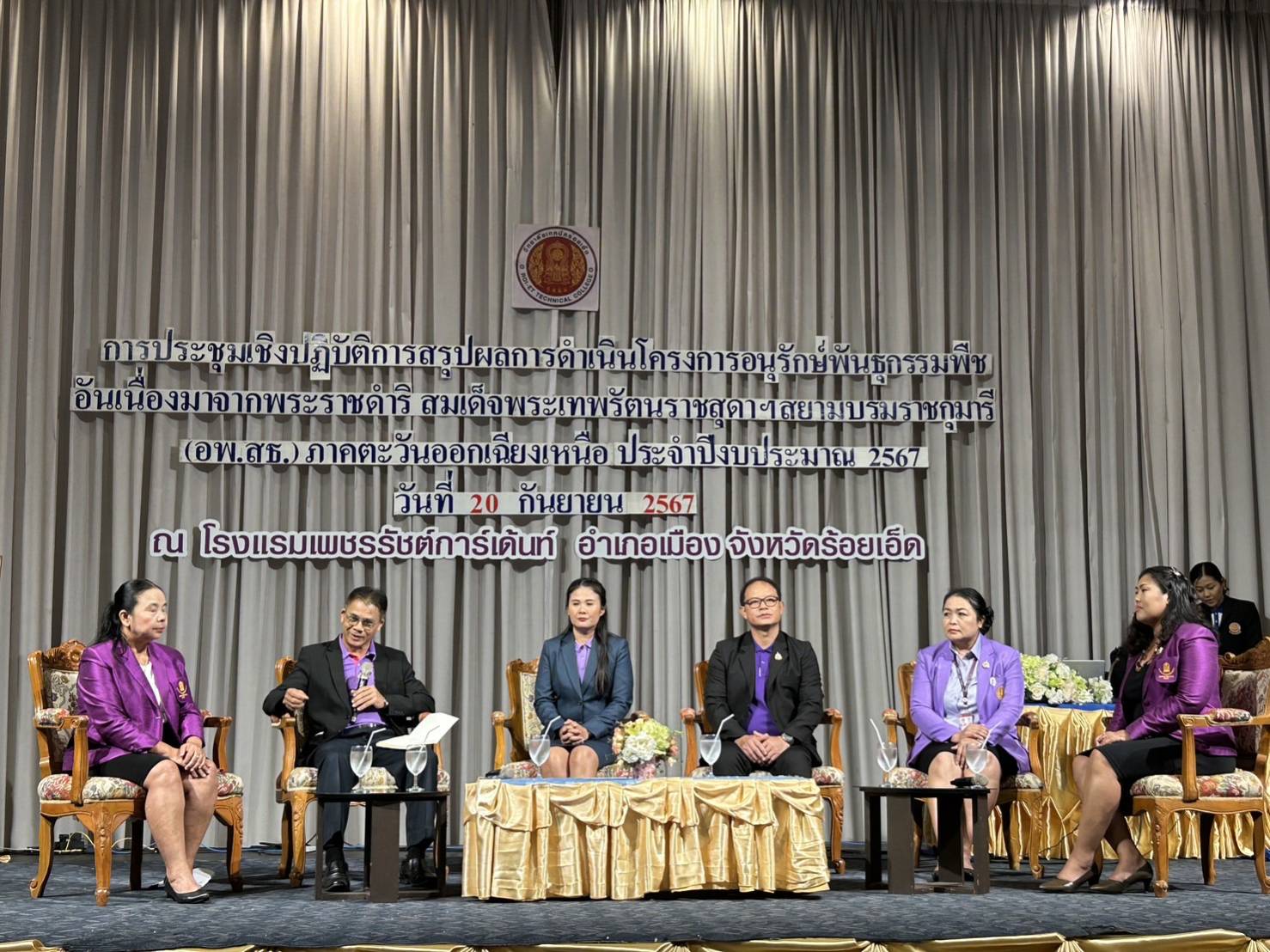 วันที่ ๒๐ กันยายน ๒๕๖๗ เวลา ๐๙.๐๐ น. นายธาตรี พิบูลมณฑา ผู้อำนวยการวิทยาลัยเทคนิคอุบลราชธานี มอบหมายให้ นางมนัสนันท์ ไทยแท้ หัวหน้างานสวนพฤกษศาสตร์โรงเรียน และนางสาวพิมพิไล วุ่นอภัย ครูแผนกวิชาสามัญสัมพันธ์ เข้าร่วมการประชุมเชิงปฏิบัติการสรุปผลการดำเนินงานโครงการอนุรักษ์พันธุกรรมพืชอันเนื่องมาจากพระราชดำริ สมเด็จพระเทพรัตนราชสุดาฯ สยามบรมราชกุมารี ประจำปีงบประมาณ พ.ศ. ๒๕๖๗ (ภาคตะวันออกเฉียงเหนือ) ทั้งนี้ได้รับเกียรติจาก นายอาคม จันทร์นาม ผู้อำนวยการวิทยาลัยเทคนิคร้อยเอ็ด ปฏิบัติหน้าที่ ผู้อำนวยการสำนักงานอาชีวศึกษาจังหวัดร้อยเอ็ด ประธานคณะอนุกรรมการดำเนินงานภาคตะวันออกเฉียงเหนือ เป็นประธานในพิธีเปิดการประชุม ณ โรงแรมเพชรรัชต์การ์เด้นท์ จังหวัดร้อยเอ็ด