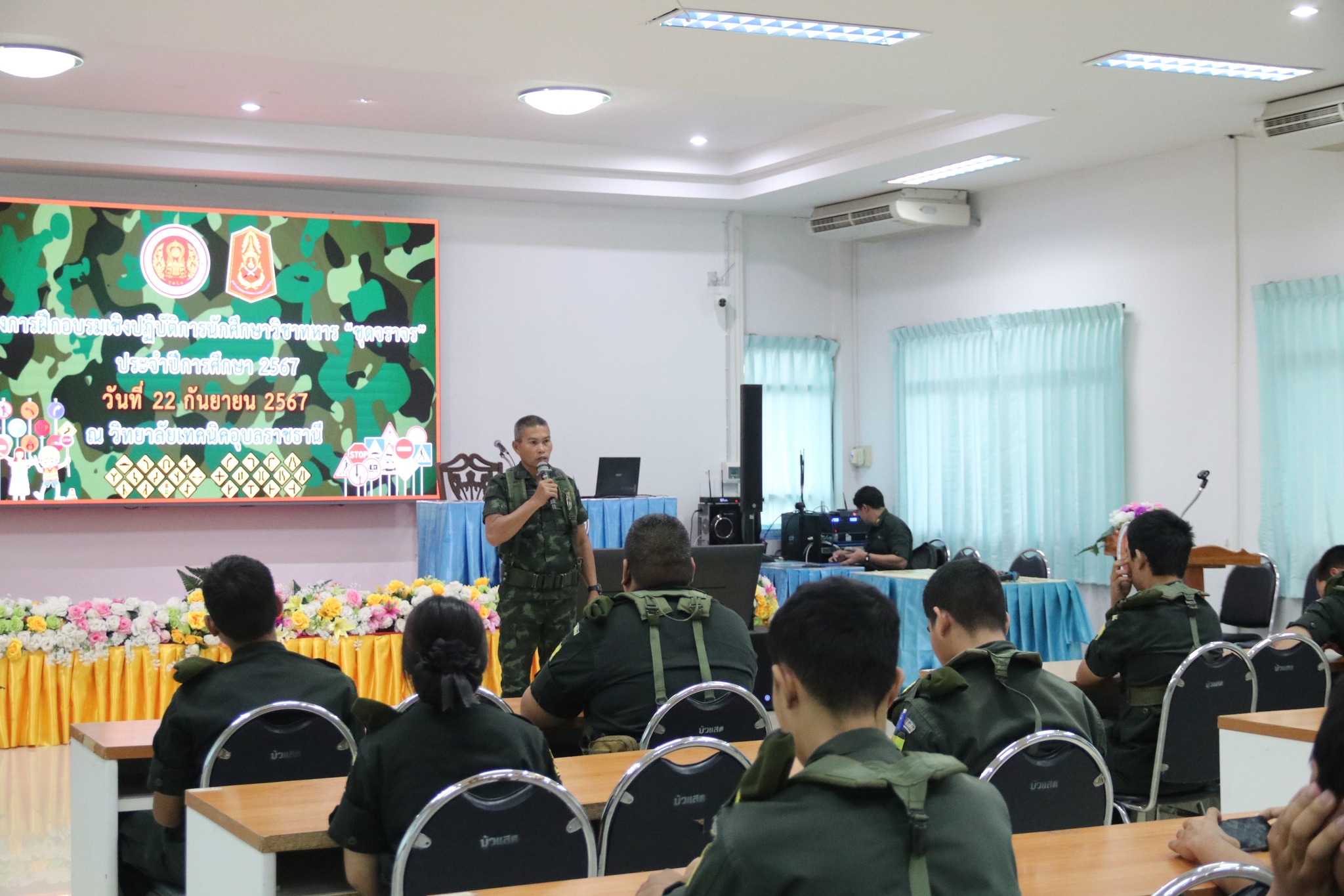 วันที่ ๒๒ กันยายน ๒๕๖๗ เวลา ๐๙.๐๐ น. นายธาตรี พิบูลมณฑา ผู้อำนวยการวิทยาลัยเทคนิคอุบลราชธานี ได้มอบหมายให้ นายไวพจน์ ศรีธัญ รองผู้อำนวยการฝ่ายพัฒนากิจการนักเรียนนักศึกษา เป็นประธานในพิธีเปิดโครงการอบรมนักศึกษาวิชาทหาร “ชุดตรวจวินัย” ชั้นปีที่ ๒ และชั้นปีที่ ๓ ประจำปีการศึกษา ๒๕๖๗ ณ ห้องประชุมบัวแสด วิทยาลัยเทคนิคอุบลราชธานี ในการนี้ได้รับความอนุเคราะห์วิทยากรจาก จ่าสิบโท จิรภัทร พรมผล ผู้ช่วยครูหน่วยฝึก ศูนย์การฝึกนักศึกษาวิชาทหาร มณฑลทหารบกที่ ๒๒ โดยมี ว่าที่ ร.ต.ขวัญชัย เนืองเนตร ครูที่ปรึกษาชมรมนักศึกษาวิชาทหาร พร้อมด้วยคณะครูผู้ช่วยครูที่ปรึกษาชมรมนักศึกษาวิชาทหาร นำนักศึกษาวิชาทหาร วิทยาลัยเทคนิคอุบลราชธานี จำนวน ๕๐ นาย เข้าร่วมพิธีอย่างพร้อมเพรียง ทั้งนี้เพื่อฝึกความมีระเบียบวินัย ความมีจิตสาธารณะ รู้จักช่วยเหลือผู้อื่น ของนักศึกษาวิชาทหาร วิทยาลัยเทคนิคอุบลราชธานี และเพื่อปลูกจิตสำนึกให้นักศึกษาวิชาทหาร ได้มีความรัก ความเสียสละเพื่อชาติ ศาสนา และพระมหากษัตริย์ อีกด้วย